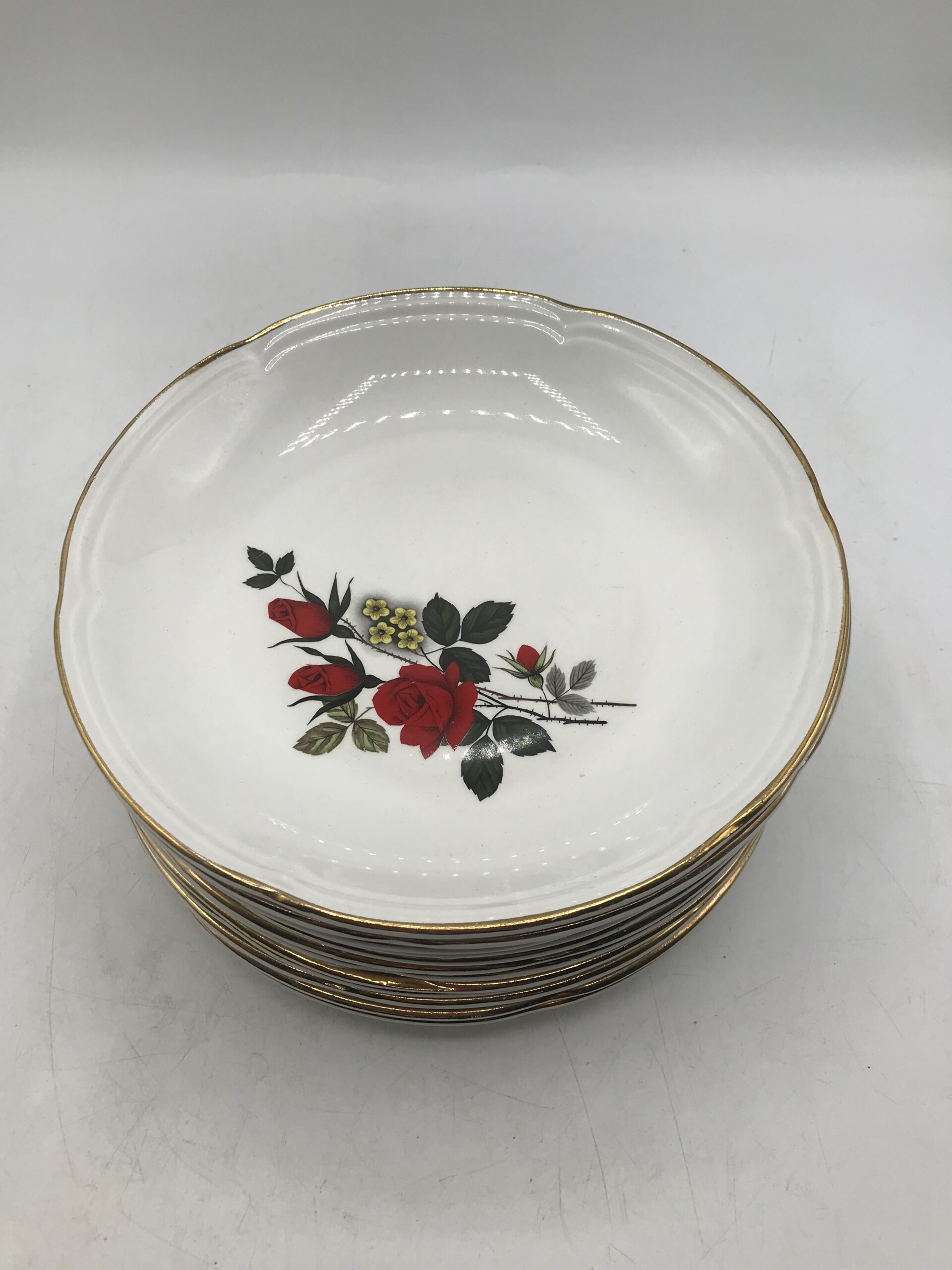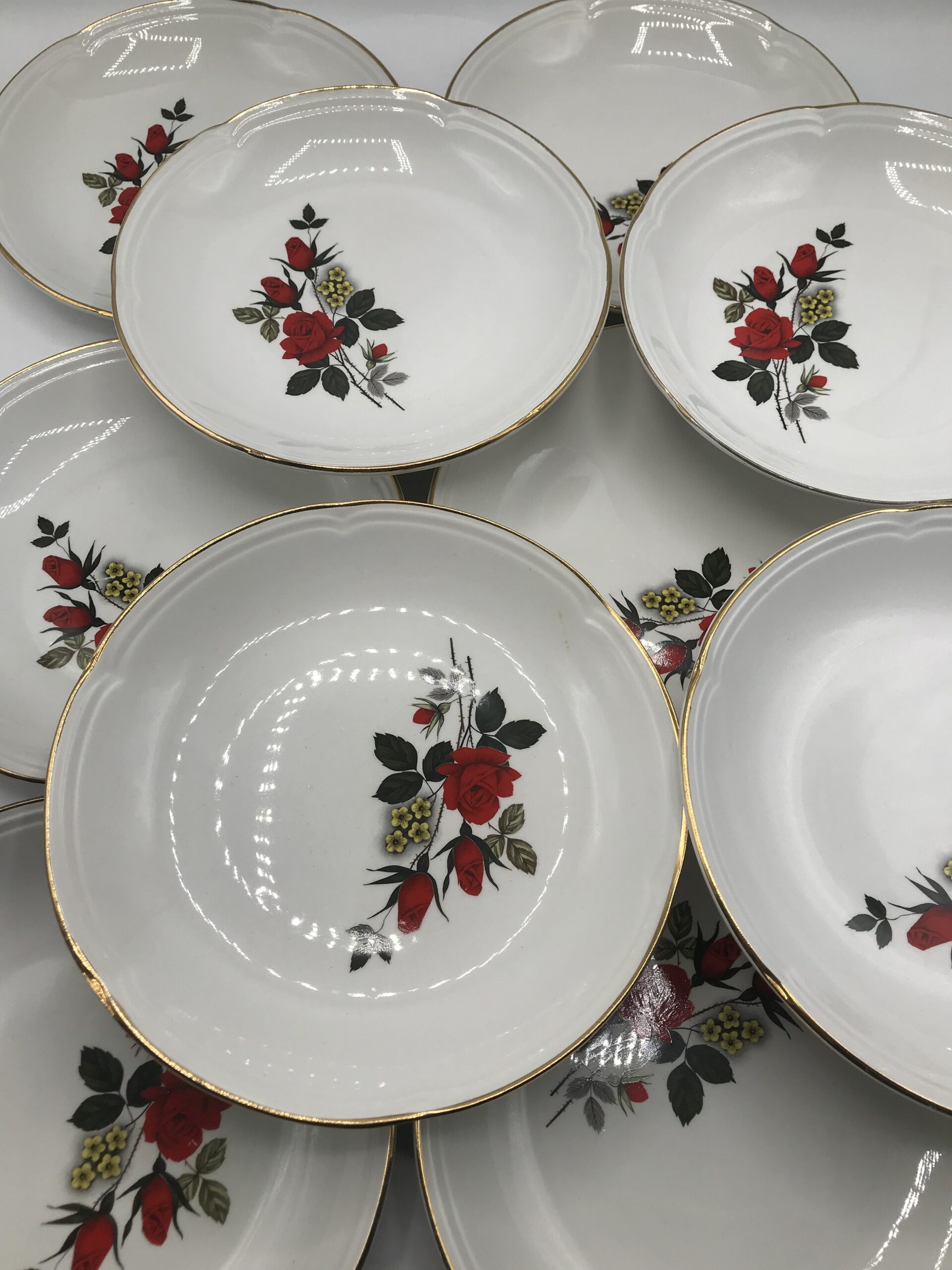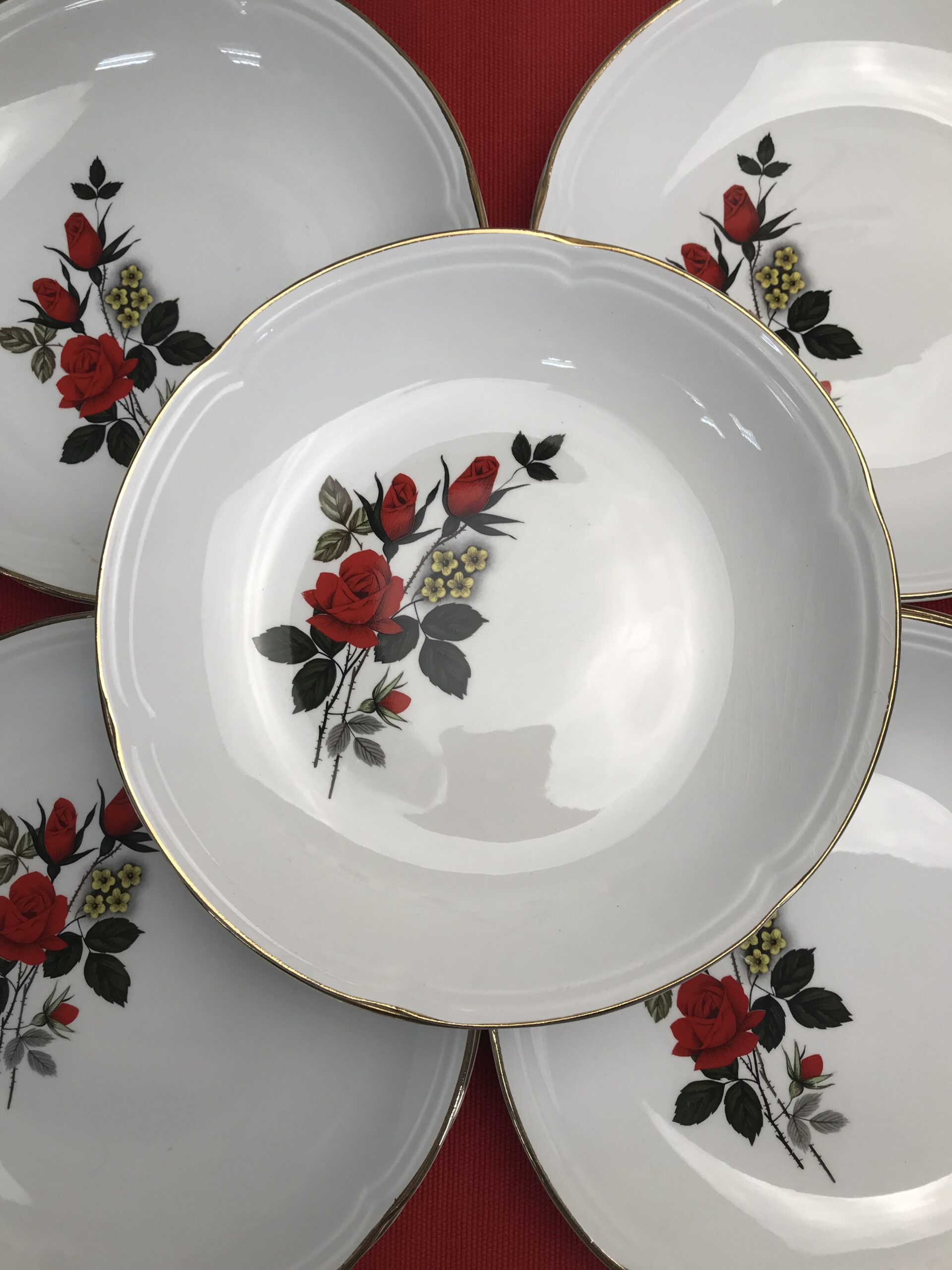 Alerte pépite !!! 12 assiettes creuses Moulin des loups. Magnifique service en faïence blanche estampillé Moulin des Loups Orchies. Le service fait partie de la collection « Carmen ». Il est décoré d’un magnifique motif de roses rouges, de petites fleurs jaunes et de liserés dorés. les assiettes ont un diamètre de 21 cm pour une hauteur de 3 cm. Elle sont en bon état pas d’éclat quelques légères marques d’usure. De la vaisselle signée comme on l’aime. Simple, belle, ancienne, signée et remarquable. Avis aux amateurs de belles tables.
