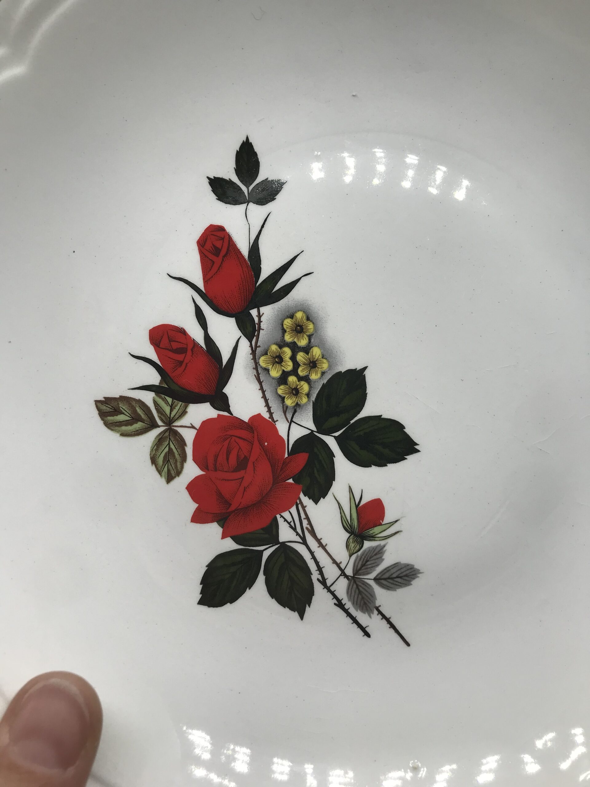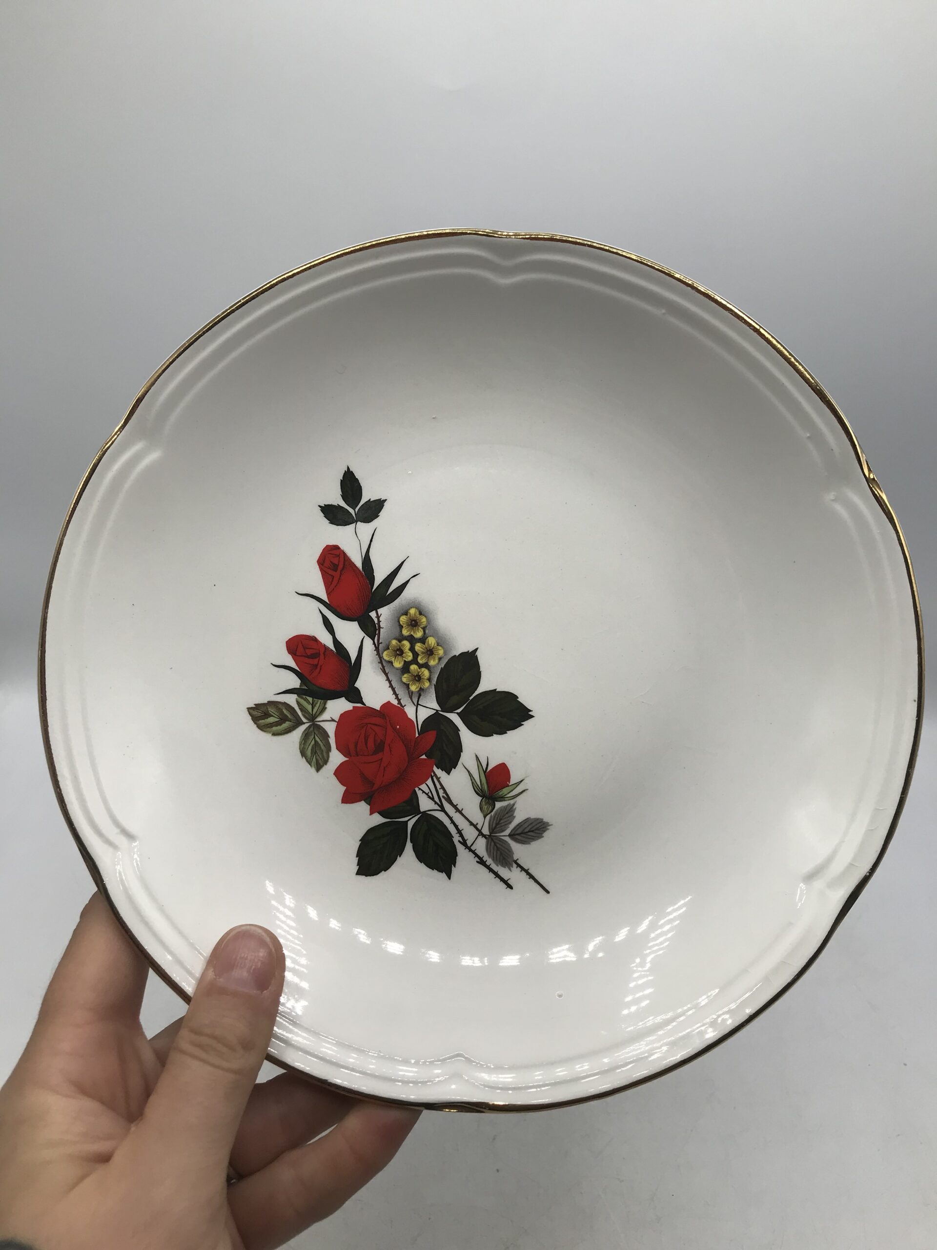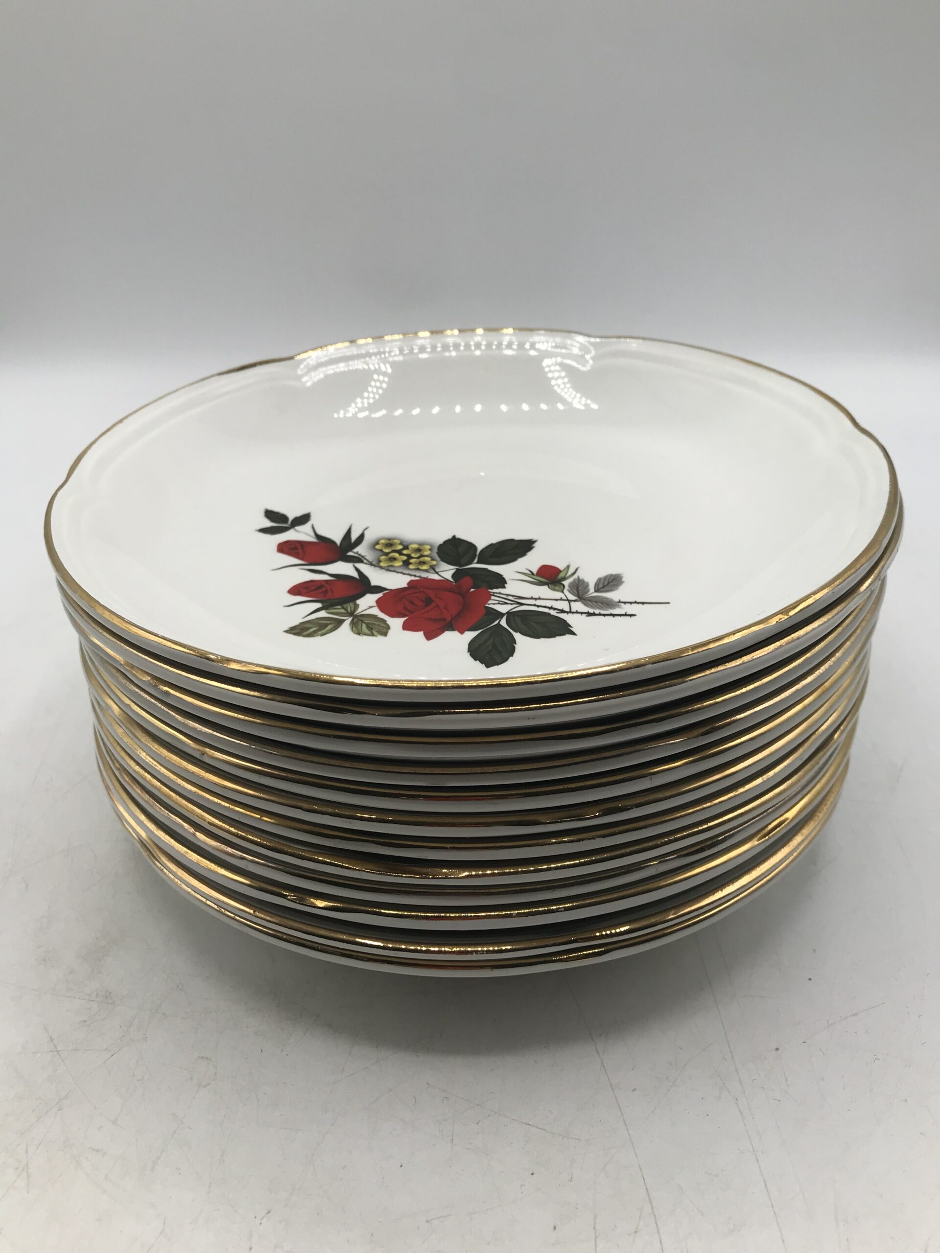 Alerte pépite !!! 12 assiettes creuses Moulin des loups. Magnifique service en faïence blanche estampillé Moulin des Loups Orchies. Le service fait partie de la collection « Carmen ». Il est décoré d’un magnifique motif de roses rouges, de petites fleurs jaunes et de liserés dorés. les assiettes ont un diamètre de 21 cm pour une hauteur de 3 cm. Elle sont en bon état pas d’éclat quelques légères marques d’usure. De la vaisselle signée comme on l’aime. Simple, belle, ancienne, signée et remarquable. Avis aux amateurs de belles tables.