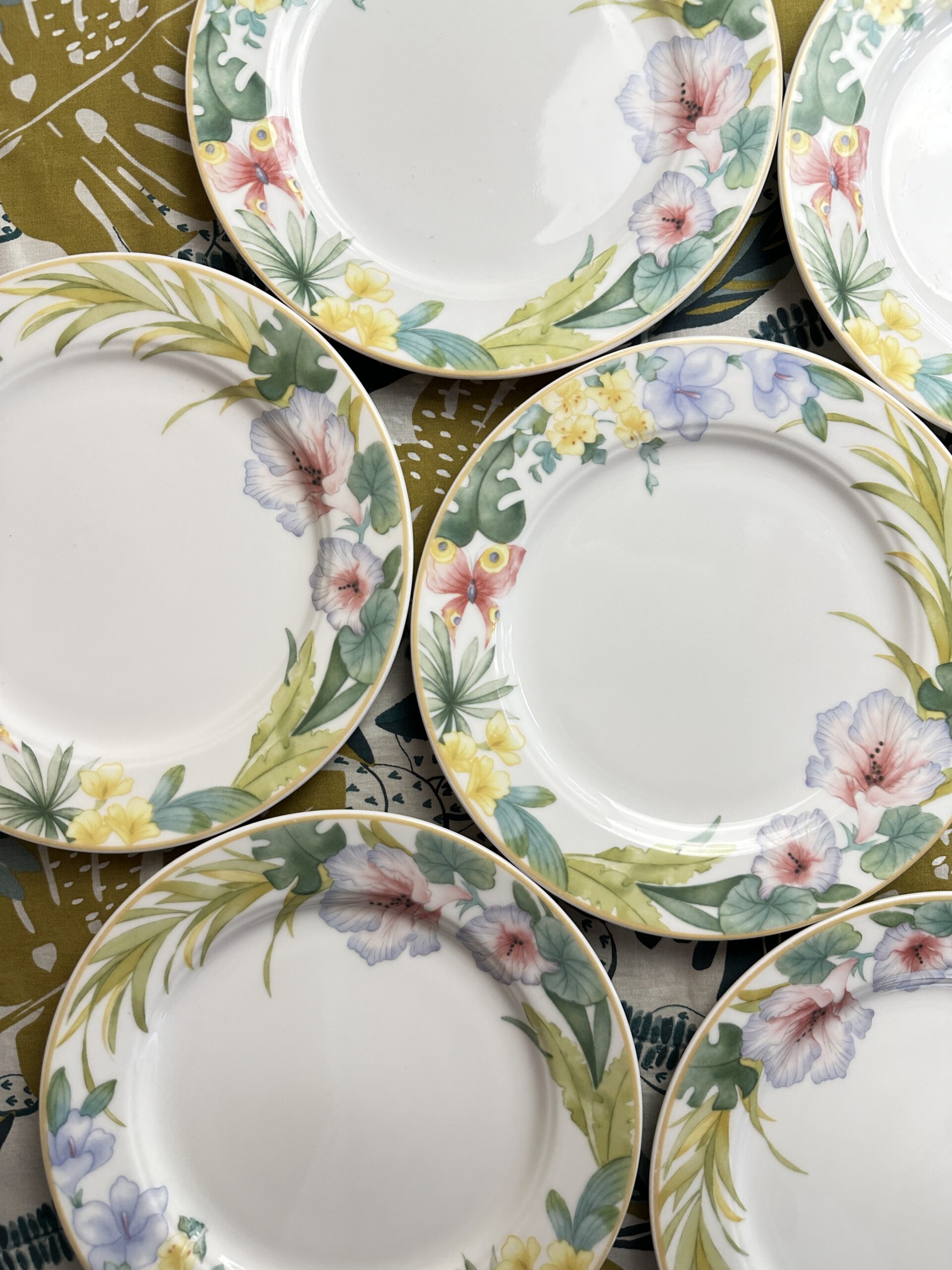 On craque complètement pour ce lot de 6 assiettes à dessert Exotica Villeroy & Boch. Avec leurs motifs de plantes tropicales sur le pourtour des assiettes et leurs coloris vert, jaune, orange.