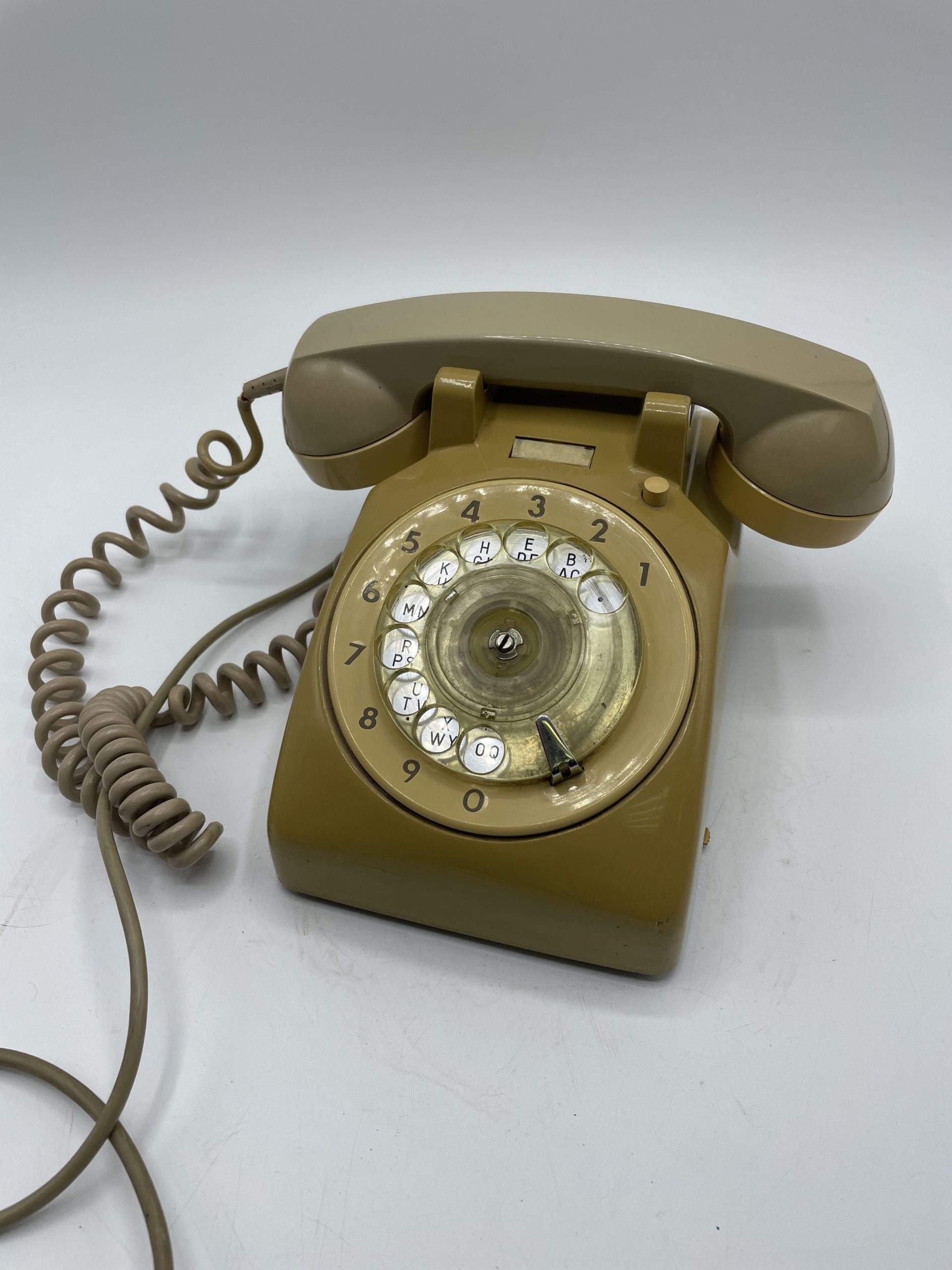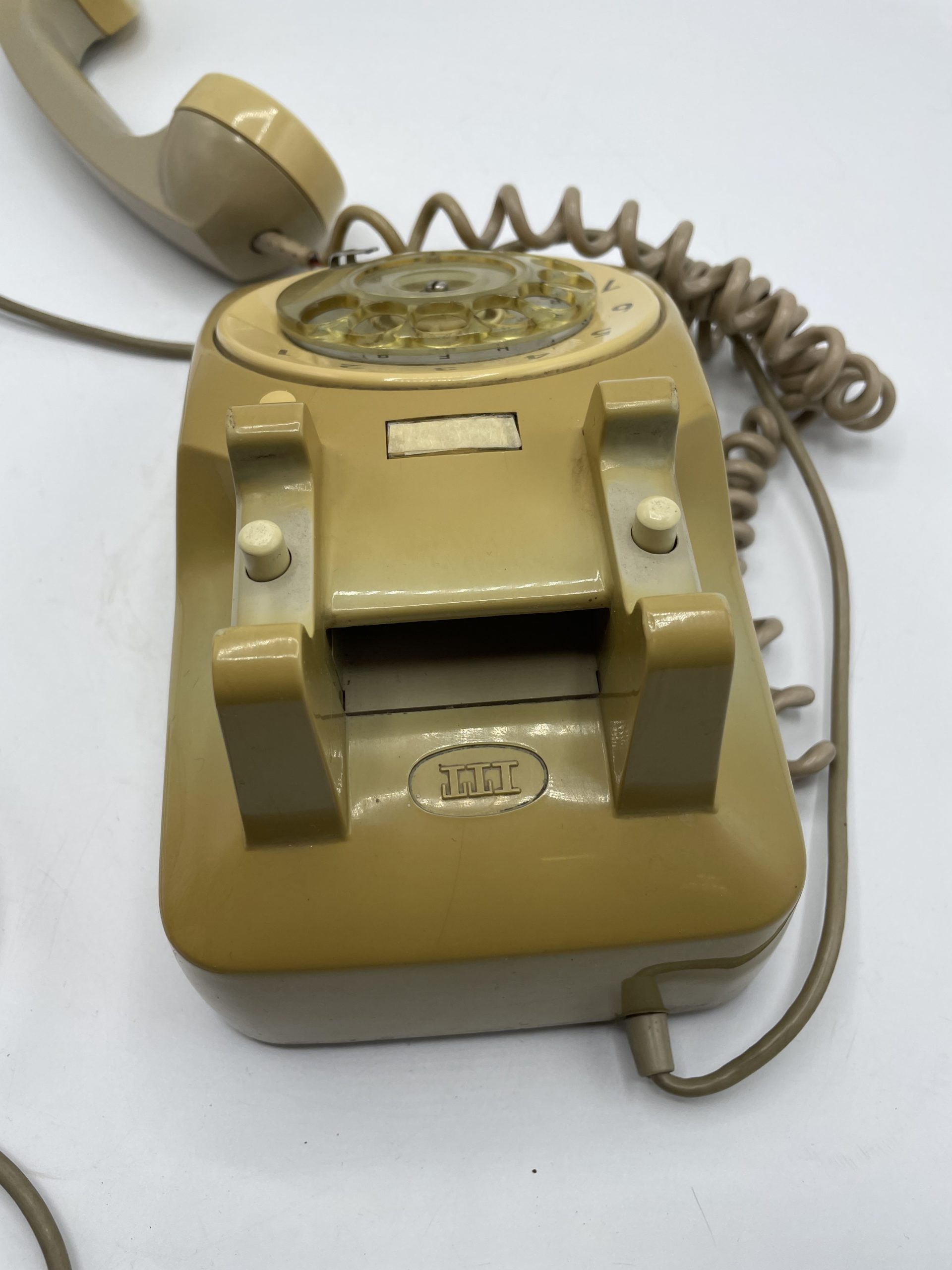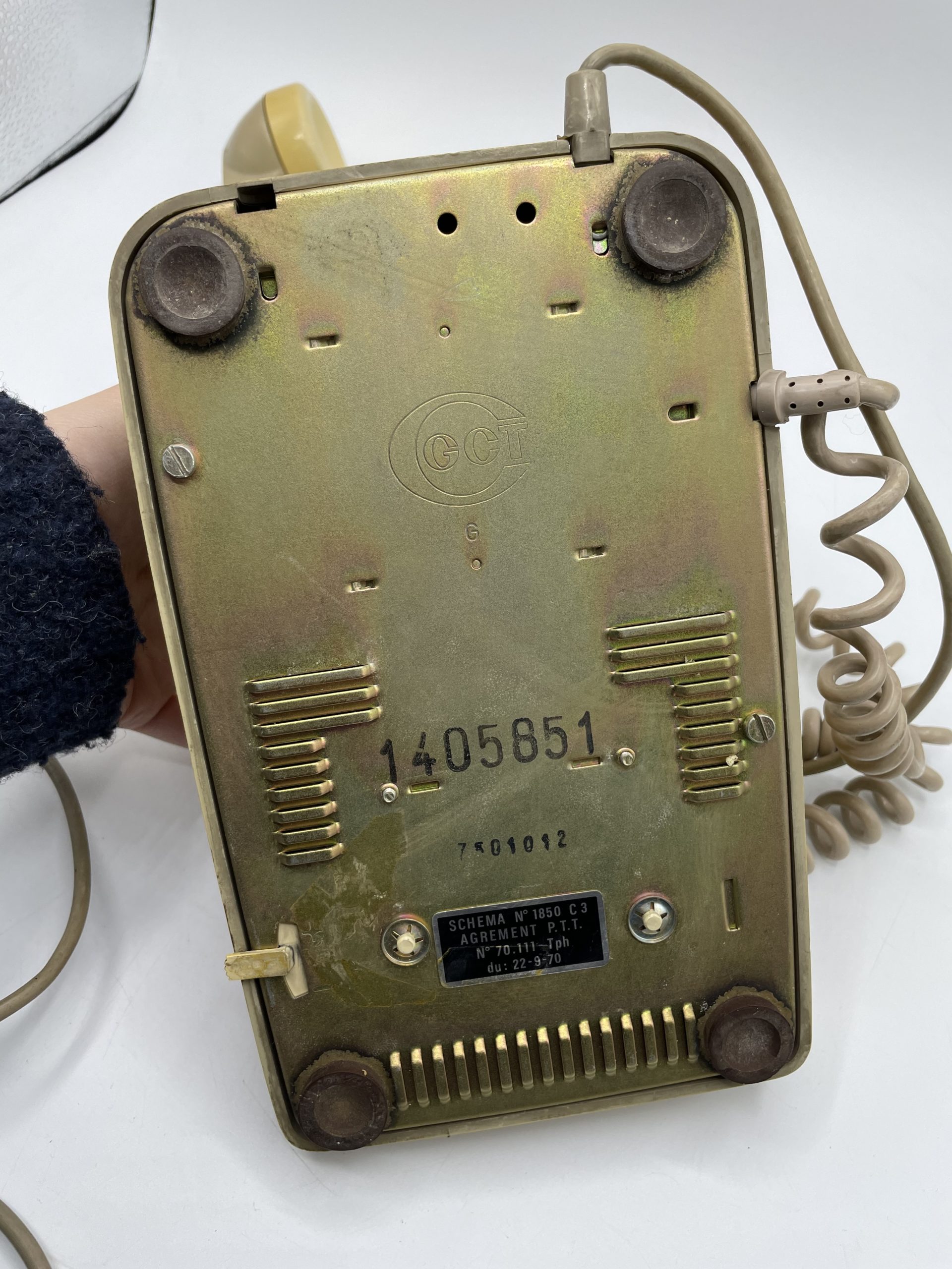 Amoureux d’objet vintage, cet ancien téléphone à cadran saura vous séduire. De couleur beige, ce téléphone est un téléphone CGT ITT. Vintage des années 60 70, des traces d’usure sont à prévoir et les fils du combiné sont dénudés à la base du combiné (cf photos) jolies marques du temps passé. Un joli téléphone hyper rétro qu’on adore !