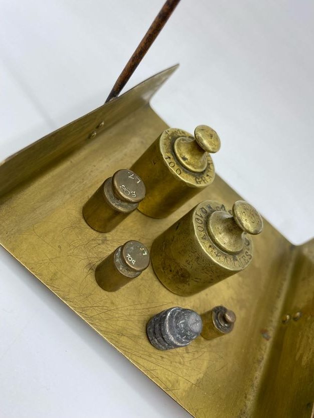 Amoureux de vintage et collectionneur d’objets anciens, ce joli trébuchet à colonne ne vous laissera pas indifférent ! En bois, bronze et laiton, ce trébuchet était une balance ancienne qui servait à la pèse de minerais et d’or. Sur le socle, on retrouve une masse de 200gr, 2 masses de 100gr, 1 masse de 50gr, 1 masse de 20gr et une masse de 5gr. Un petit compartiment présent dans le socle renferme 5 petites masses de 3 et 5 gr. Vintage, des traces d’usure sont à prévoir (cf photos) jolies marques du temps passé. Une jolie balance vintage de collection pour une déco qui rappelle les cabinets d’apothicaires et de curiosités !