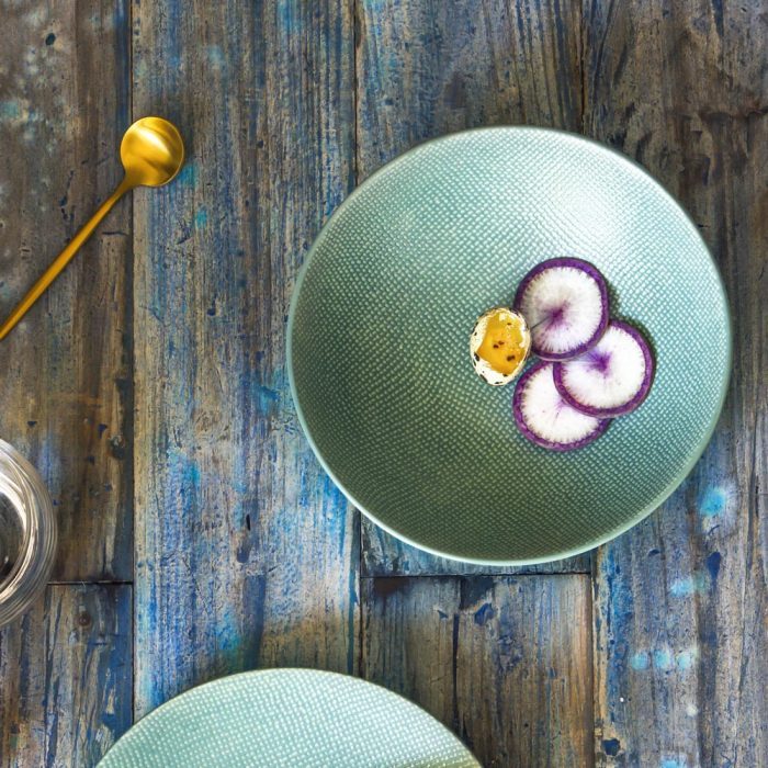 En effet, la collection Vésuvio se décline en plusieurs coloris tout de grès vêtus. En outre, l’aspect satiné de l’Assiette creuse Vésuvio Bleu – Table Passion et ses motifs en reliefs donnent du caractère à cette collection.