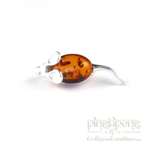 Cette broche fantaisie est en forme de souris en ambre cognac et monture en argent 925 massif.