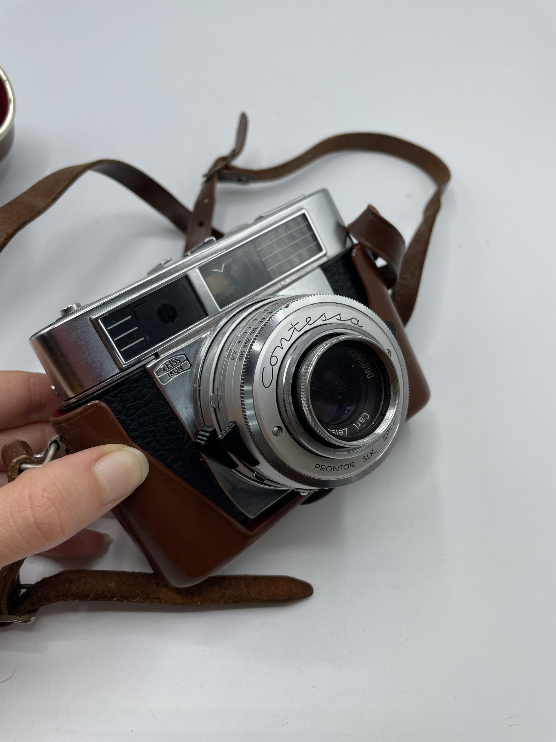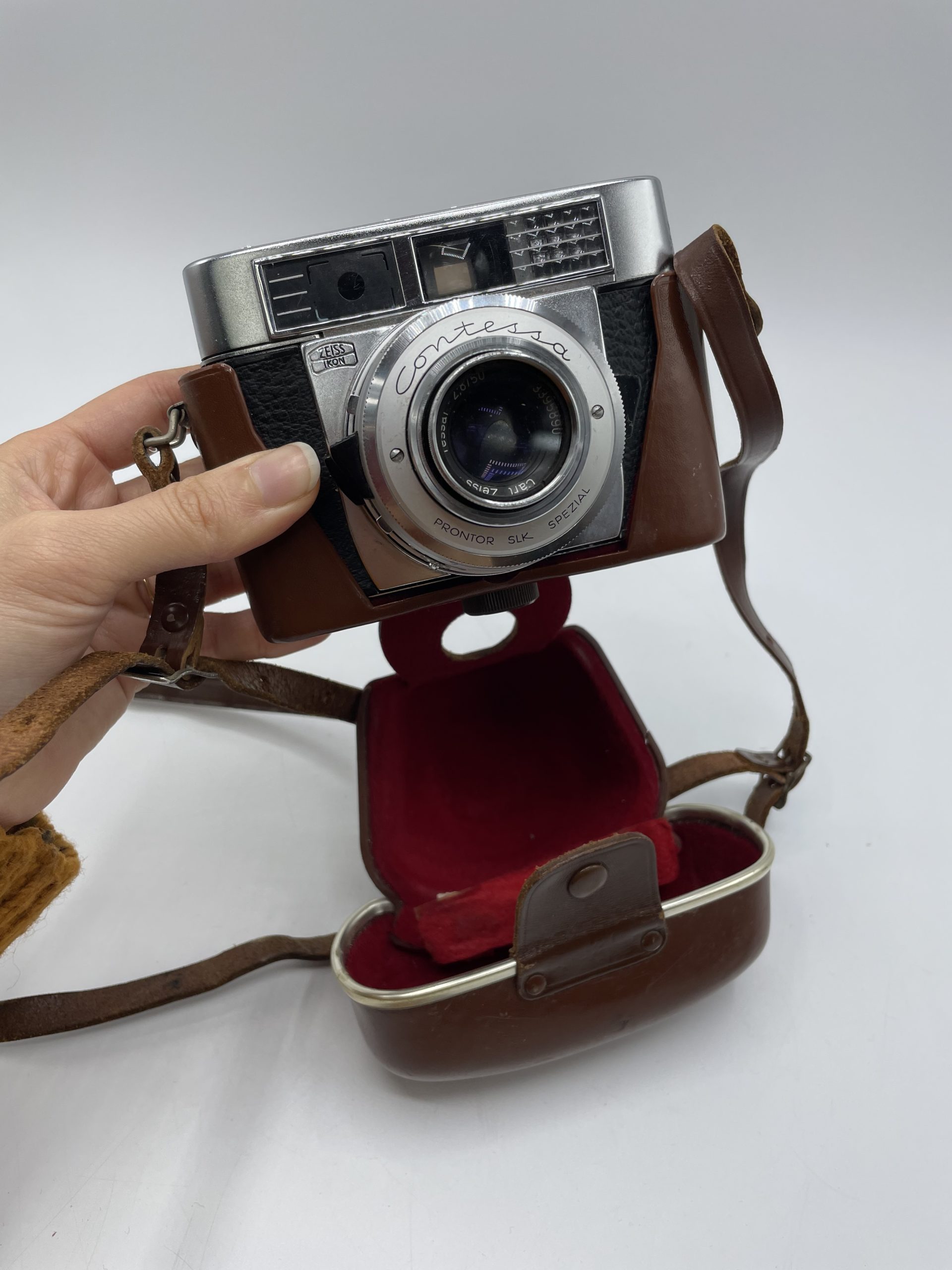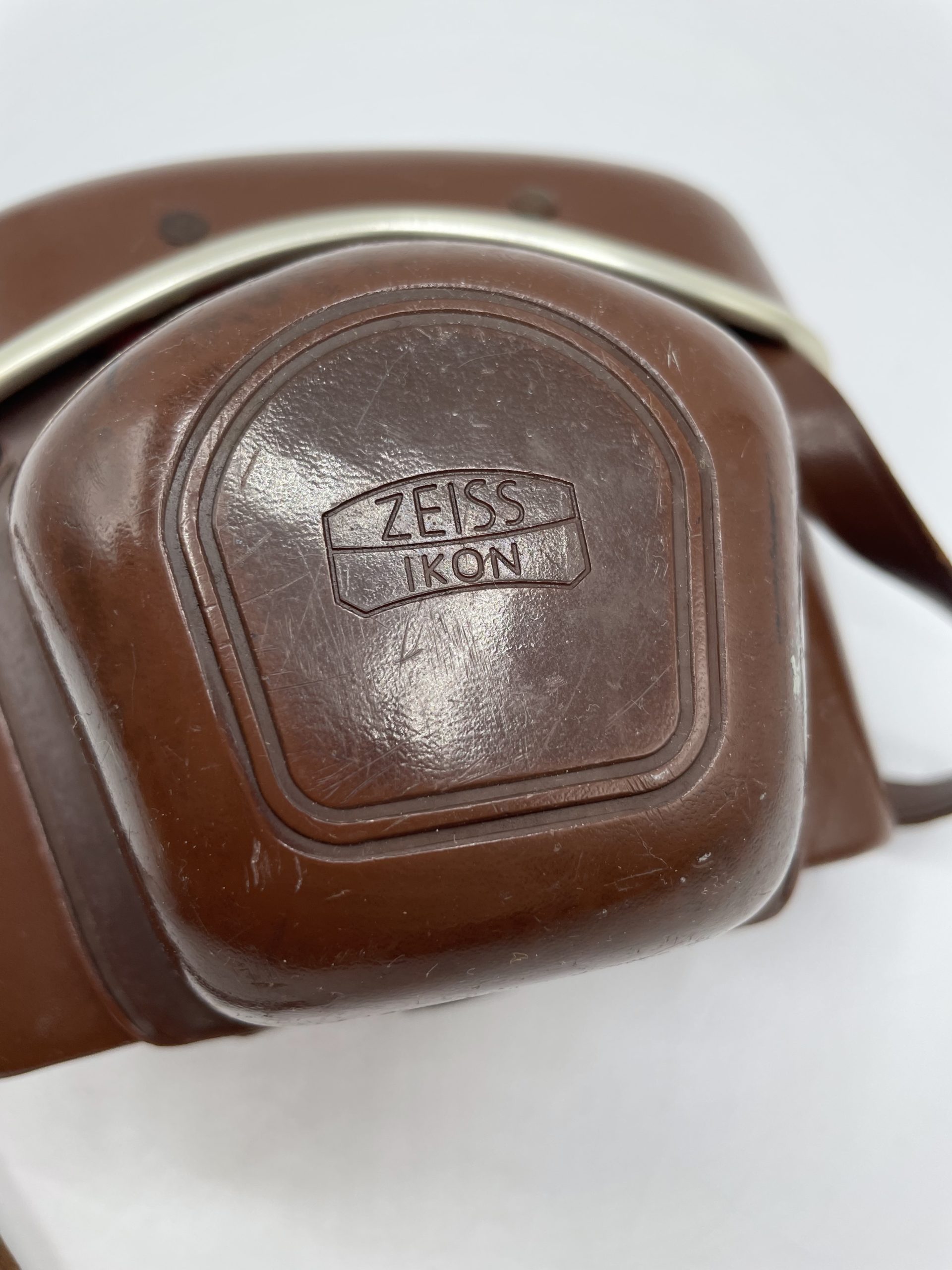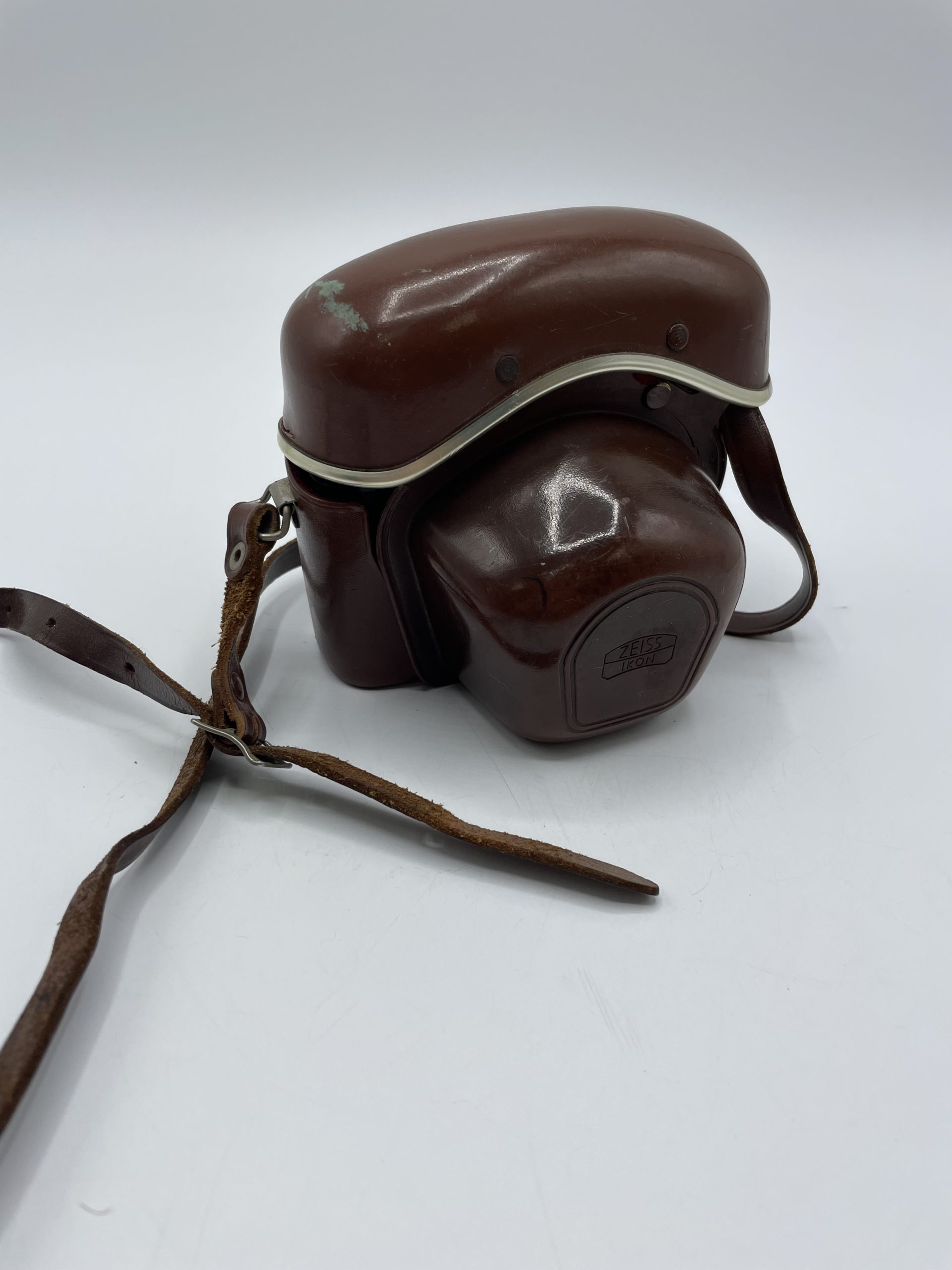 Ce magnifique boitier ancien est un modèle vintage de la marque allemande Zeiss Ikon Contessa SLK Spezial. Des années 50-60, ce boîtier est fourni avec sa sacoche de transport en cuir modulable qui peut se transformer en simple harnais à porter en bandoulière. Le boîtier à pellicule est monté avec un objectif Carl Ziss Tessar 2.850 qui porte le numéro de série 3395890. Vendu en l’état, ce boîtier est un petit bijou d’objet vintage de collection !