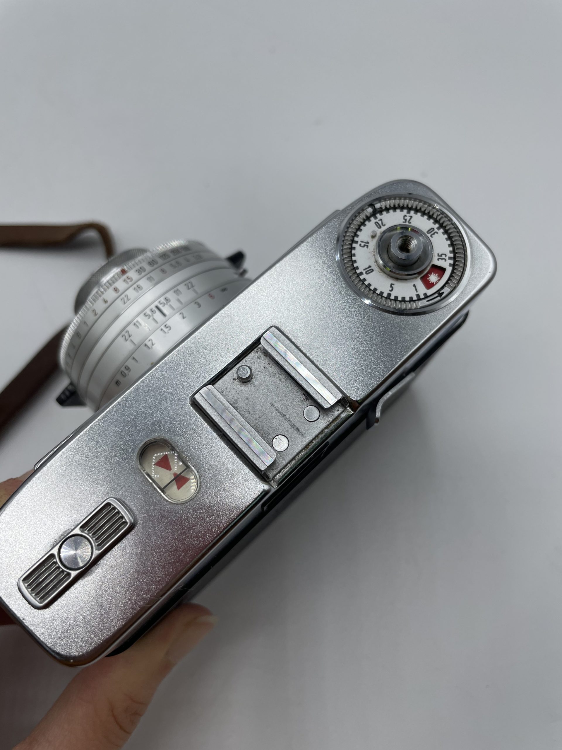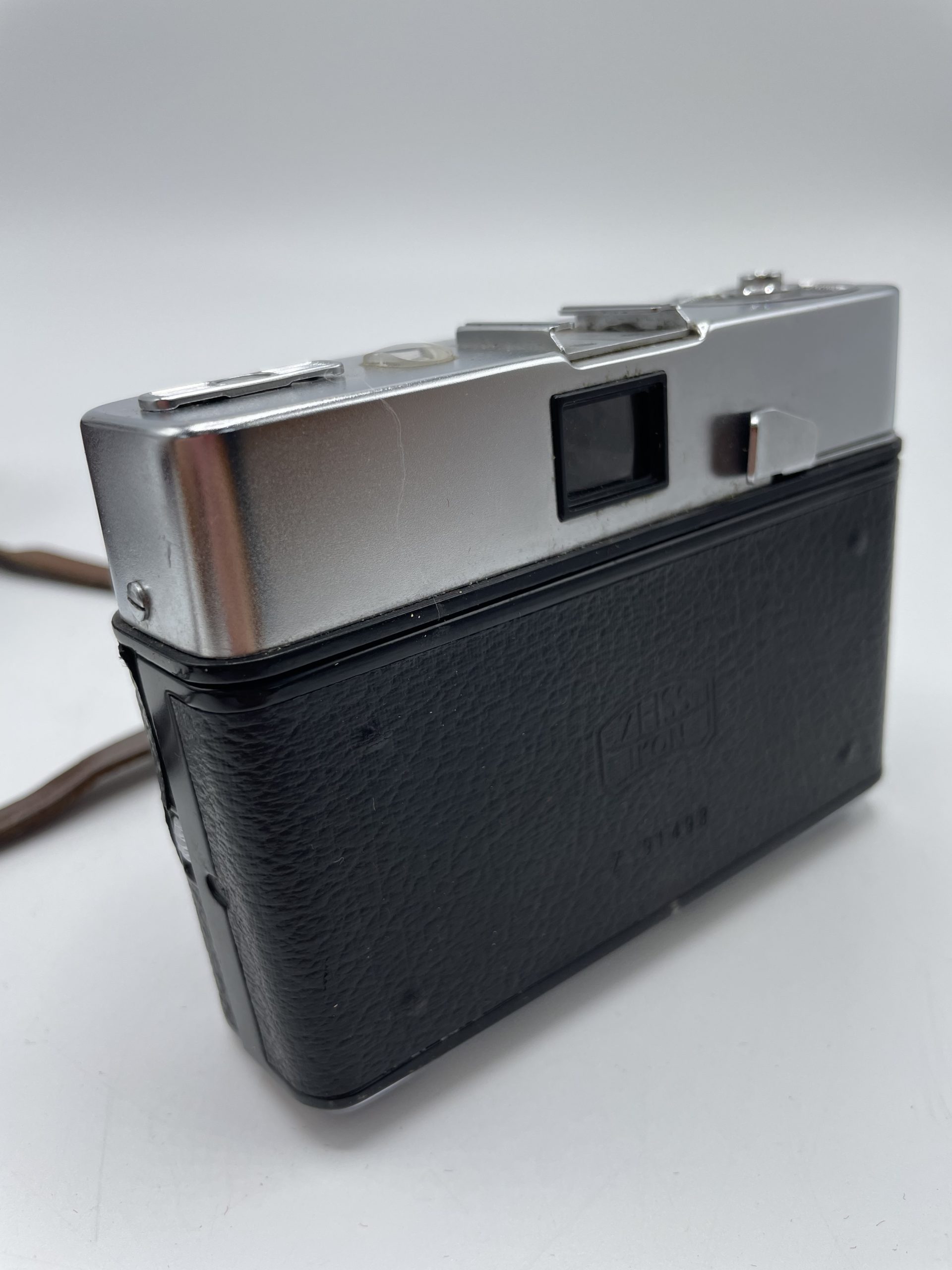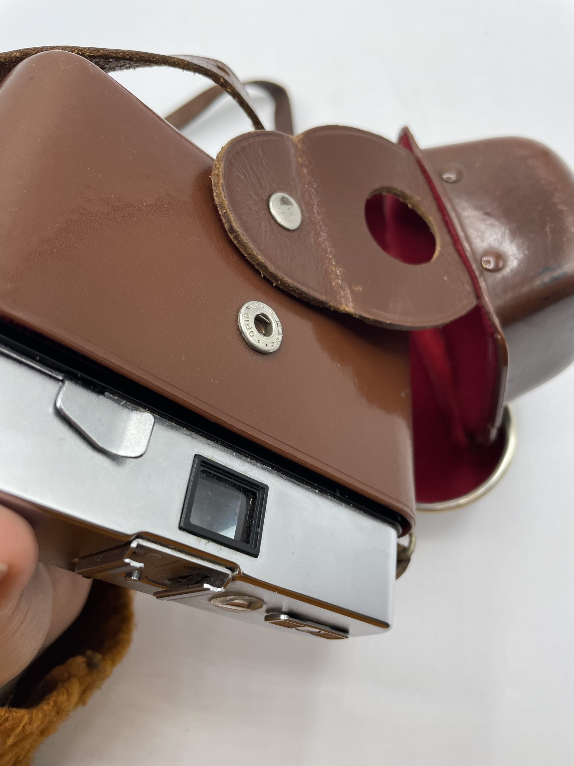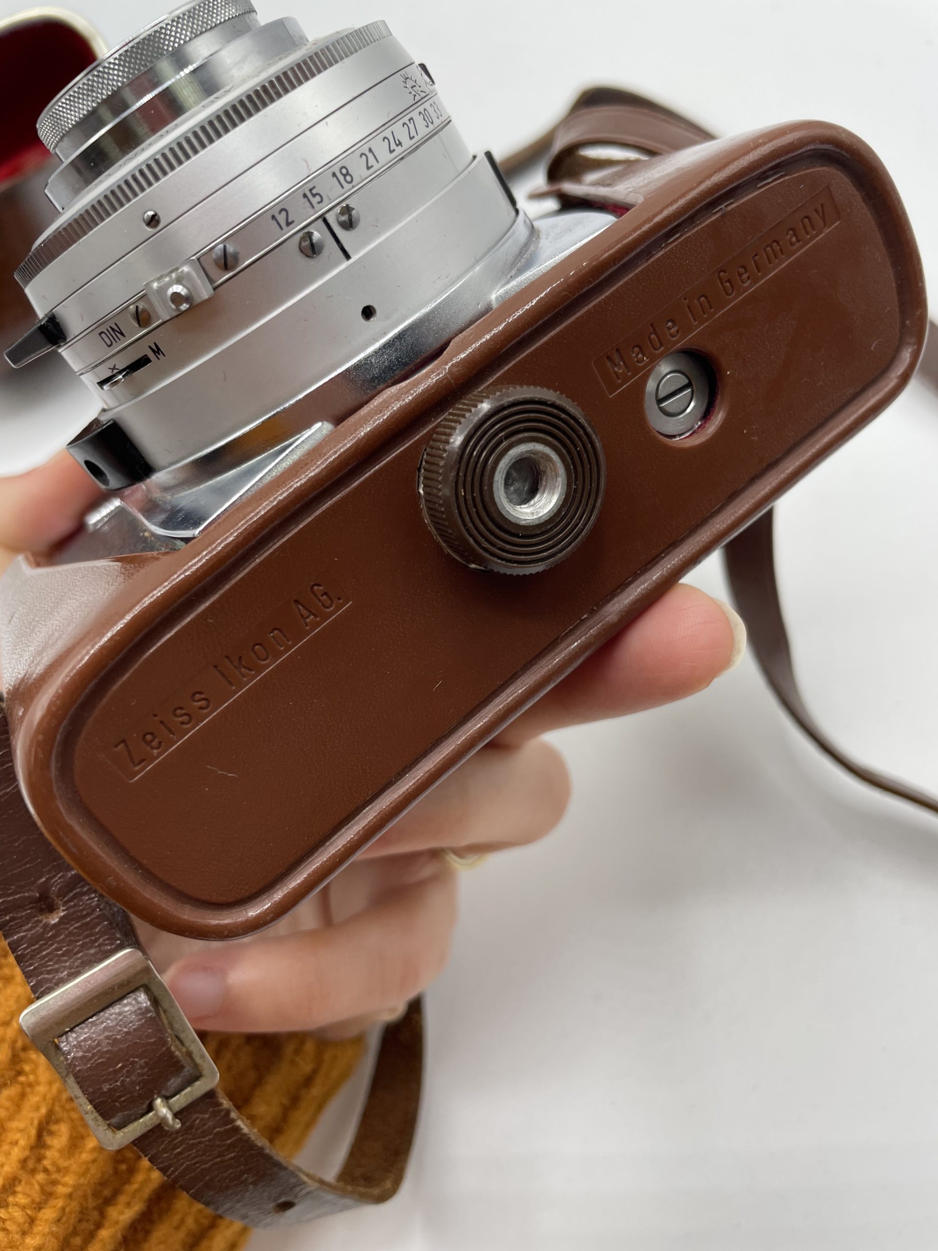 Ce magnifique boitier ancien est un modèle vintage de la marque allemande Zeiss Ikon Contessa SLK Spezial. Des années 50-60, ce boîtier est fourni avec sa sacoche de transport en cuir modulable qui peut se transformer en simple harnais à porter en bandoulière. Le boîtier à pellicule est monté avec un objectif Carl Ziss Tessar 2.850 qui porte le numéro de série 3395890. Vendu en l’état, ce boîtier est un petit bijou d’objet vintage de collection !