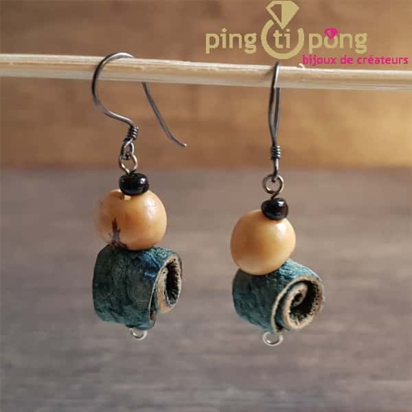 Boucles d’oreilles fantaisies jolies et originalles de la marque Green-Age en noix de tagua et peau d’orange bleue turquoise