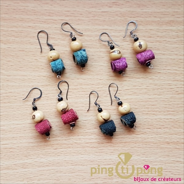 Bijoux fait main avec un un rouleau en peau d’orange et une perle faite en noix de tagua : cette noix qui pousse en amérique du Sud ressemble beaucoup à l’ivoire c’est pourquoi elle est aussi appelée Ivoire Végétal.