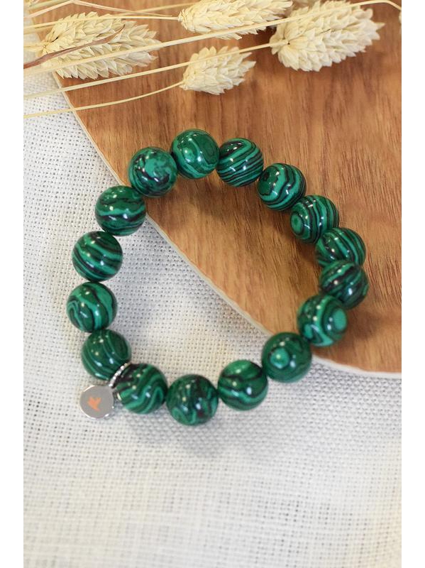 Bracelet élastique composé de perles en pierre naturelle de malachite reconstituée. Pierre de protection, la malachite absorbe les énergies négatives et polluantes tout en développant les ondes positives. Elle accompagne les transformations et pousse au changement et à la prise de risque. Elle apporte clairvoyance dans les relations humaines et atténue les jugements pour davantage de bienveillance.