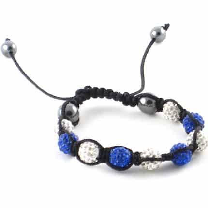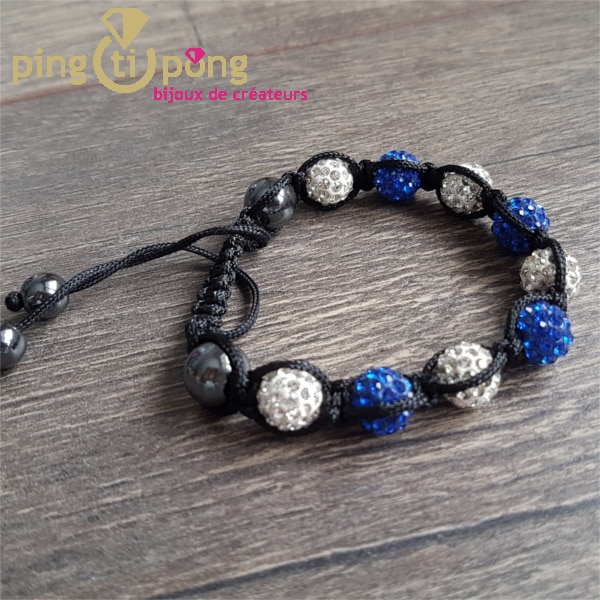 9 en strass bleues et blanches alternées sur les 11 perles +2 sur les lacettes de réglages.