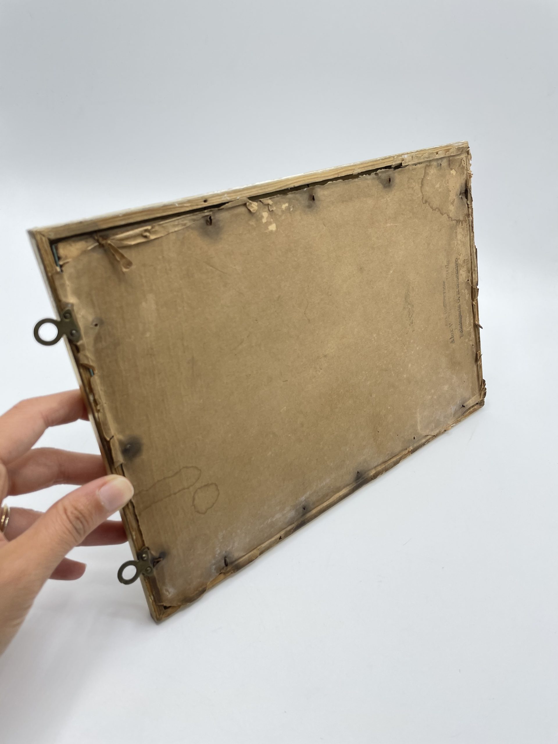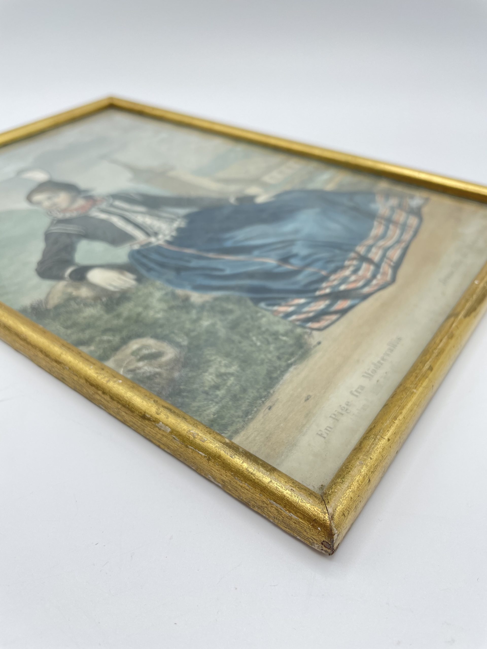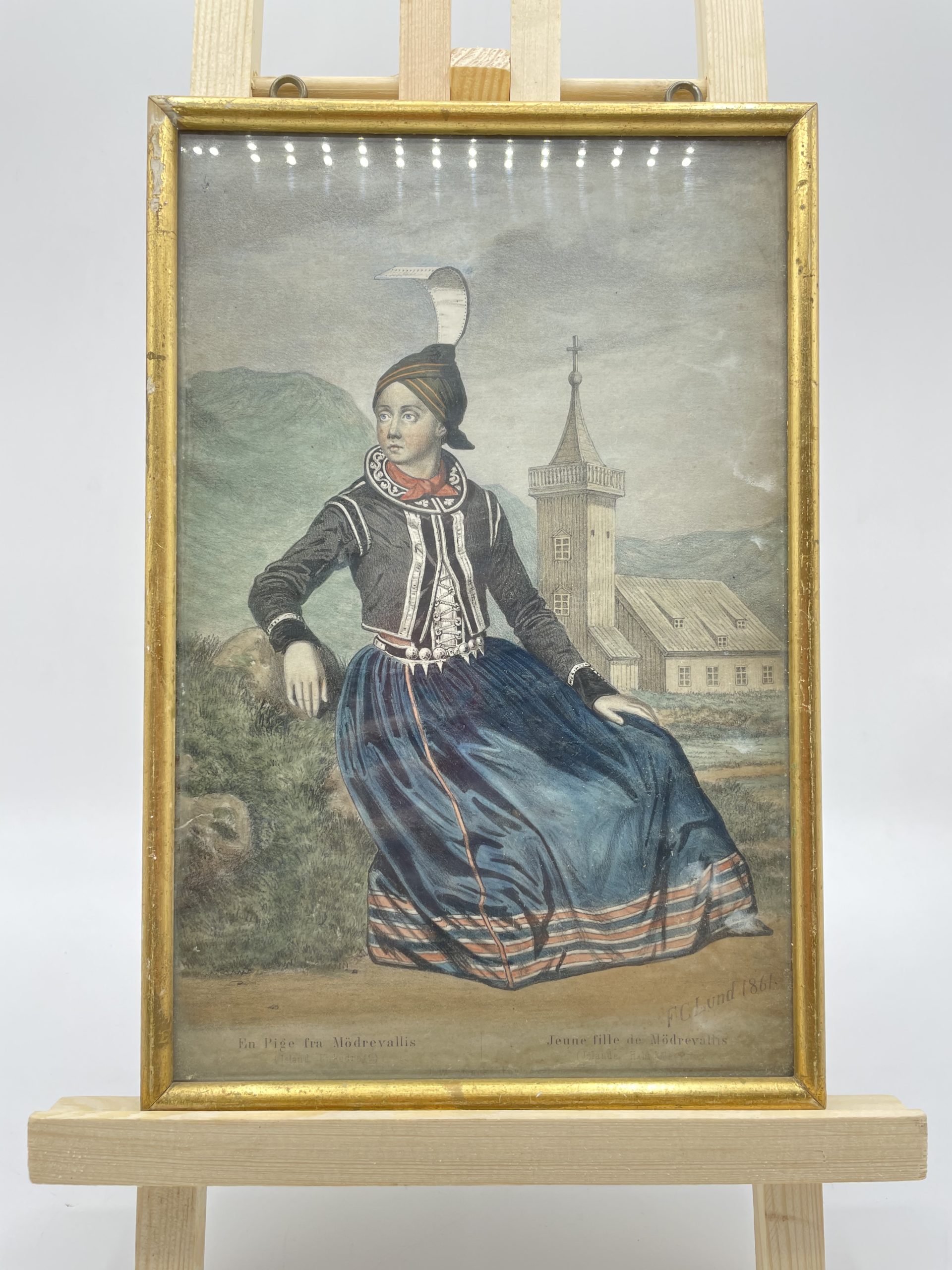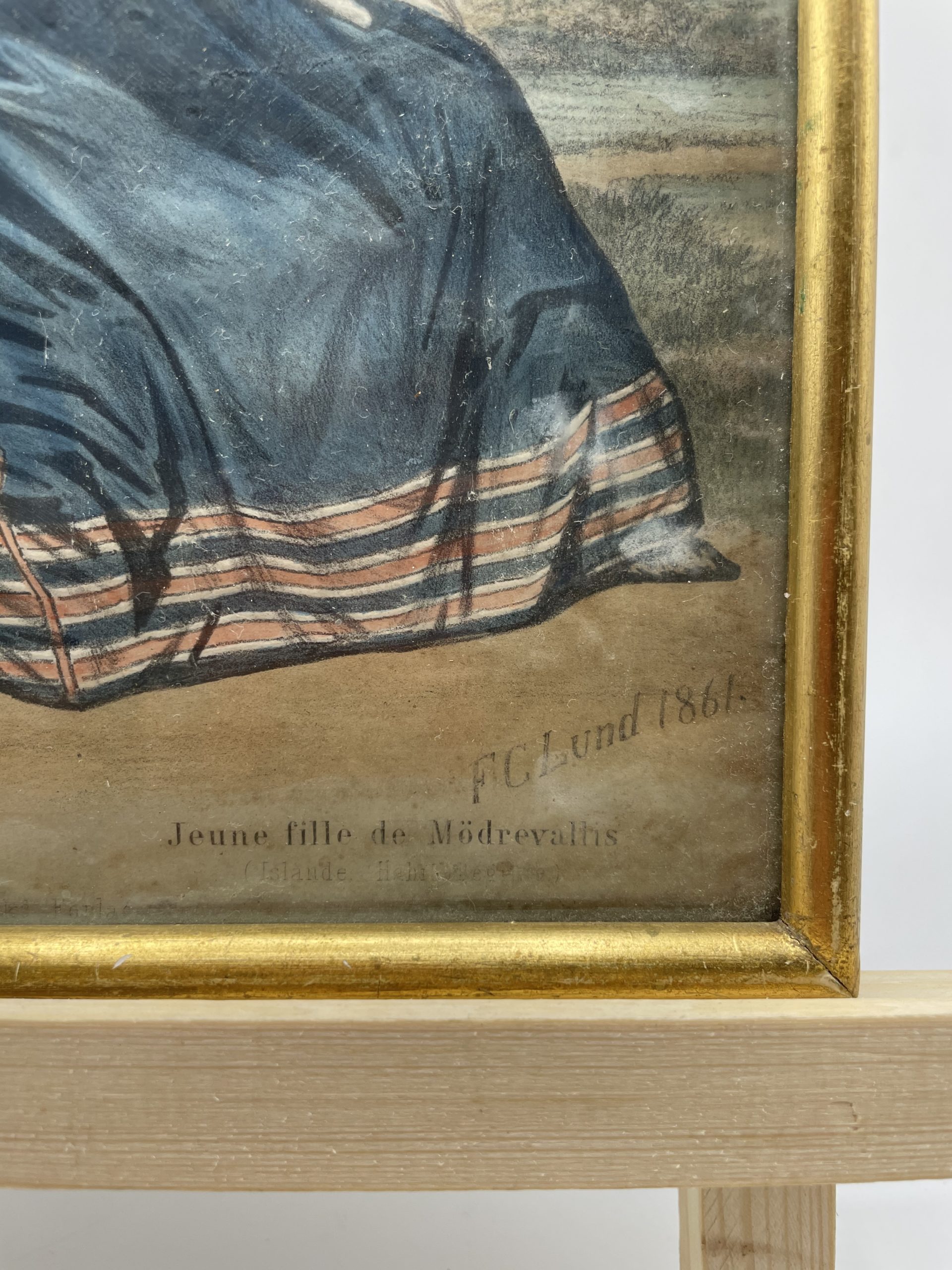 Joli cadre vintage d’une illustration d’une jeune fille de Mödrevallis – Islande – en date de 1861. Le tableau est signé FC LUND et il est encadré dans un cadre en bois vintage doré. Le cadre est abîmé et présente quelques traces d’usure, jolies marques du temps passé.