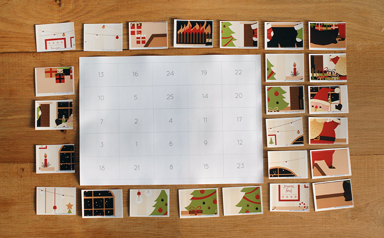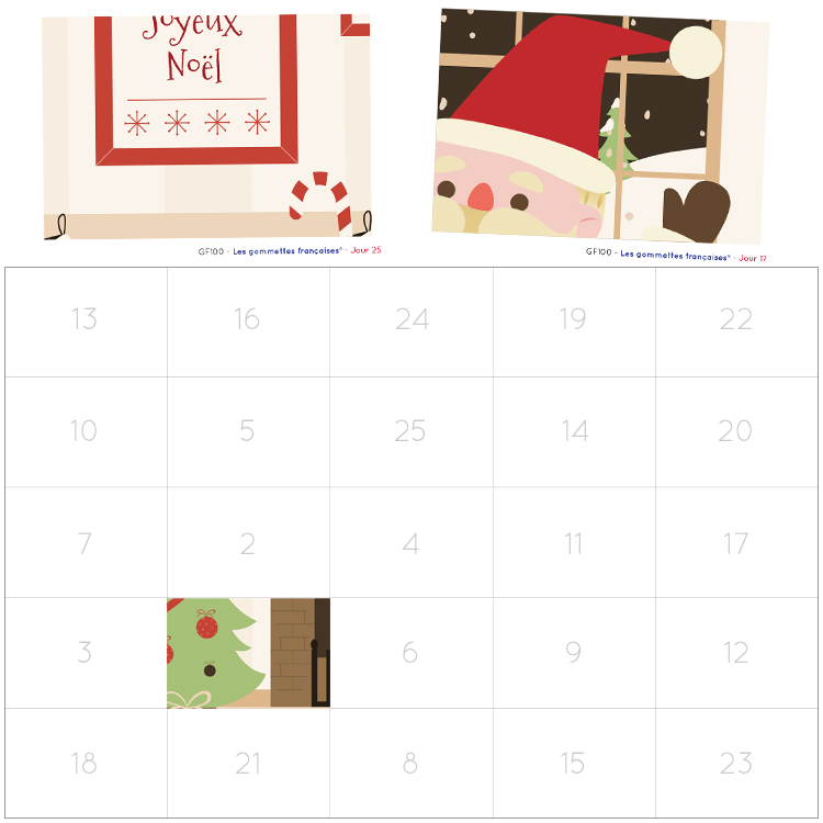 Calendrier de l’Avent ” Scène de Noël” à assembler Assemble ton calendrier de l’Avent “Scène de Noël”, jours après jour, en attendant Le 25 décembre, avec les 25 stickers fournis Chaque stickers correspond à 1 jour du mois de décembre, tu devras le coller sur la case correspondante de la grille en papier couché fournis avec les stickers. Le jour de Noel, tu découvriras une magnifique scène de Noël que tu auras assemblé. Tu pourras l’encadrer et l’afficher dans ta chambre.
