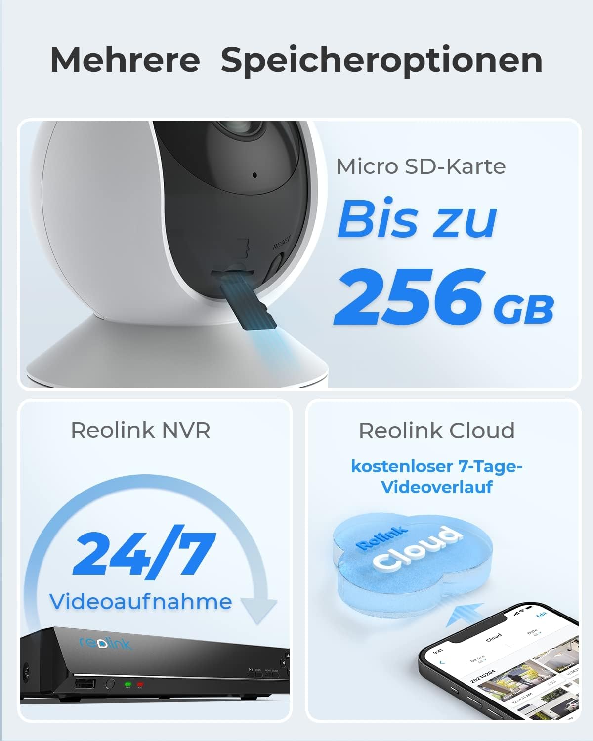 Options de stockage local et en ligne : les enregistrements vidéo peuvent être stockés sur la carte micro SD (max. 256 Go) et Reolink NVR et téléchargés sur le Reolink Cloud. La carte SD et le NVR ne sont pas inclus