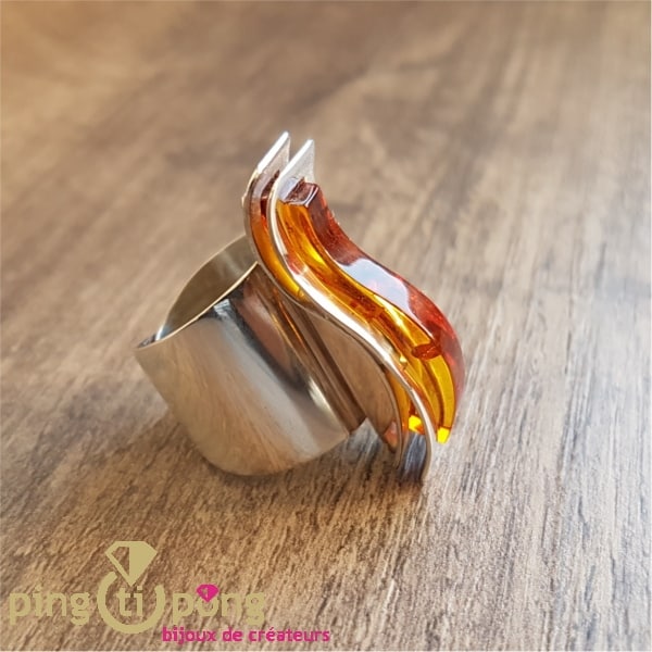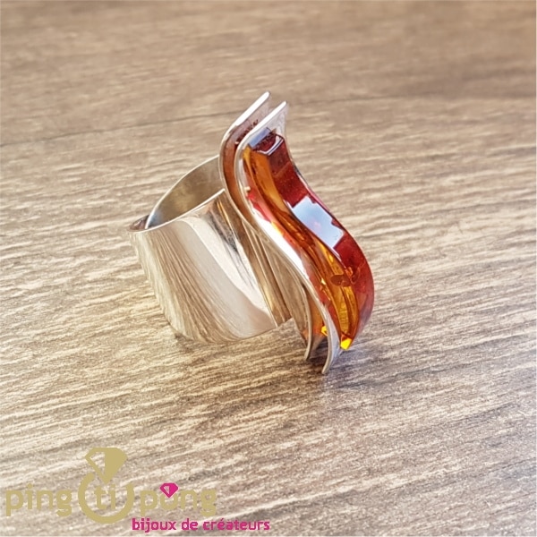 Telle une épaisse vague en ambre cognac soulignée par deux vaguelettes en argent massif, cette bague est une véritable oeuvre d’art.