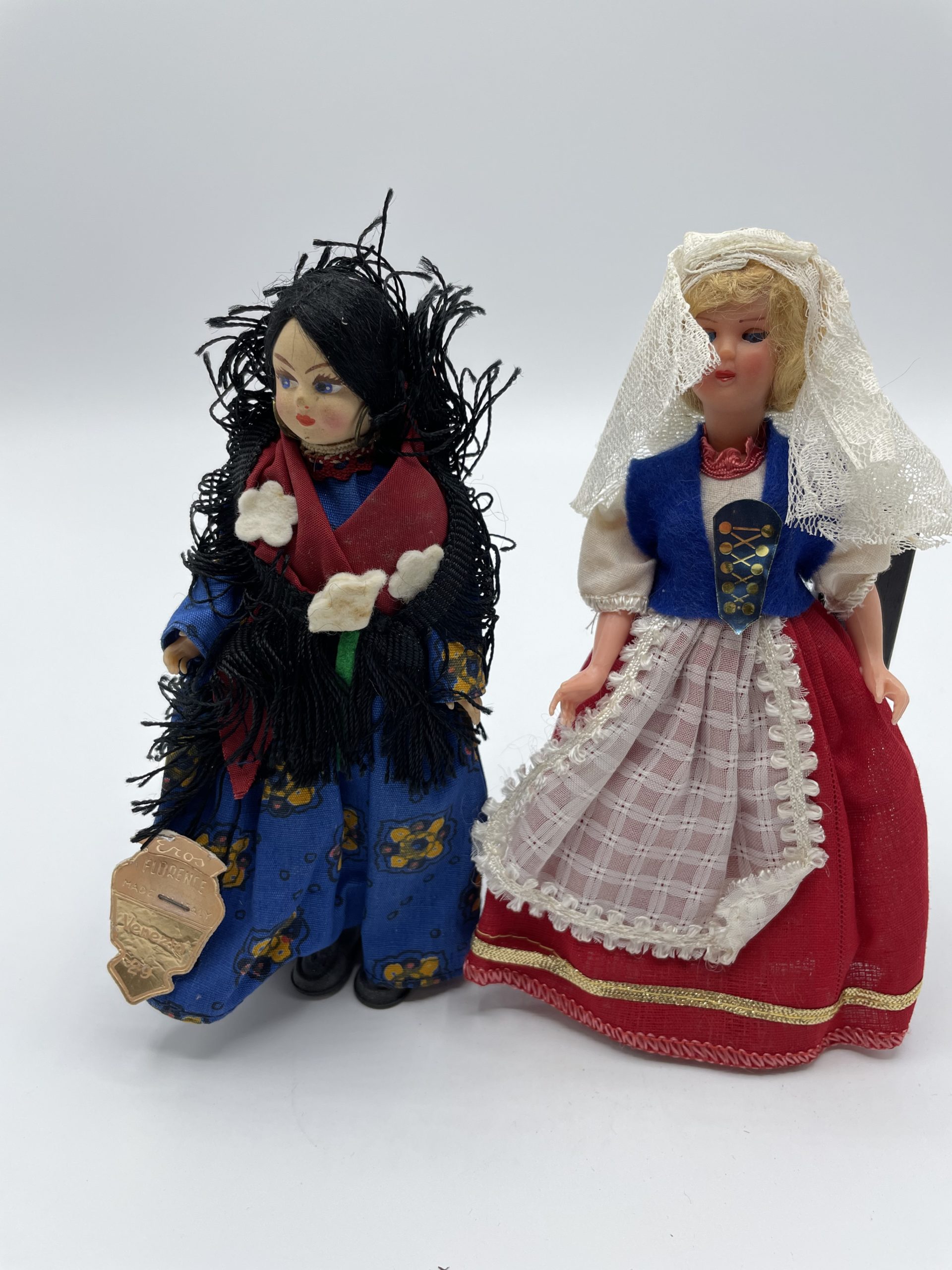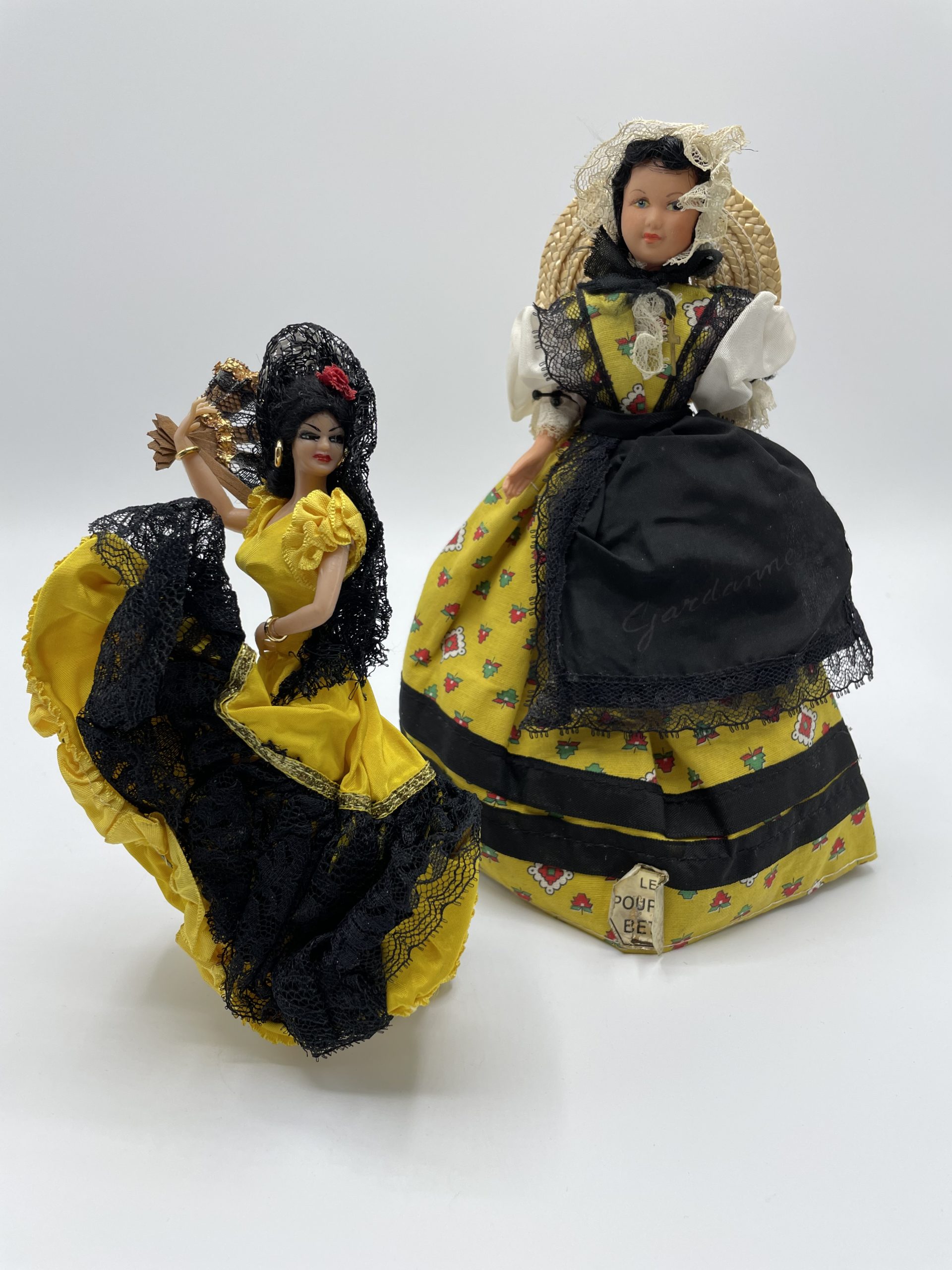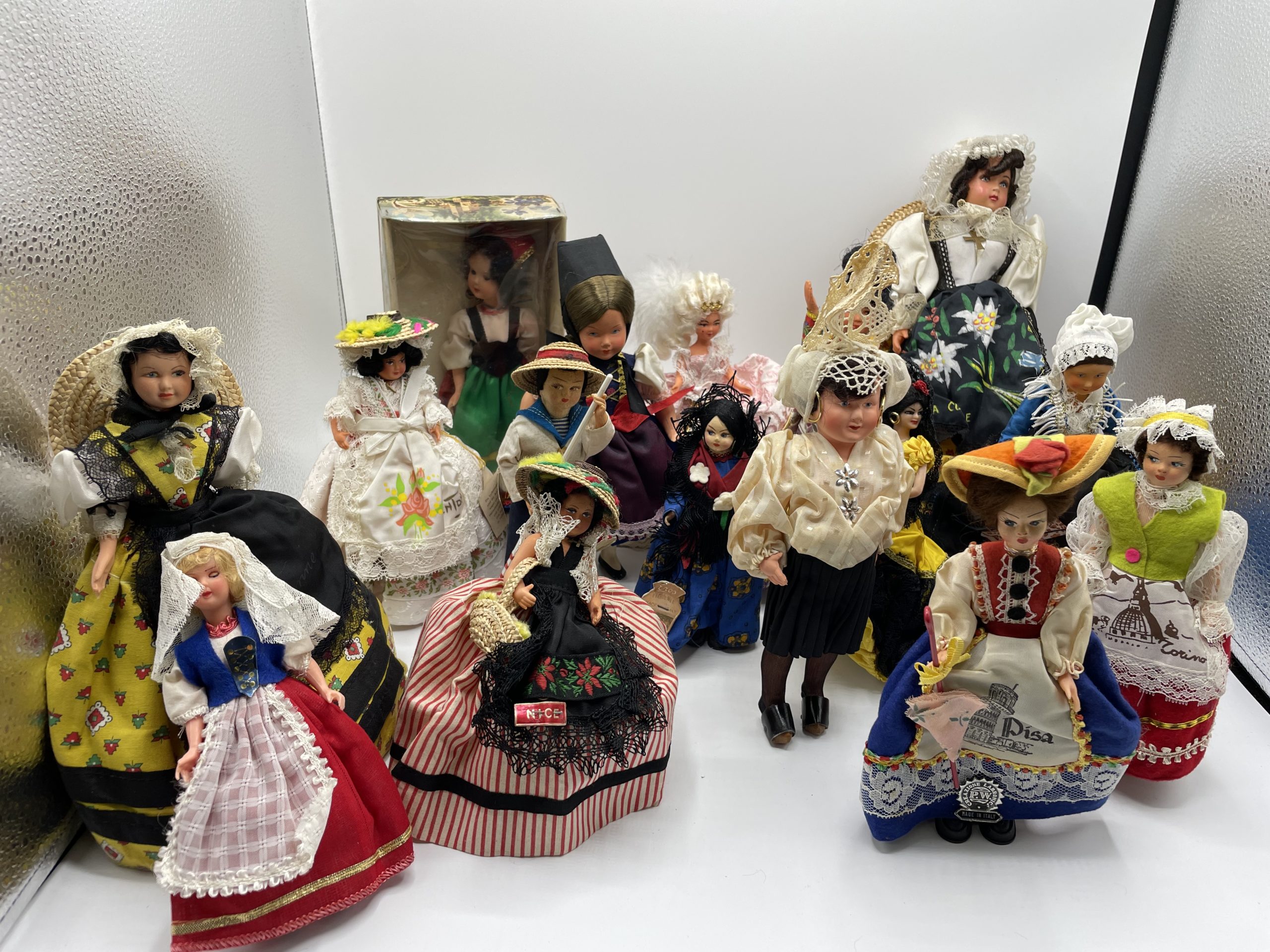 Cette jolie collection se compose de 16 poupées de collection vintage, souvenirs de vacances autour du monde. En tenues traditionnelles et habits typiques, les poupées vous feront voyager à travers les grandes villes du sud de la France, Nice, Menton, Gardanne, Montélimar – mais aussi à Paris, en Espagne, en Italie, en Autriche et au Japon ! Objets artisanaux, certaines poupées sont signées Poupées Betty, Eros ou encore Rosy France. Une jolie petite collection vintage à compléter ou à ajouter à votre collection déjà existante !