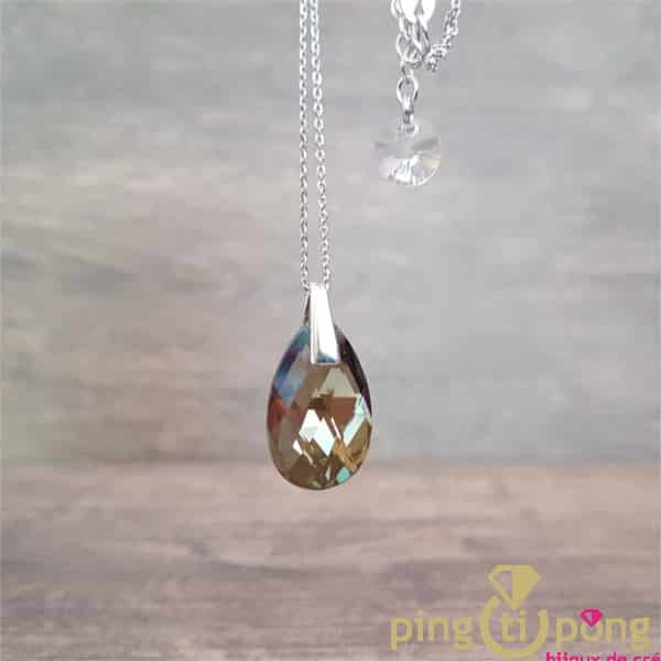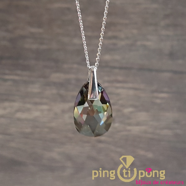 Pingtipong vous propose ce très joli collier en argent massif rhodié en mailles serpent et cristal de Swarovski. Ce bijou comporte un pendentif en cristal « ombre bronze » en forme de larme.