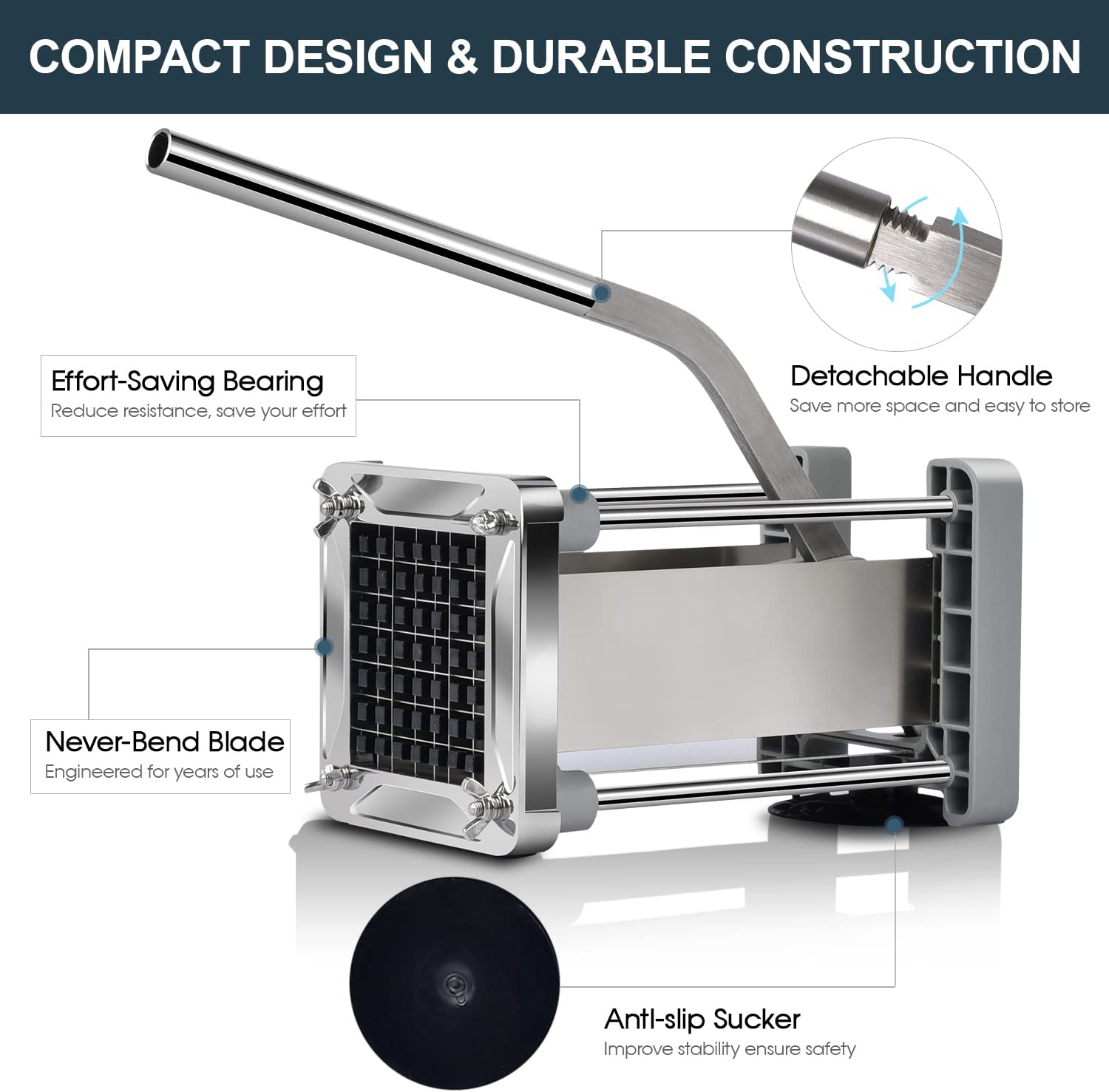 Coupe-frites professionnel : acier inoxydable de haute qualité, poignée allongée, plus grande capacité, forte aspiration au sol, lames robustes de qualité restaurant (lors de la coupe d’aliments à haute teneur en fibres tels que les patates douces, les carottes, les ananas et plus encore). Ce coupe-pommes de terre est conçu pour durer de nombreuses années.