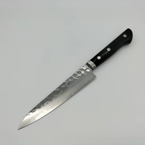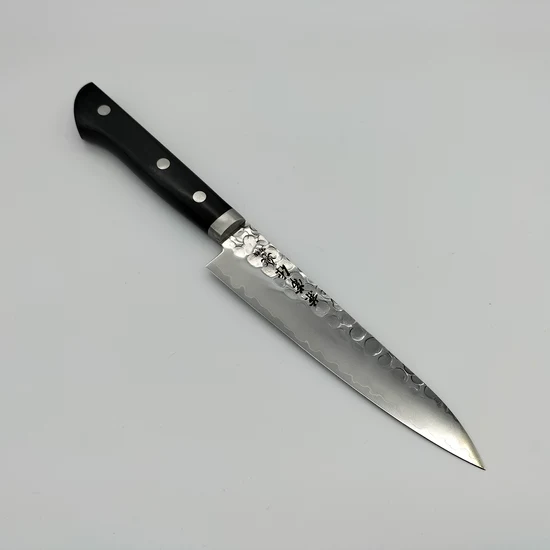 Le « Couteau de cuisine utilitaire Kane Tsune » se distingue par sa lame en acier VG1 San mai et son manche en pakkawood, formant un ensemble d’exception disponible dans la coutellerie du Marais à Paris.