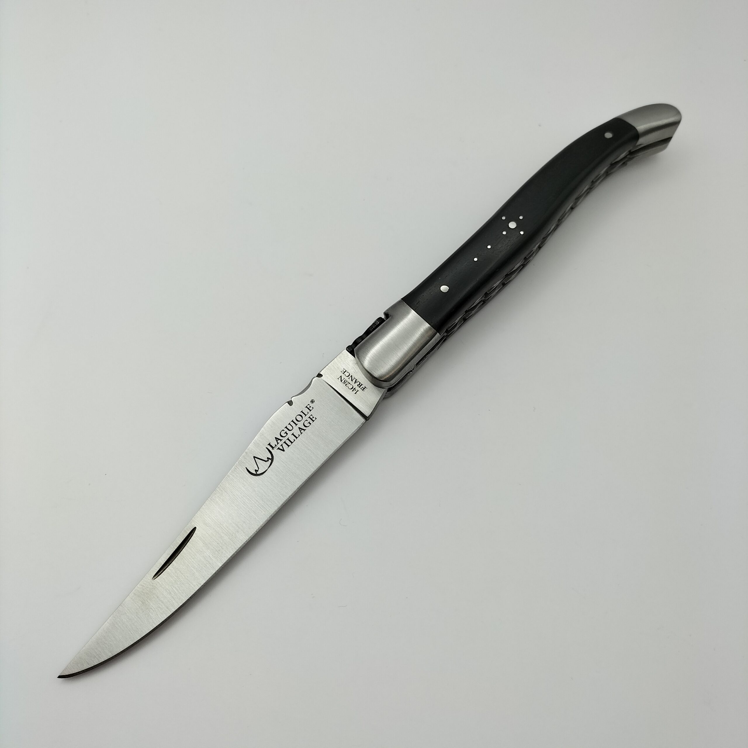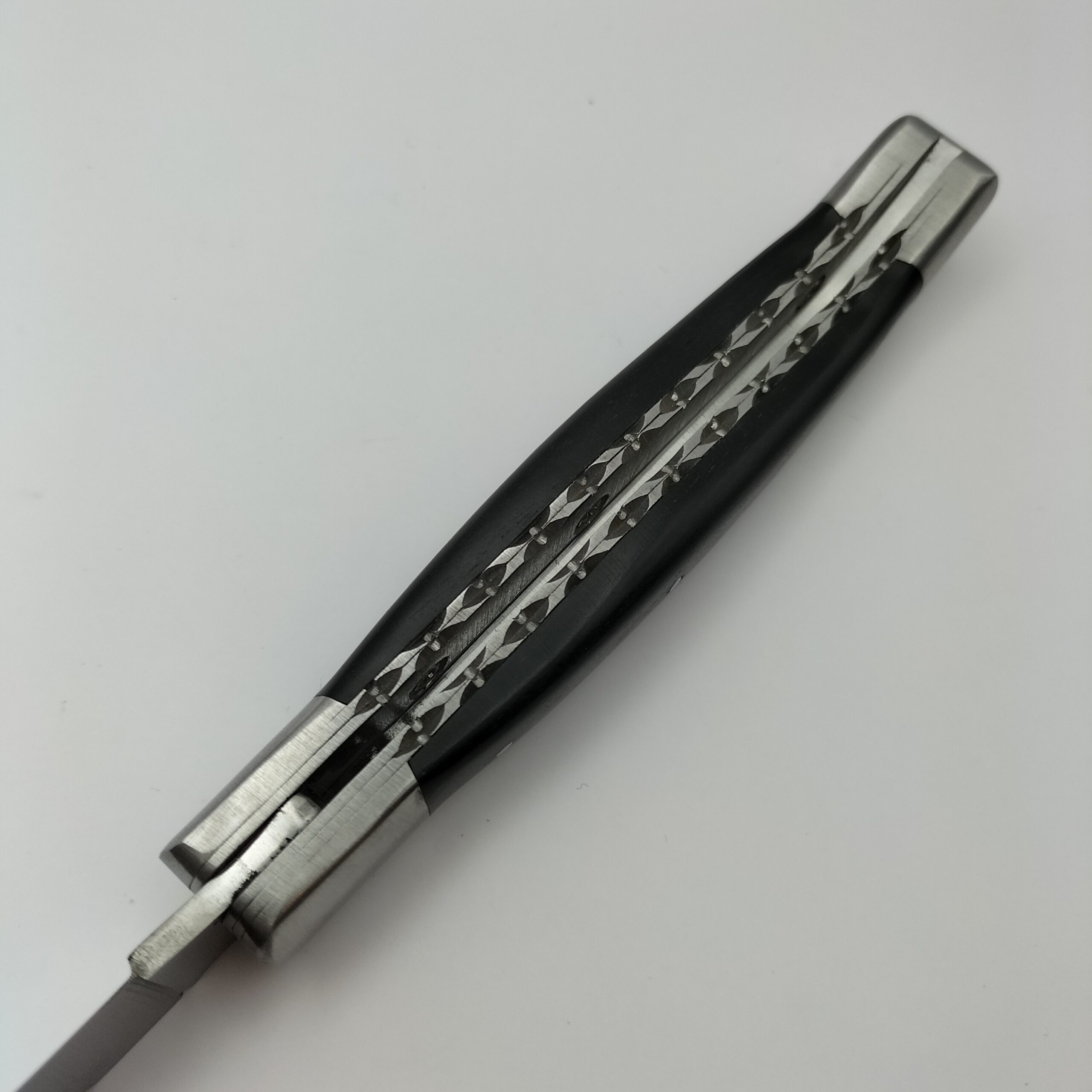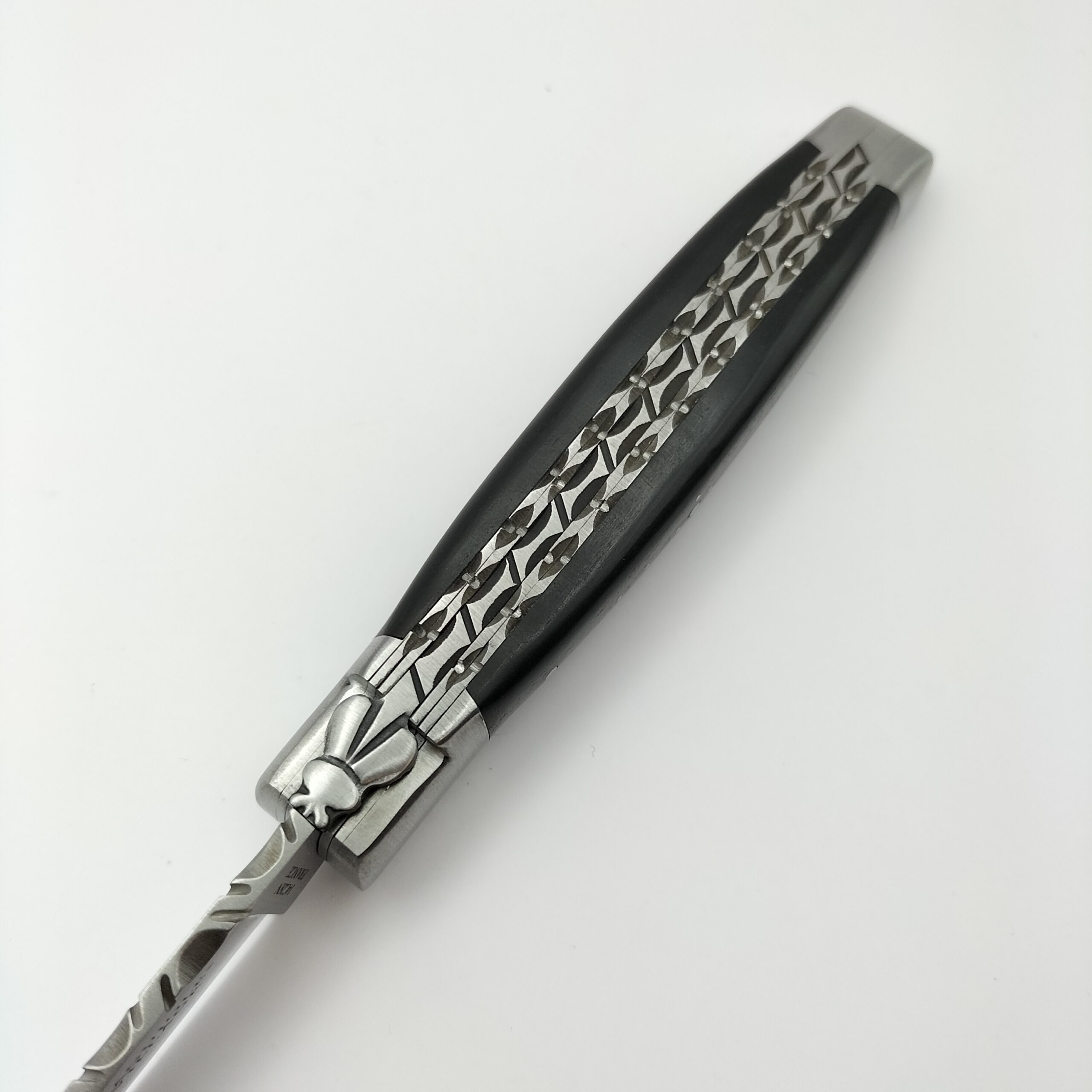 Le manche en ébène, véritable symbole de sophistication et d’élégance, ajoute une touche de raffinement à ce couteau d’exception. Mettant en valeur la beauté naturelle et la richesse du bois précieux, le manche en ébène offre une prise en main confortable et agréable, tout en conférant au couteau une esthétique intemporelle et authentique. Le modèle double platines, orné d’un remarquable travail de guillochage sur le ressort et les platines, témoigne du souci du détail et du savoir-faire exceptionnel des artisans de Laguiole Village, ajoutant ainsi une dimension supplémentaire de sophistication et de beauté à cette pièce unique.