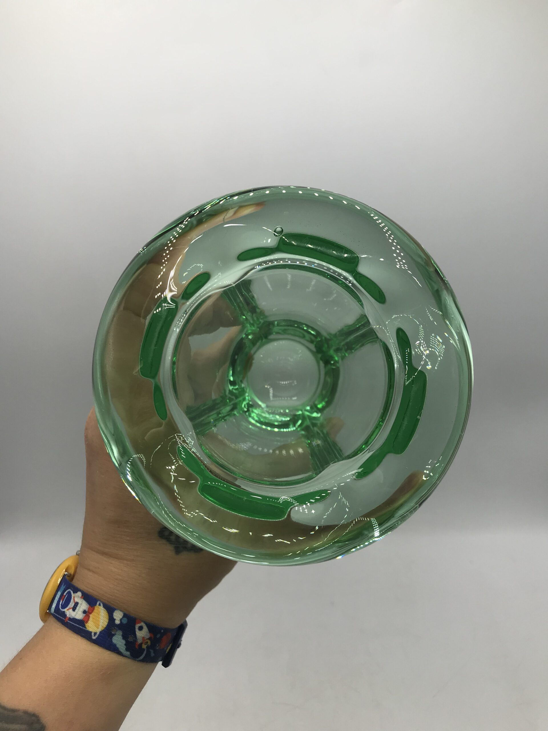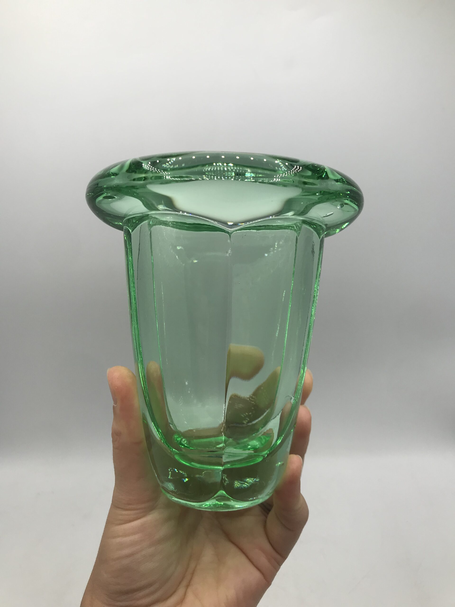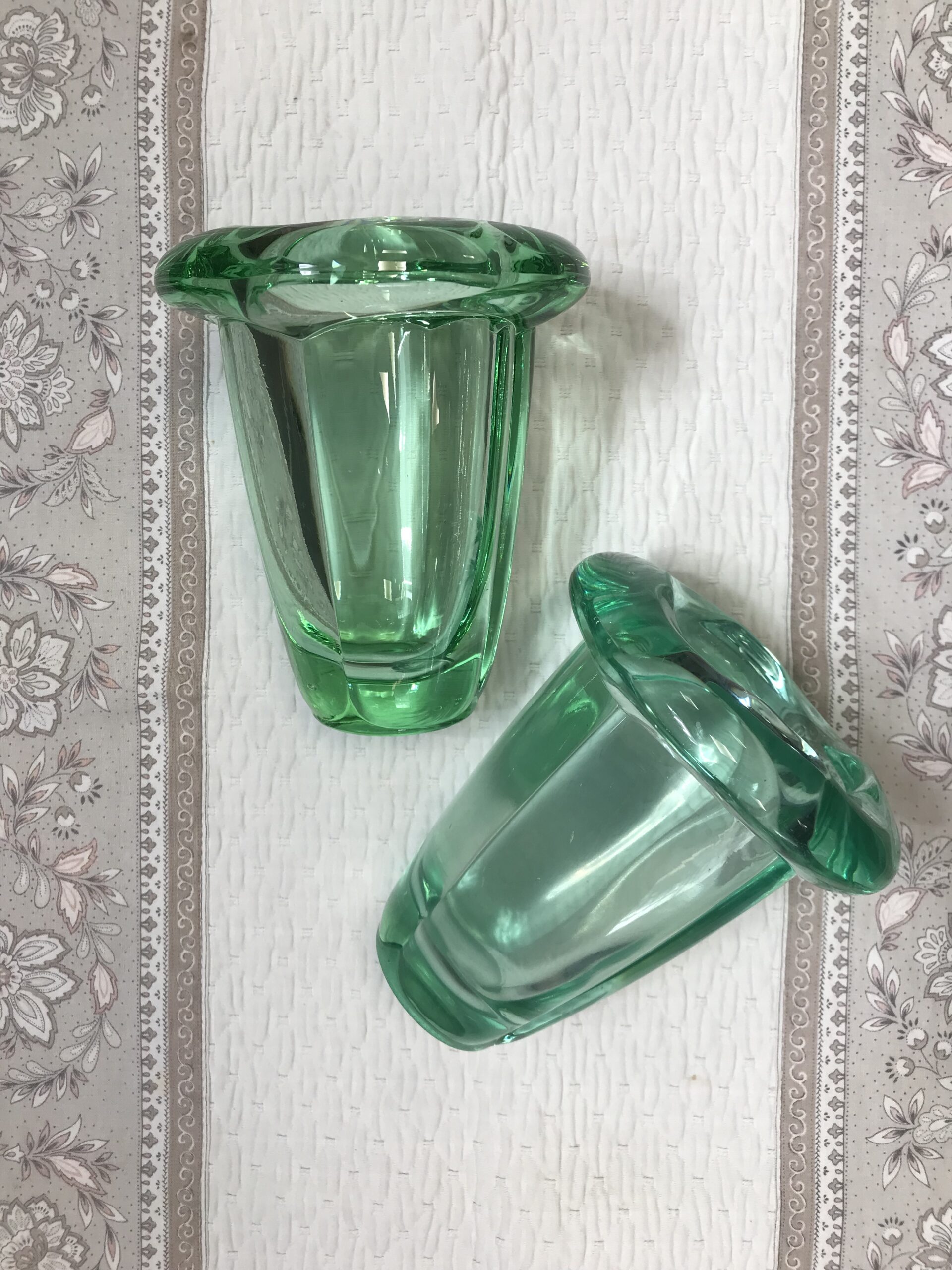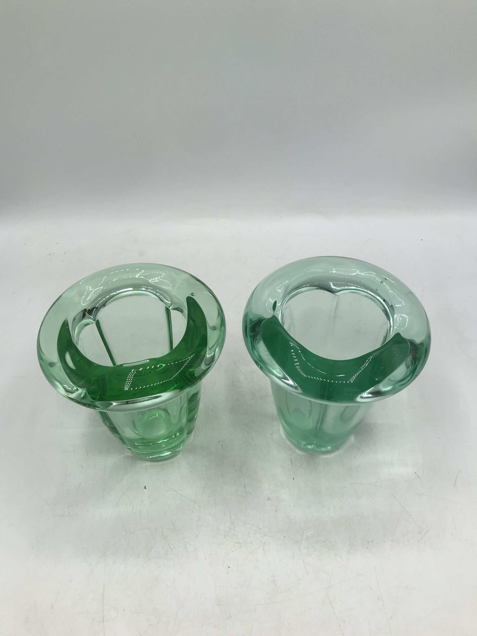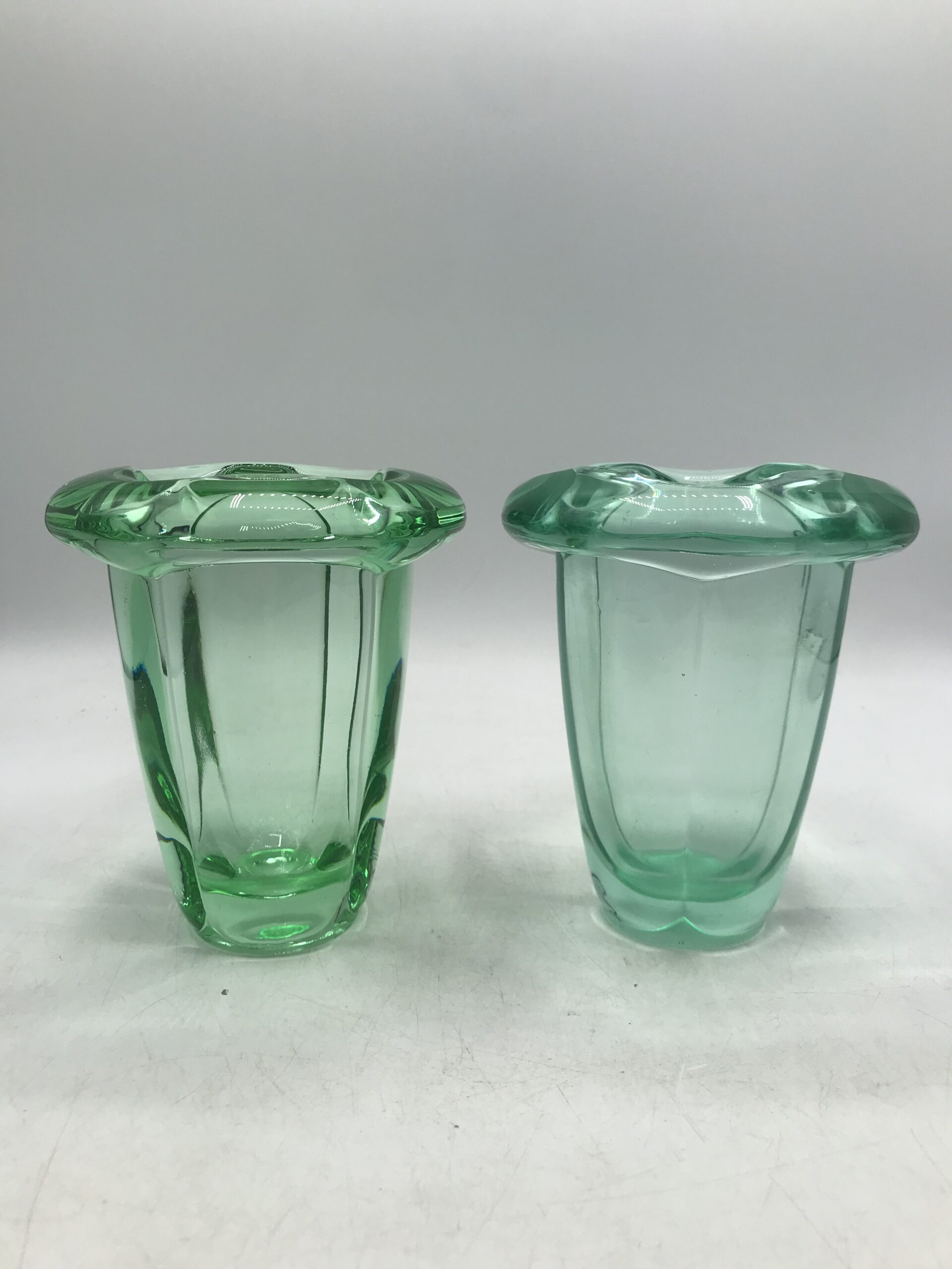 Alerte grosse pépite !!! Duo de vase polylobé DAUM. Amoureux du cristal, amoureux de la maison DAUM et d’art déco voici un duo qui fera des étincelles. Cet ensemble est composé de deux vases identiques issus de la cristallerie Daum. Ils ne portent pas de signature, mais ces modèles là en sont dépourvus. Avec leur superbe forme polylobée et leur couleur vert menthe ils feront des jaloux. Ils sont en bon état général, quelques rayures sur le fond. Un petit éclat à l’arrière du socle et a noter (cf photos). Deux jolies pièces qui se répondent l’un a l’autre. Parfait pour une décoration fraiche et végétalisée. Amateur de cristal teinté vous aller craquer.