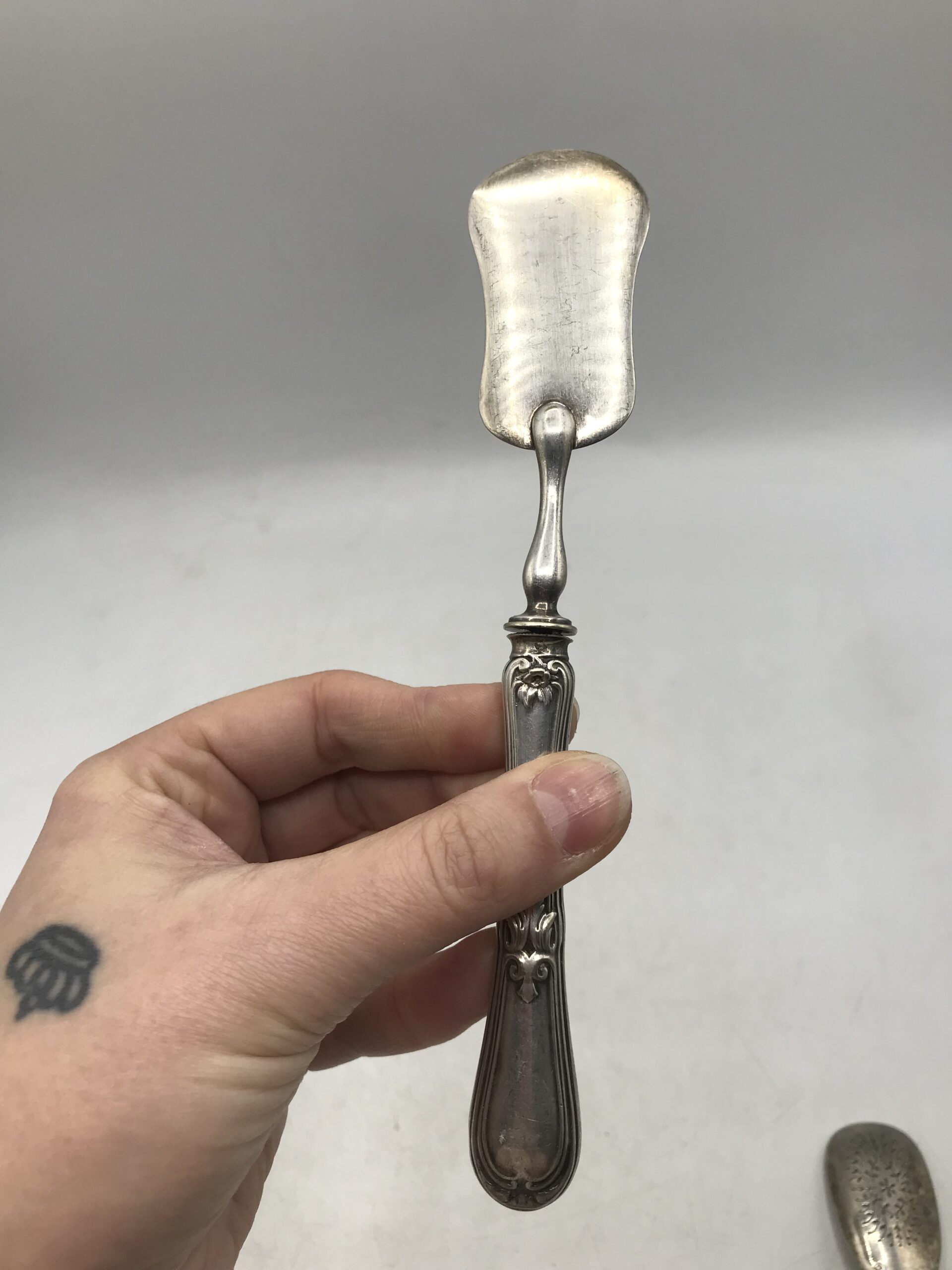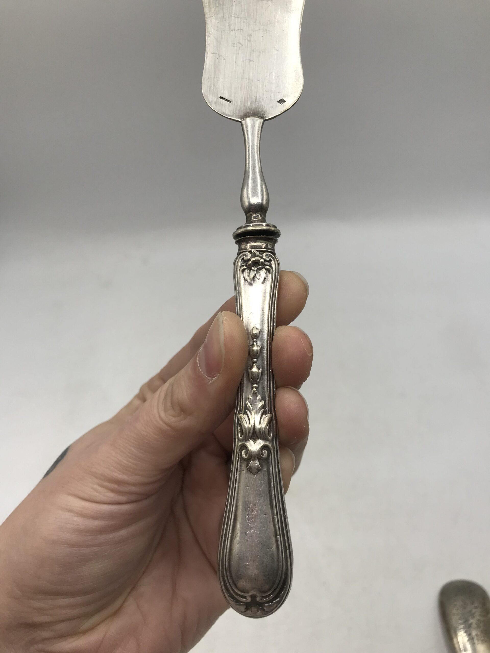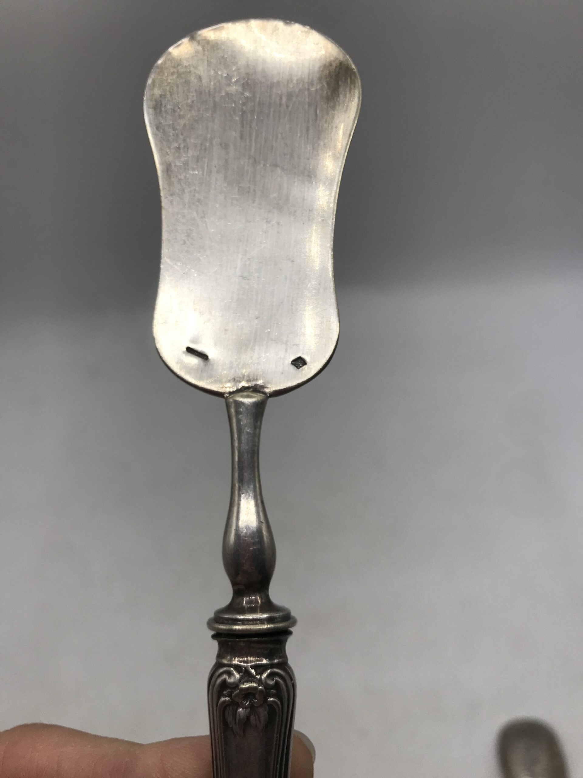 Alerte pépite !!! Duo métal argenté et argent. Un petit duo plein de promesse pour servir vos mignardises. Il est composé d’une pièce signée Christofle, métal argenté avec deux poinçons celui de Christofle à gauche et celui de droite est composé d’une balance avec une abeille entre les plateaux, surmontée de quatre étoiles, deux rameaux en dessous et les lettres CC, le tout dans un ovale dans un rectangle. La seconde pièce présente également deux poinçons. Celui de gauche poinçon d’orfèvre : EC et un lapin courant. et celui de droite je n’ai pas réussi à l’identifier. Donc une belle pièce en métal argenté et l’autre en argent. Elles portent toutes les deux des marques du temps et des oxydations, elles sont dans leur jus (cf photos). Avis aux connaisseurs et amateurs d’art de la table ancien, de class et d’originalité. Des pièces qui ne manquent pas d’audace.