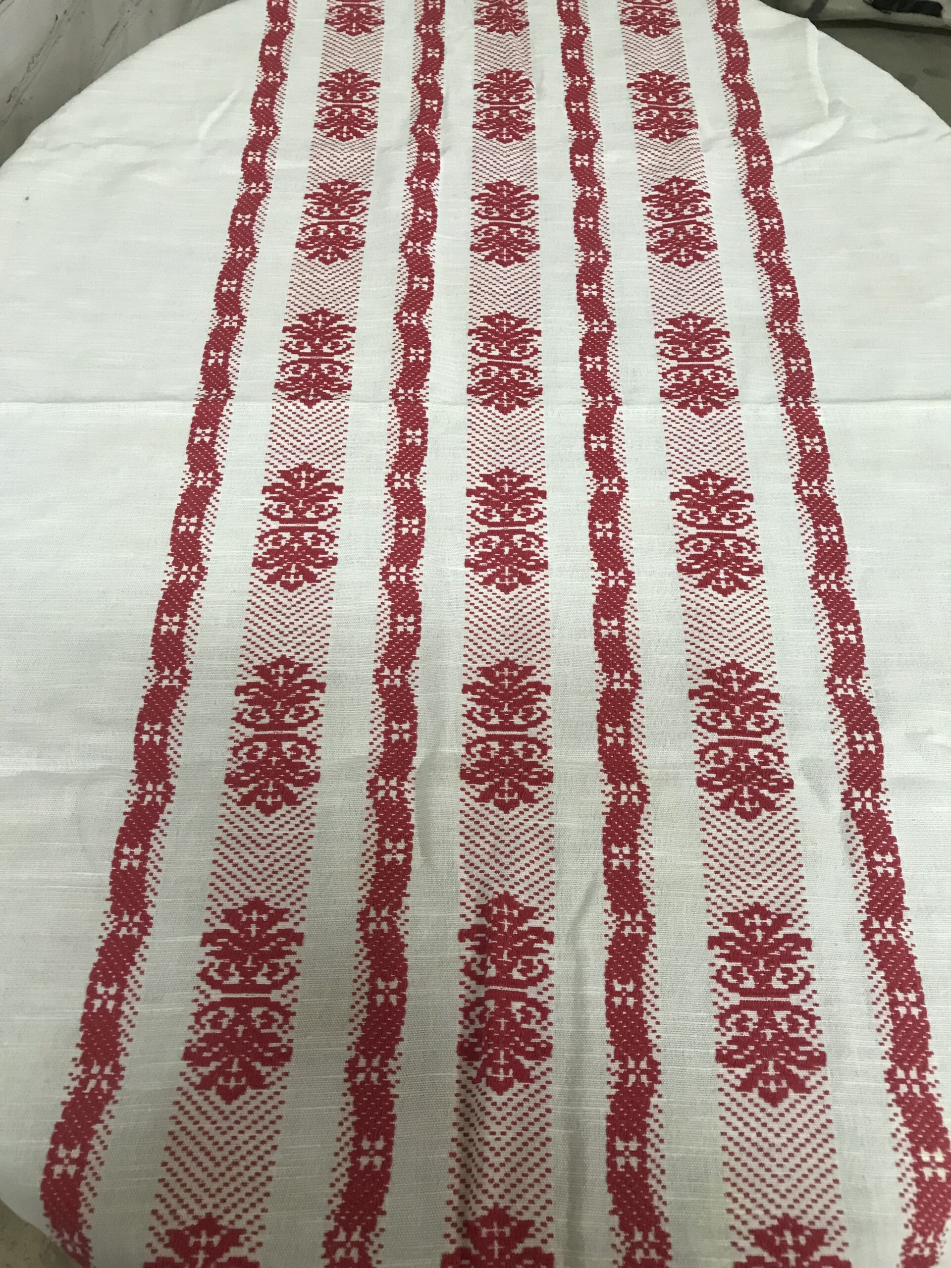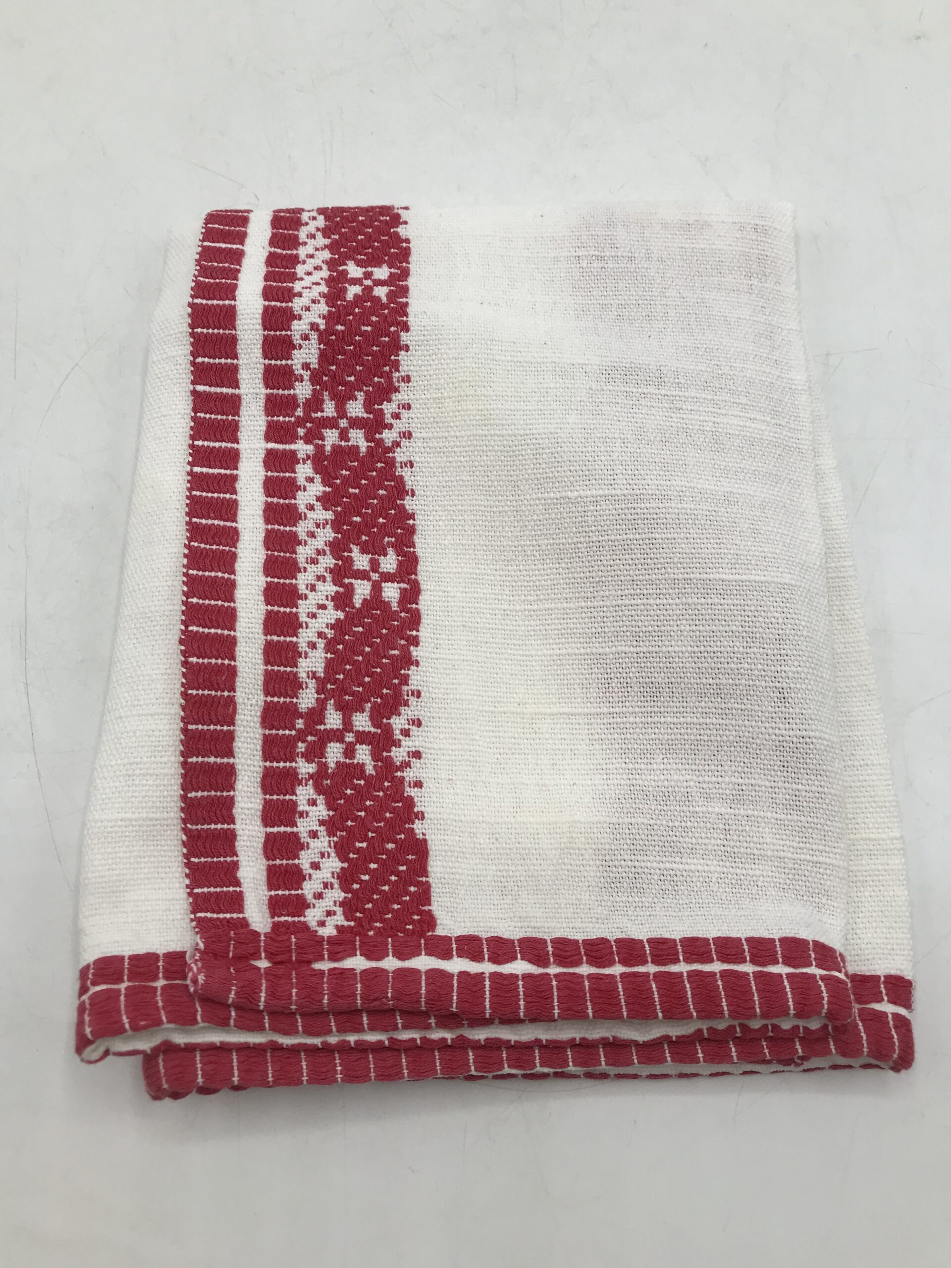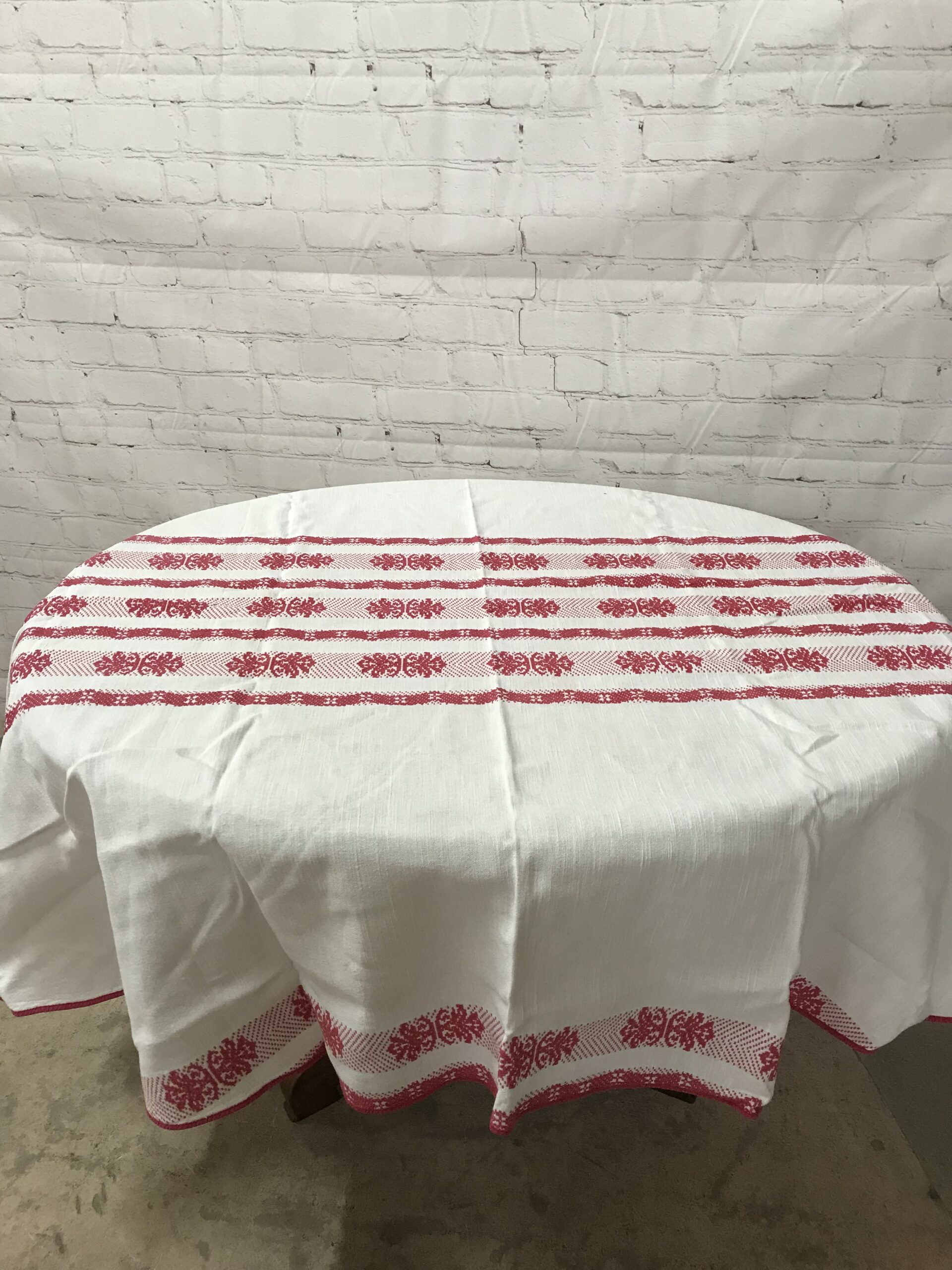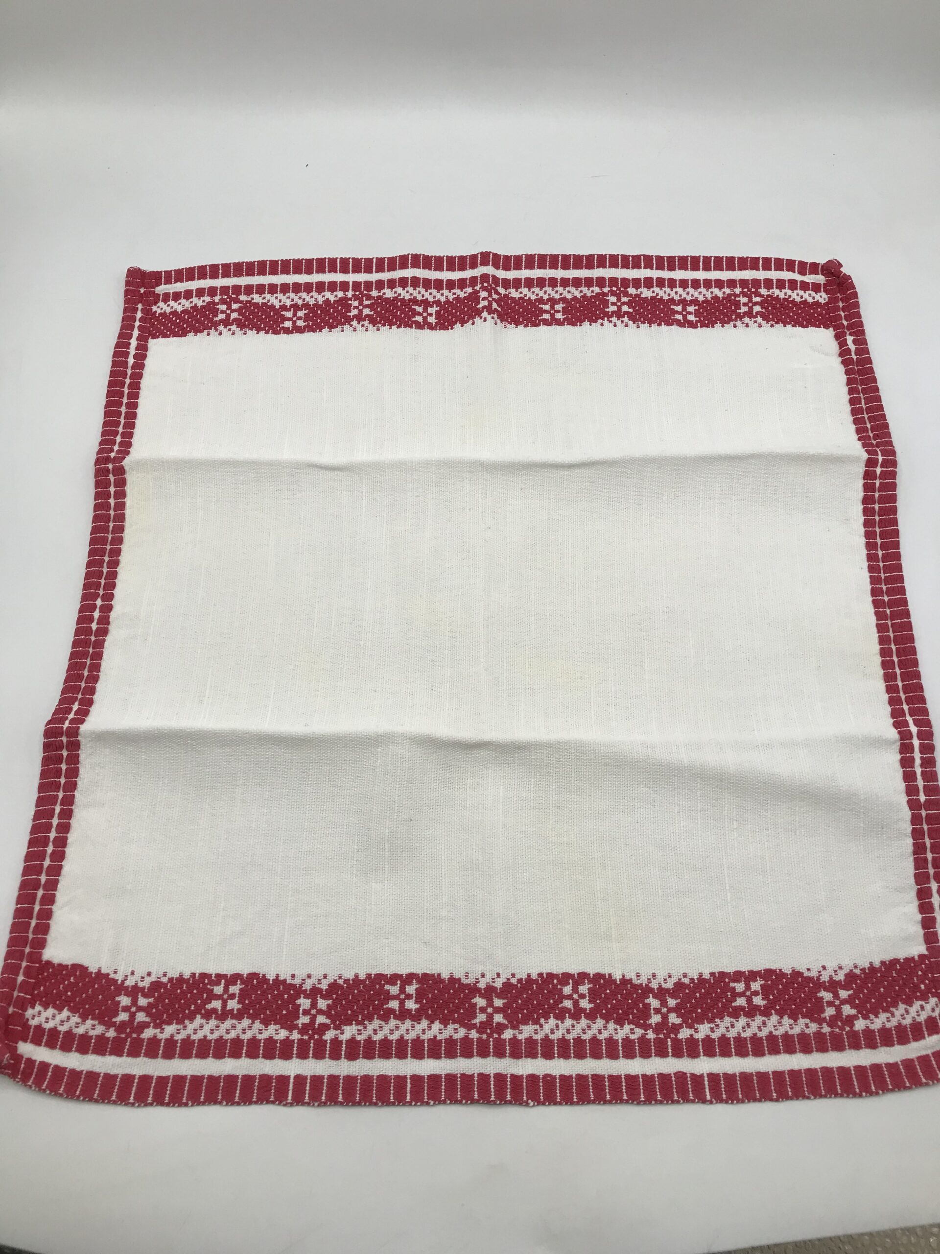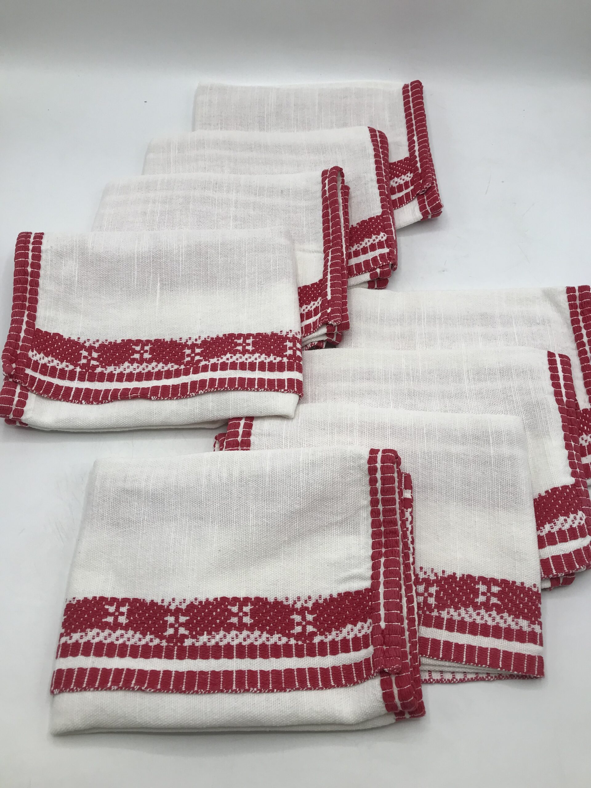 Alerte pépite !!!!! superbe ensemble nappe et serviette brodées, de couleur rouge et blanche. Magnifique lot, une nappe de forme ovale, avec au milieu en bandeau de la broderie traversante rouge aux motifs géométriques. La nappe mesure 2 m de longueur par 1,50 m de largeur. Cette nappe est accompagnée de 8 petites serviettes de table de taille 41 x 44 cm. Le tout est de couleur blanche avec broderie rouge. Une ou deux petites taches du au temps sont à prévoir mais rien de vraiment notable, l’ensemble est dans un très bon état. De quoi habiller vos tables pour de belles occasions.