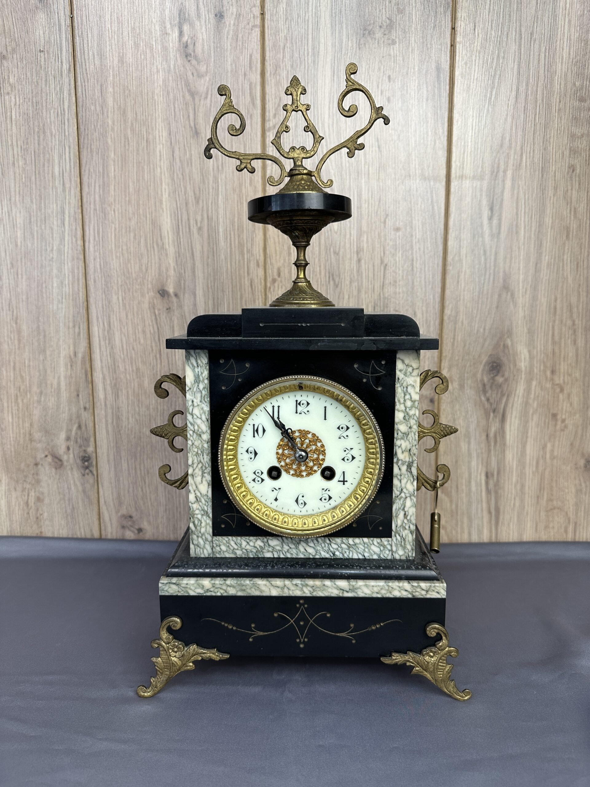 Pendule noire avec détails en marbre plus clairs, et autres détails dorés (peut-être en bronze). Magnifique cadran et clé fournie avec.