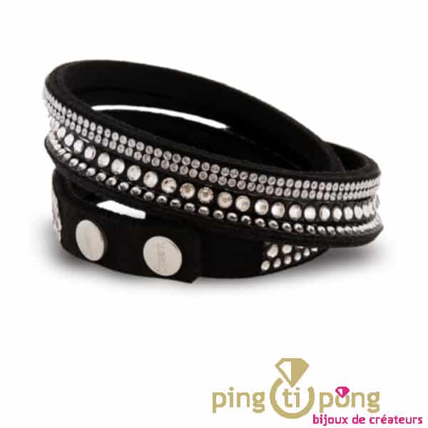 Ce bijou noir et blanc comporte 4 rangées de cristaux de Swarovski de tailles différentes. Les cristaux de ce bracelet en Swarovski sont montés sur une lanière en Alcantara, le célèbre tissu haute couture si beau et doux à porter. Ces bracelets originaux 2 tours font clairement partis des plus belles créations de SPARK souvent copiées jamais égalées.