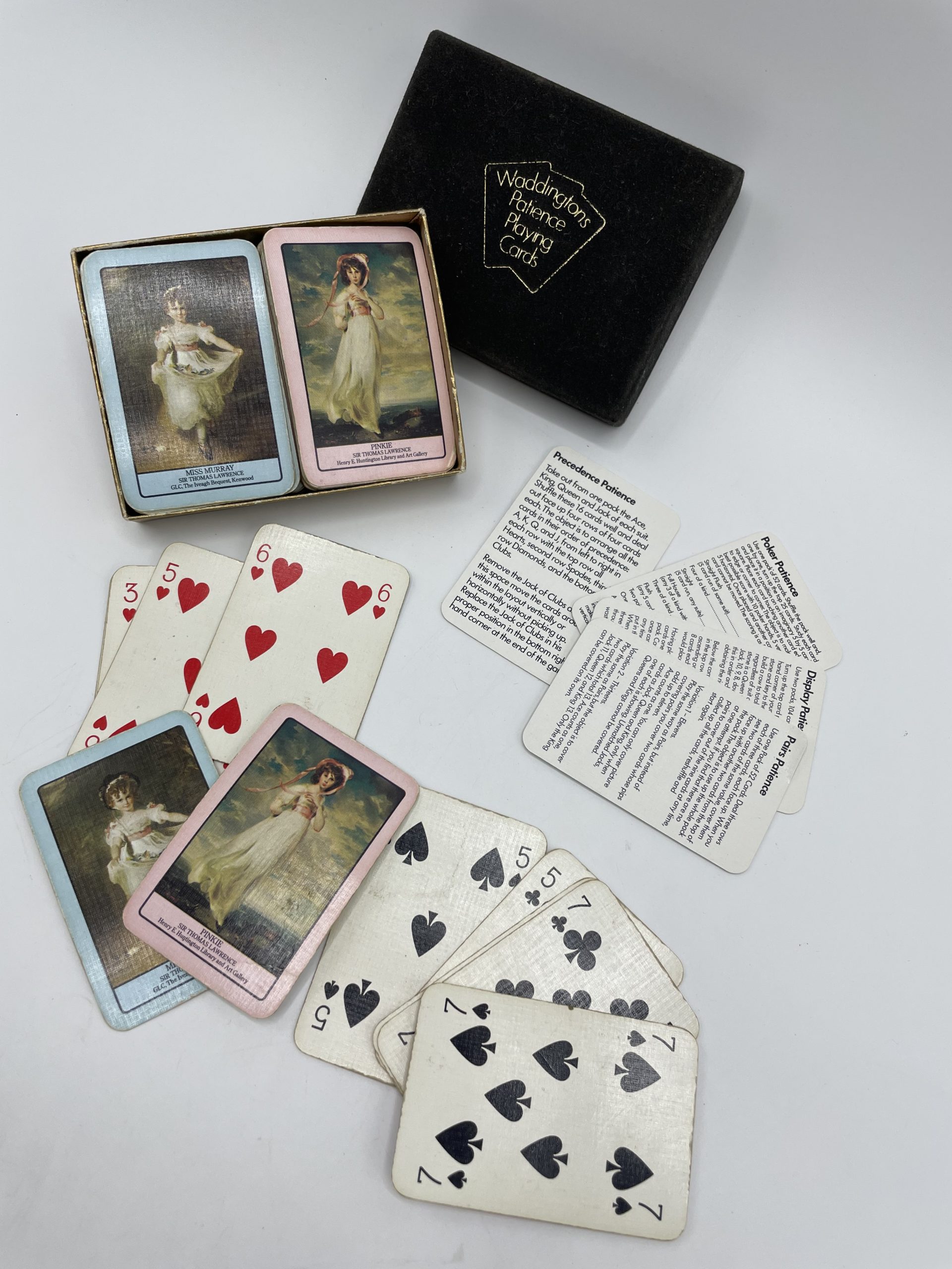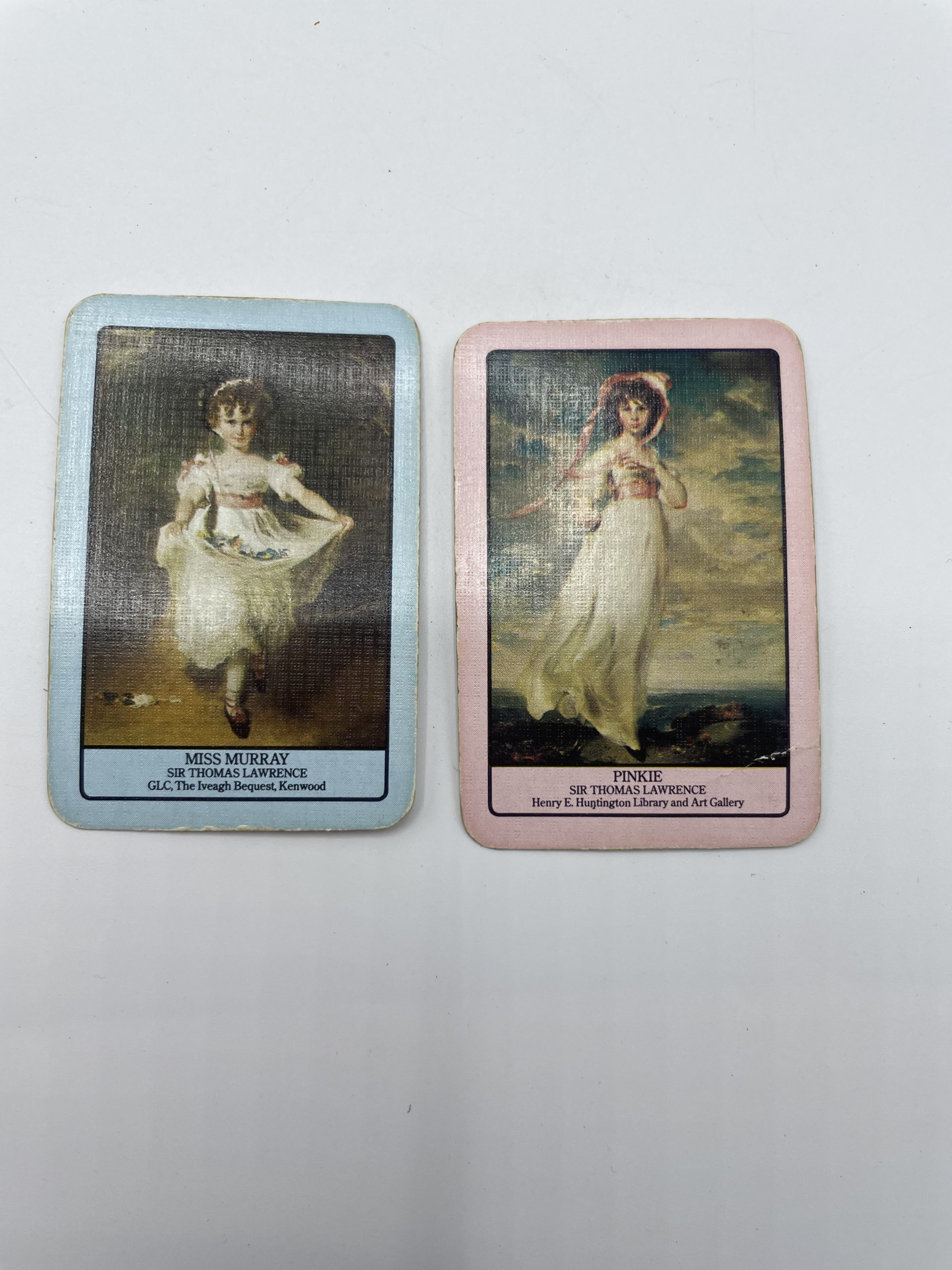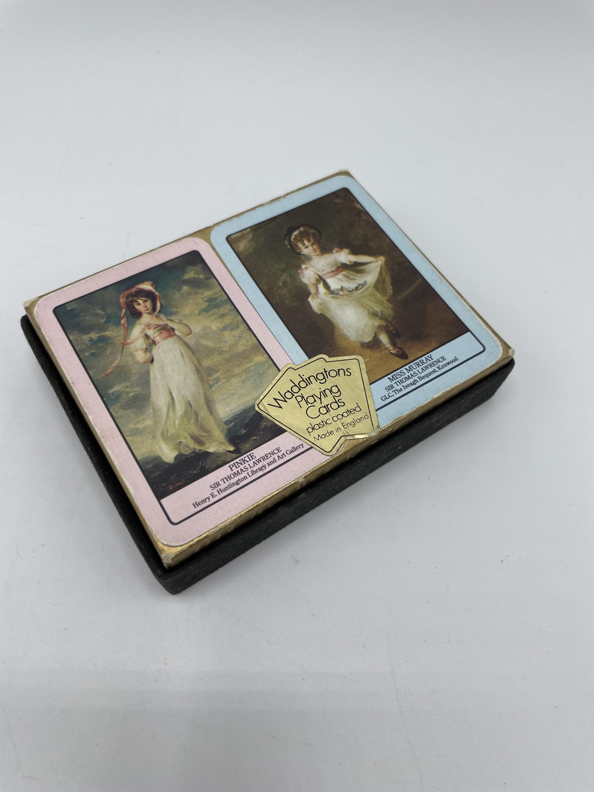 Coup de cœur pour ce jeu de cartes vintage des années 80. C’est une édition spéciale de la maison anglaise Waddingtons. Ce jeu de cartes complet est composé de 2 jeux de cartes, de 52 cartes reproduisant deux tableaux du peintre Sir Thomas Lawrence. Les portraits « Pinkie » et « Miss Murray ». 4 règles de jeux de patience sont fournies avec le jeu. Livré dans sa boîte d’origine en feutre, ce jeu de cartes angalis vintage est à collectionner !