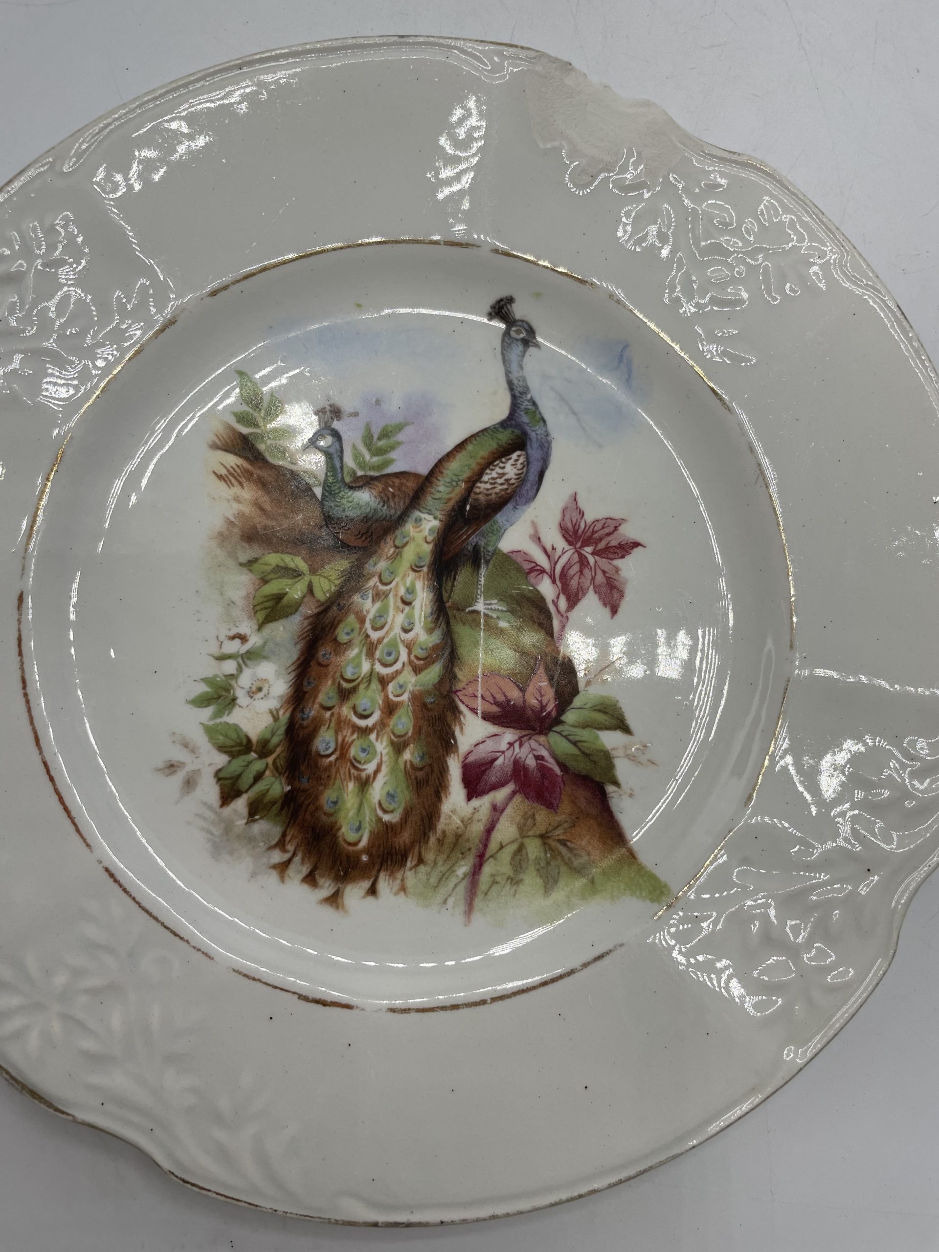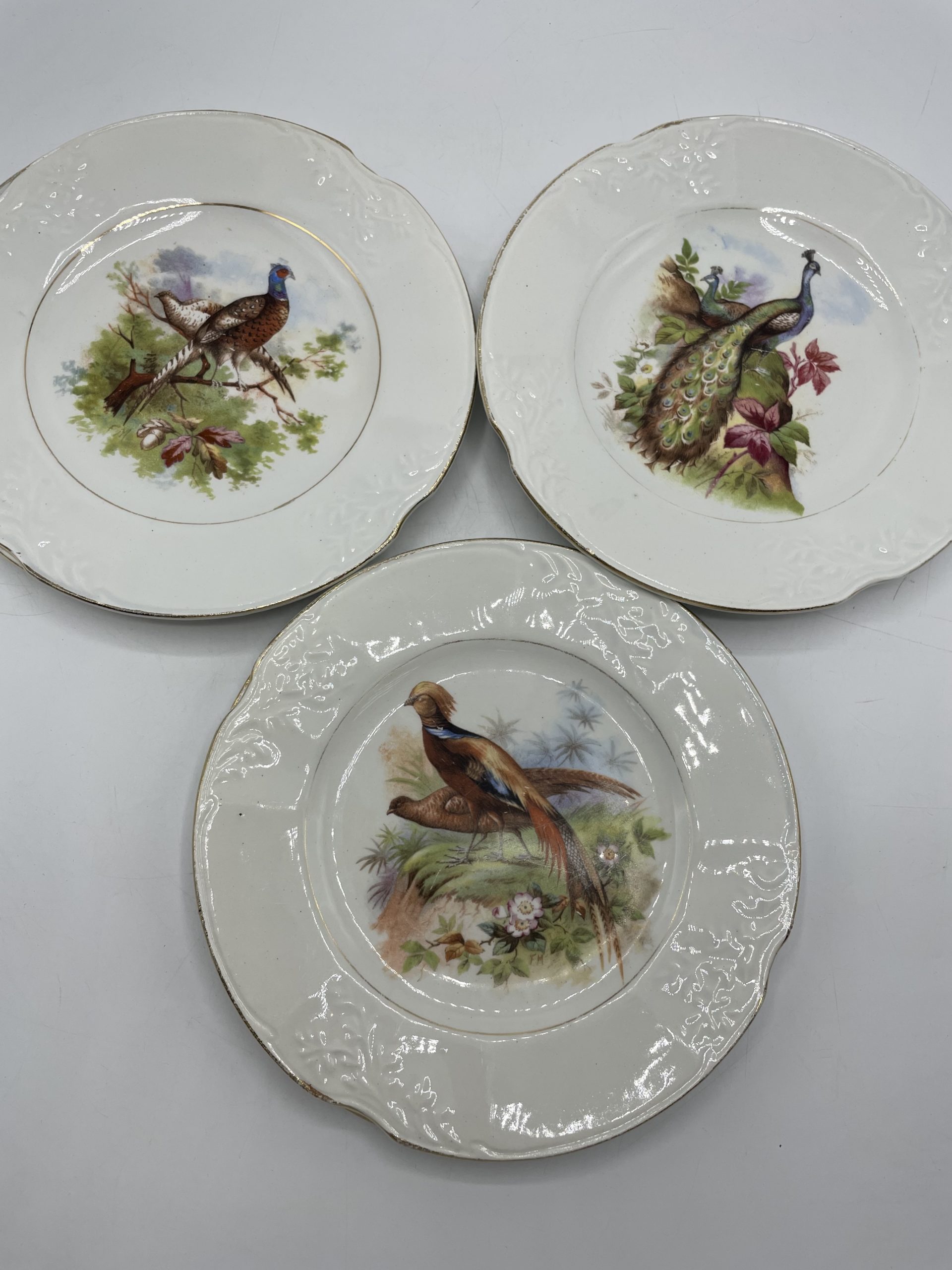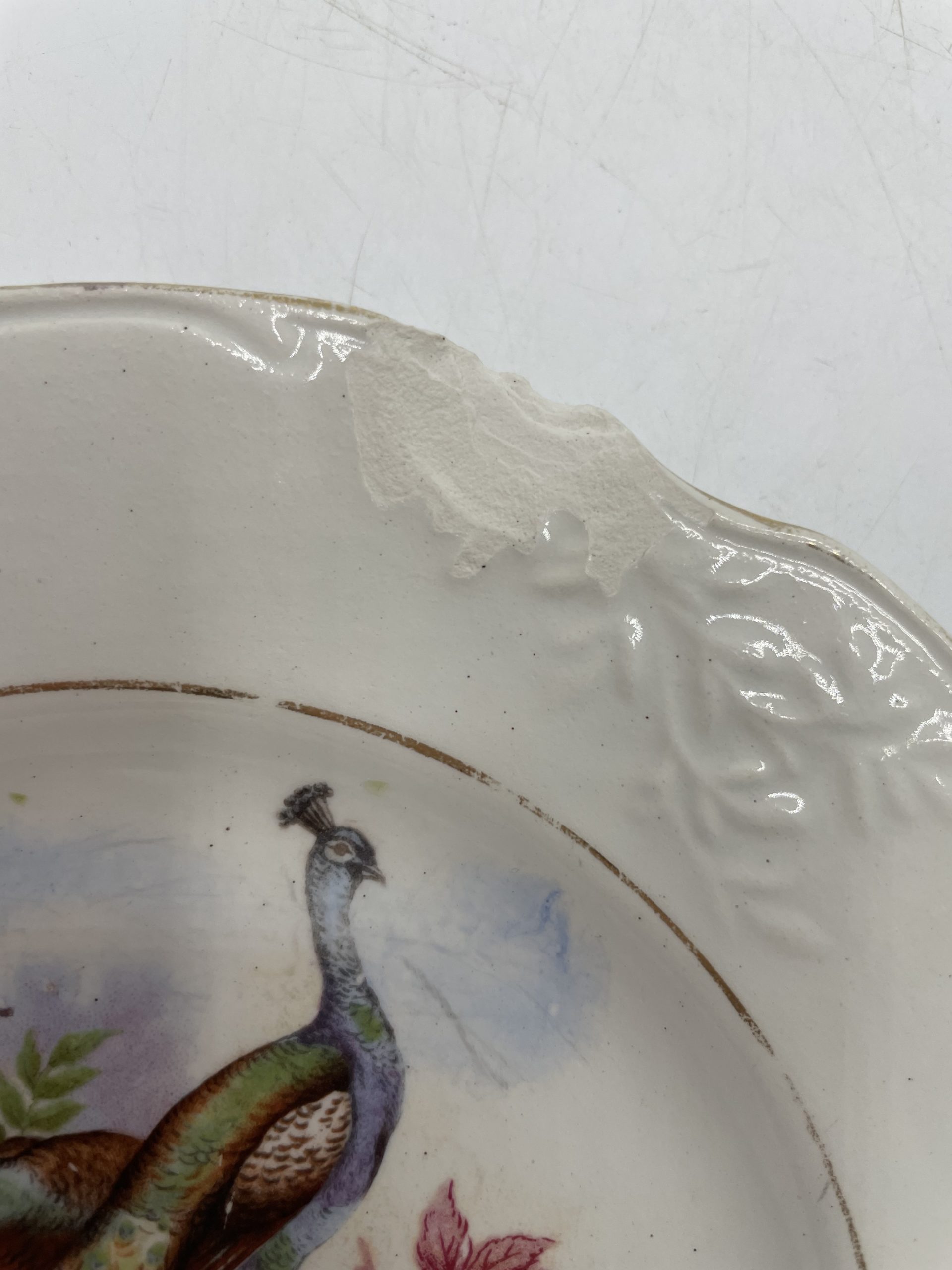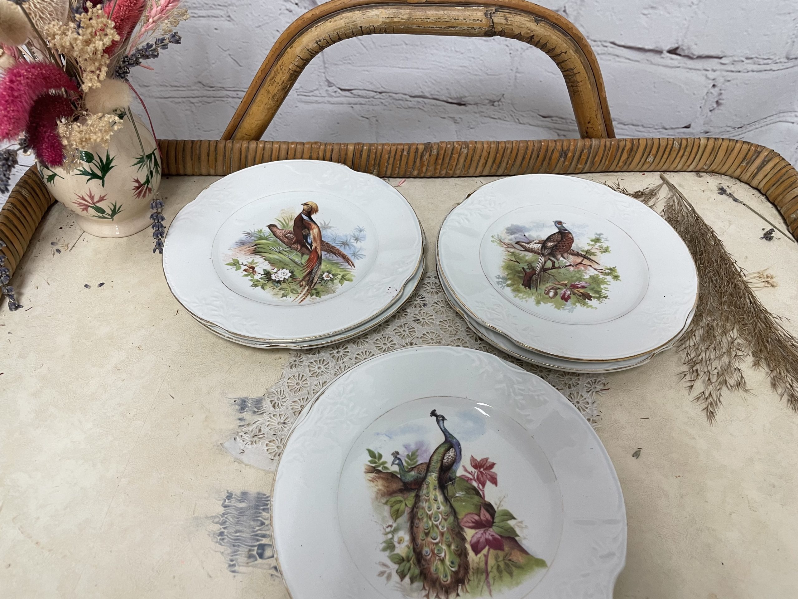 Ce joli lot se compose de 6 petites assiettes vintage. En faïence, ces assiettes sont estampillées Moulin des Loups Hamage Orchie. De couleur blanche, les assiettes une forme particulière et elles sont décorées de motifs d’oiseaux : paons, perdrix et faisans, et de liserés dorés. Vintage, des traces d’usure sont à prévoir ainsi qu’un éclat sur une des assiettes paons. Une jolie collection à la fois champêtre et élégante !