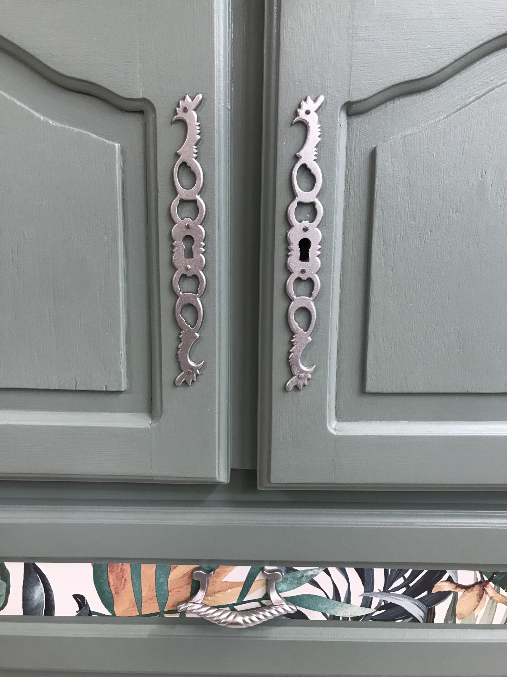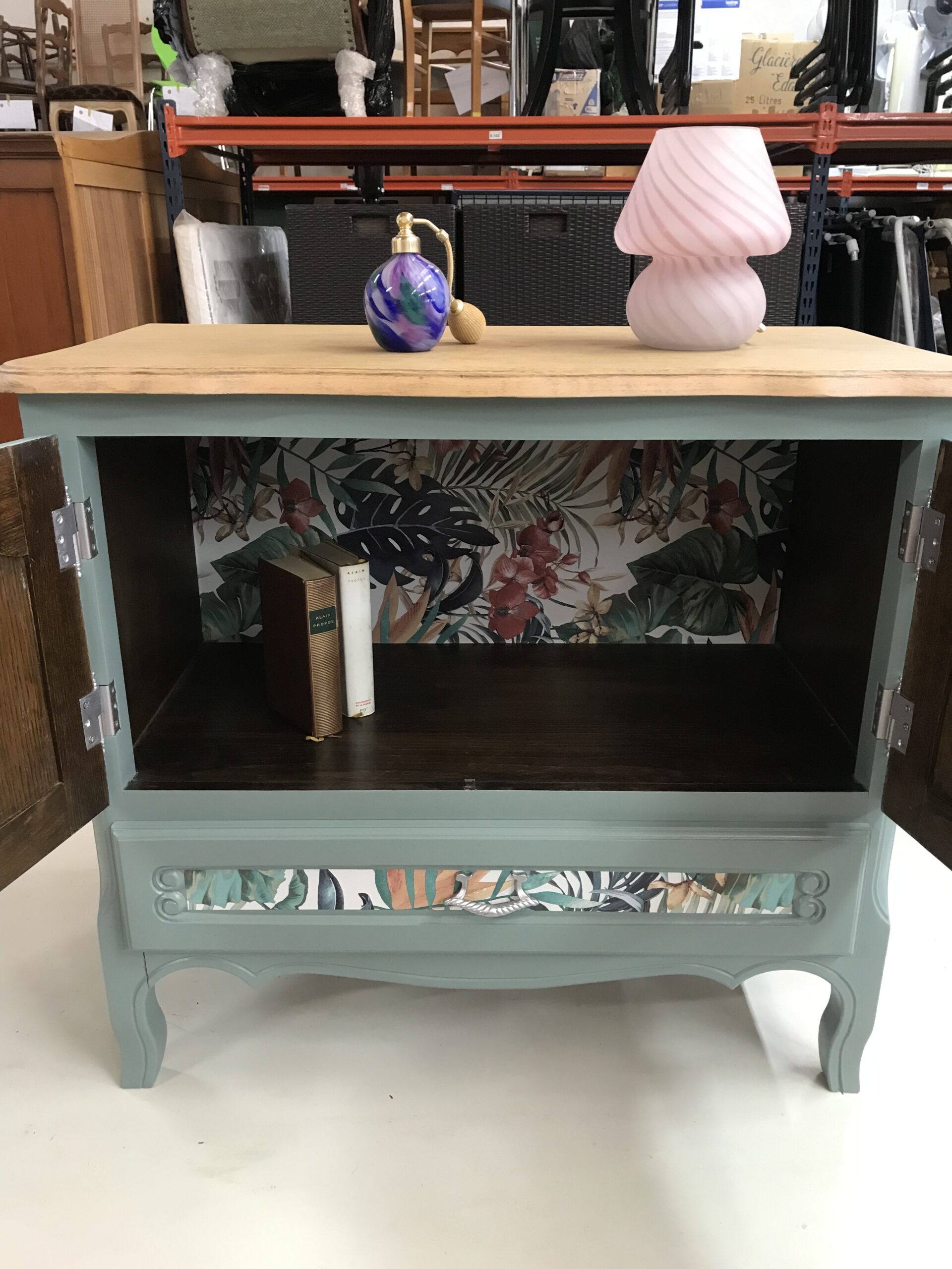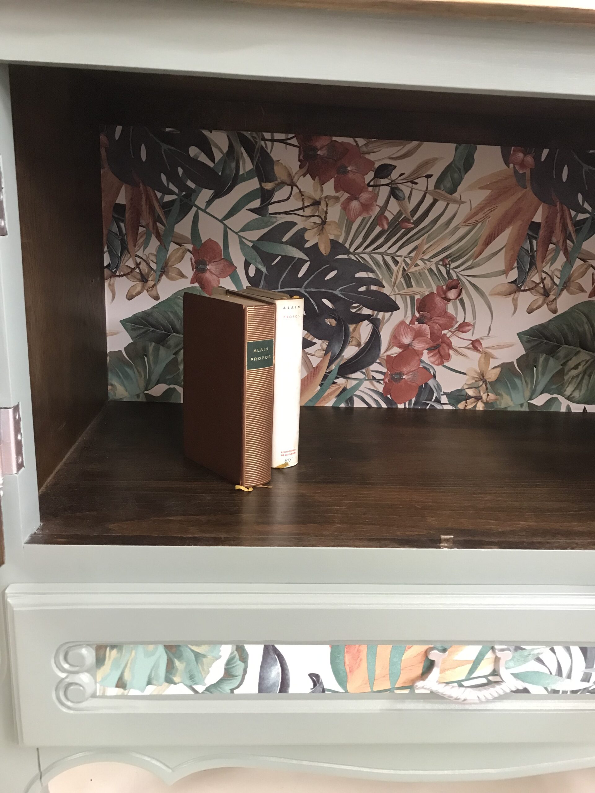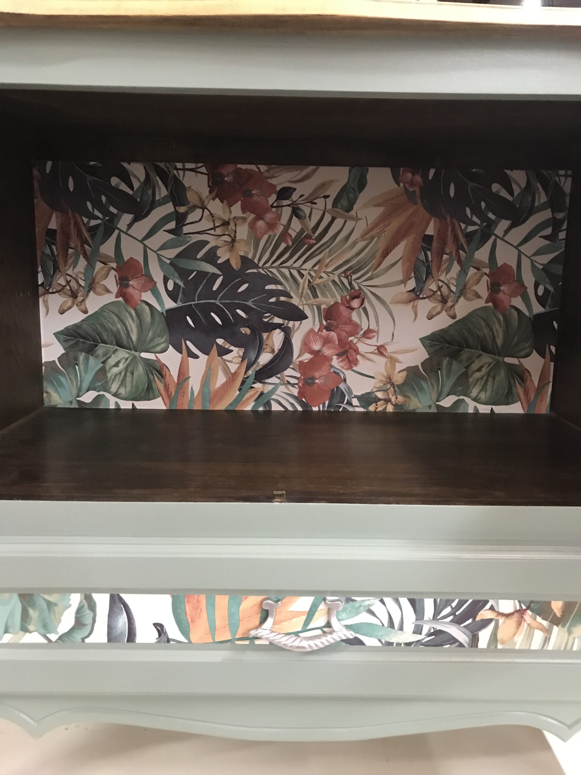 Premier meuble de l’atelier, petit meuble très pratique qui peut se faufiler partout. Le plateau a été sablé, la quincaillerie changée. Deux couches de peintures et deux couches de vernis ont été posées. Utilisation d’un papier peint floral pour le fond.. Il est tout beau 🥰.