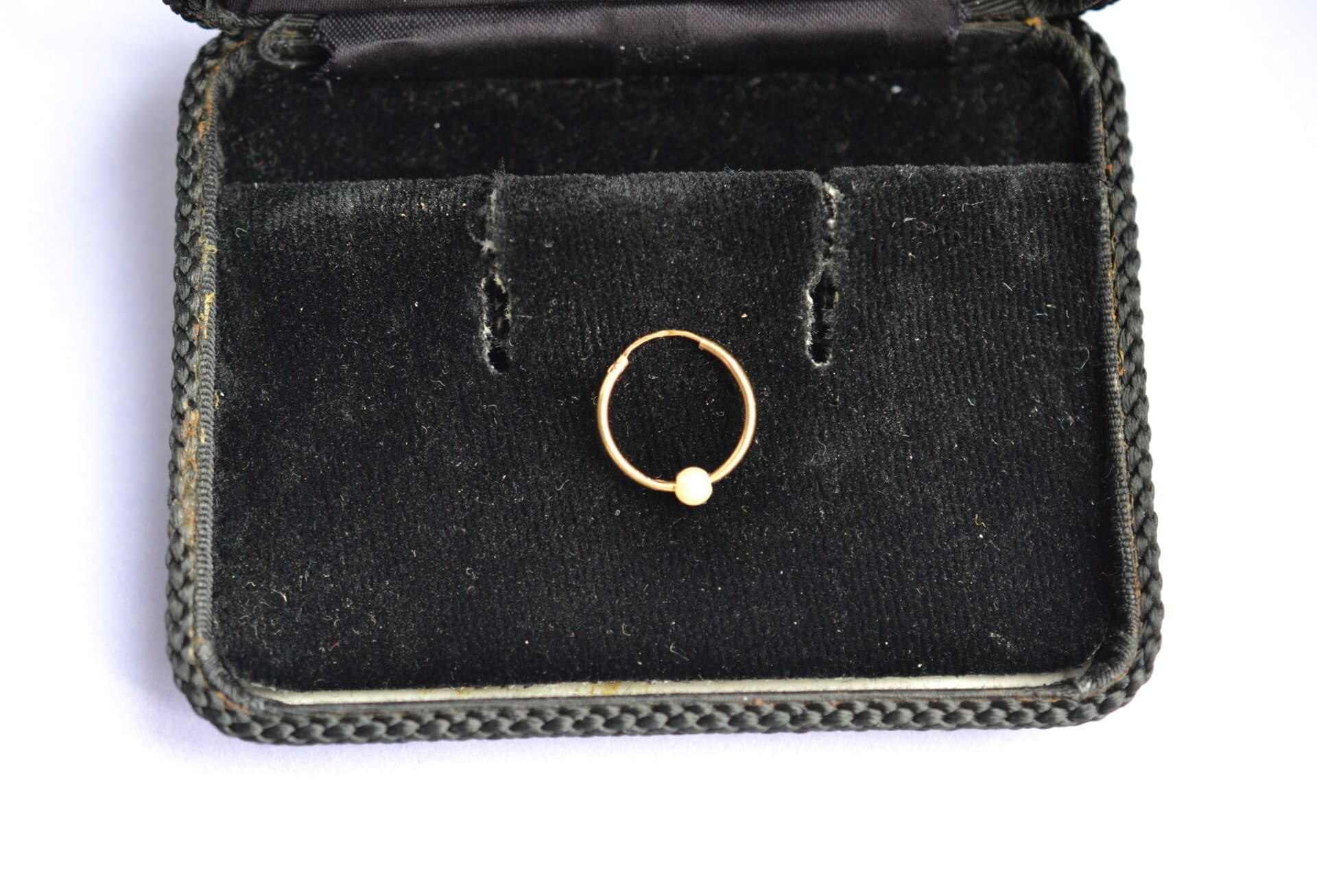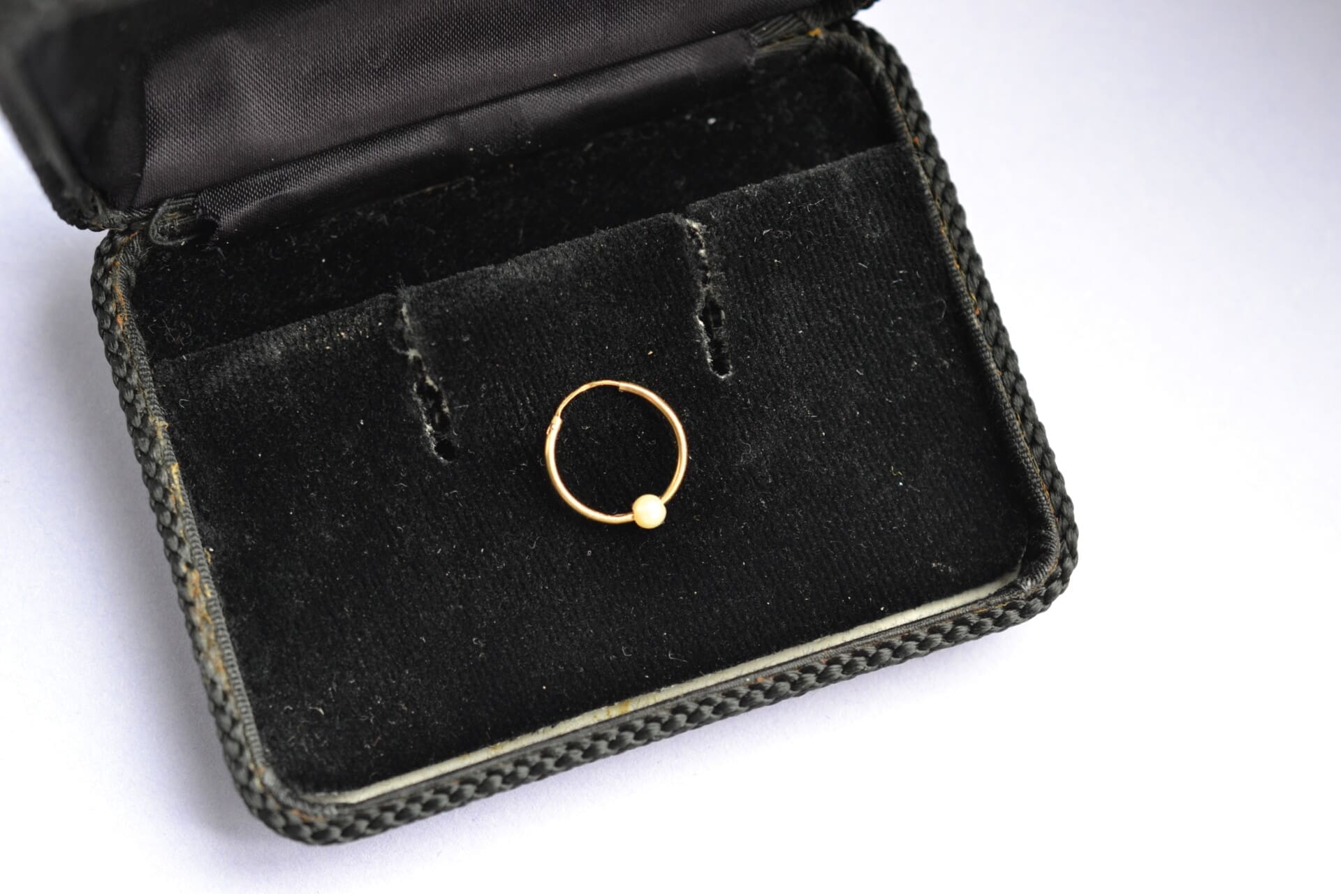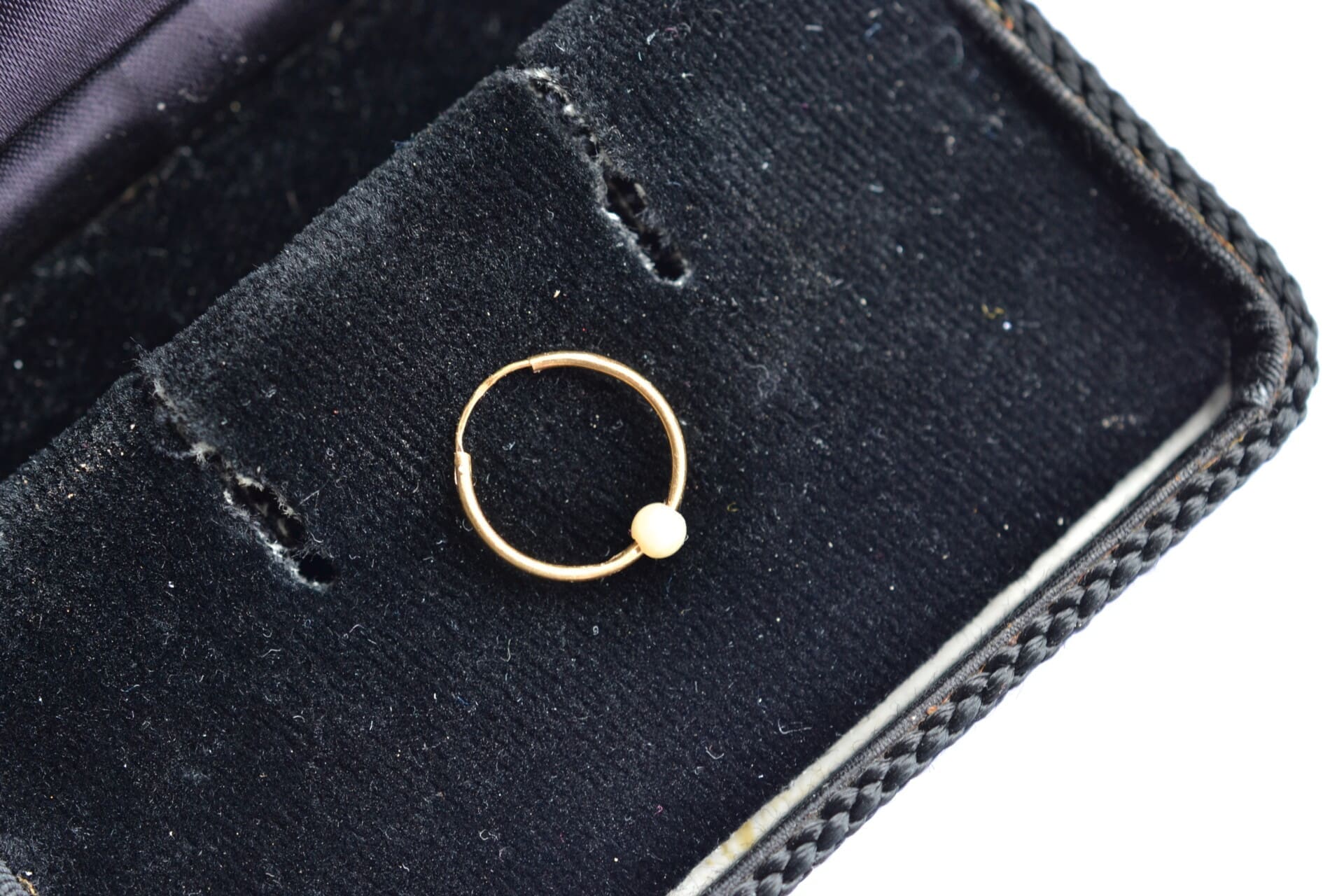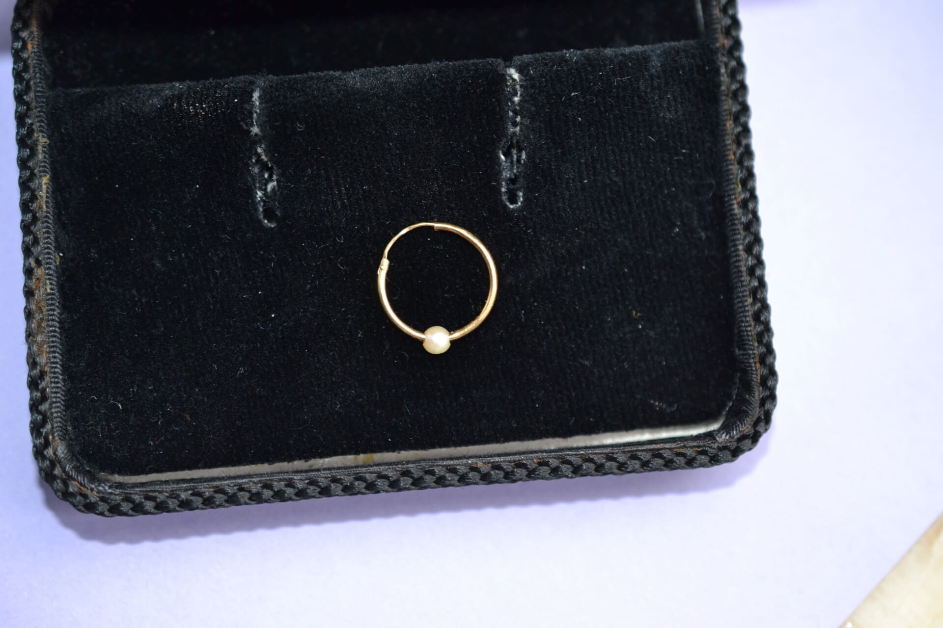 Nos bijoux ont eu une première vie, ils sont en bon état, mais parfois, peuvent comporter quelques irrégularités, celles du temps qui passe, ici on note un léger poc sur l’anneau (l’imperfection est peu visible car cachée par la perle)