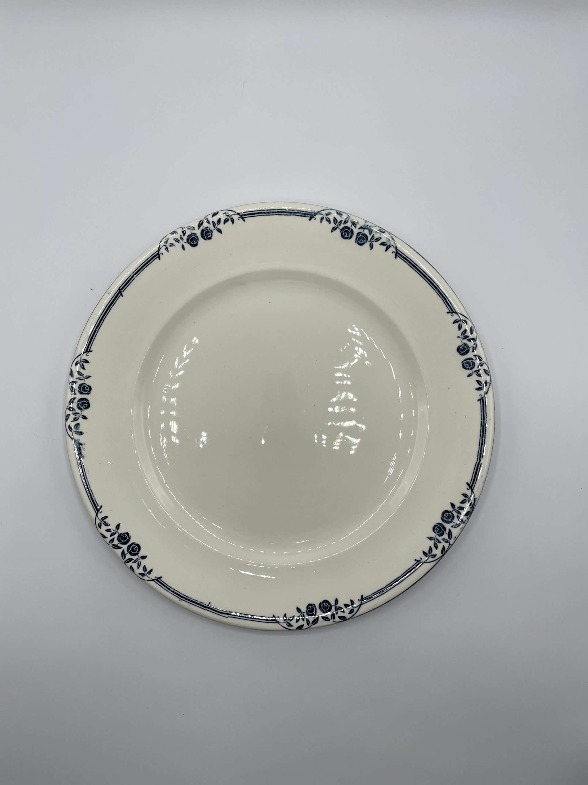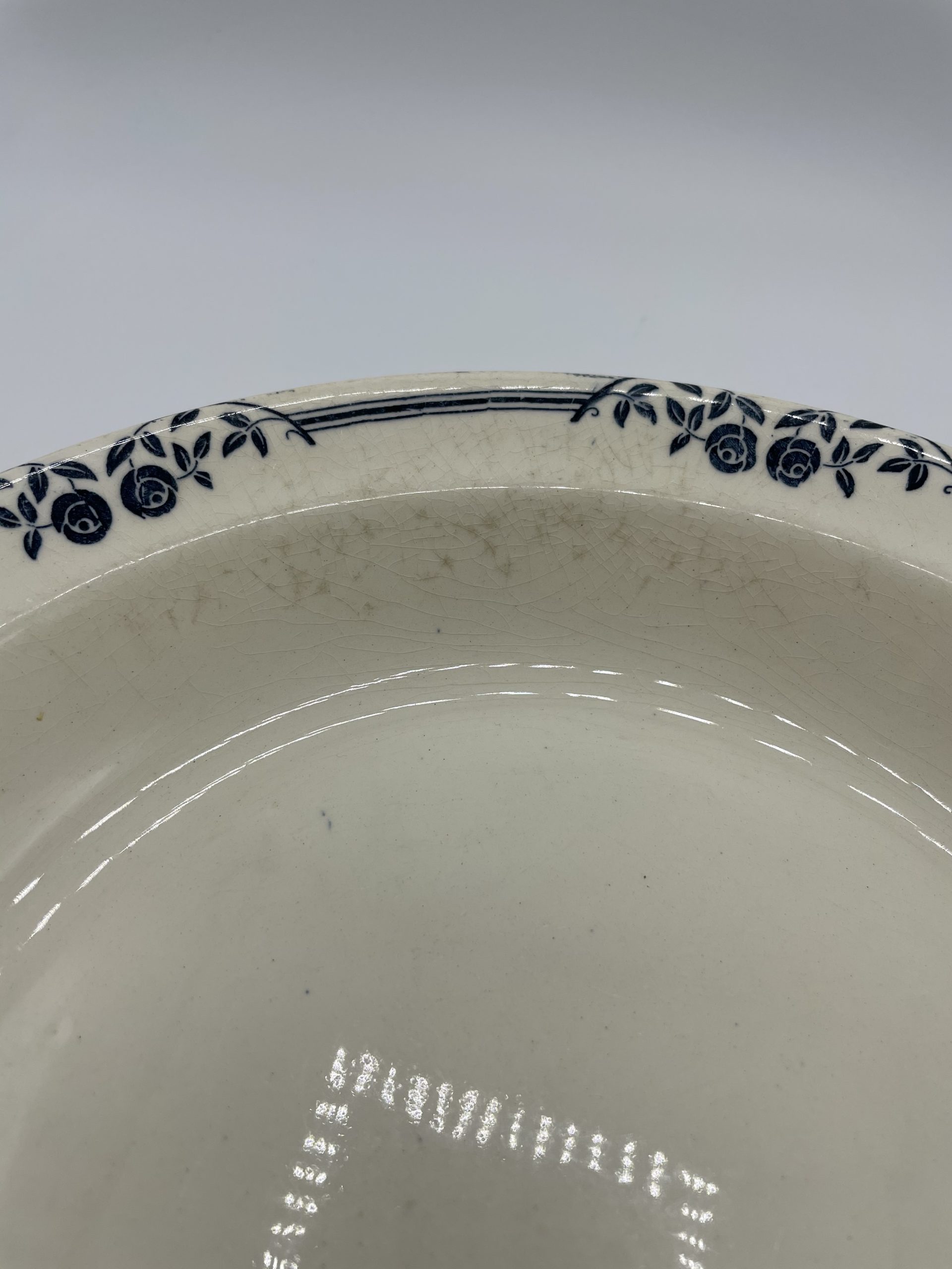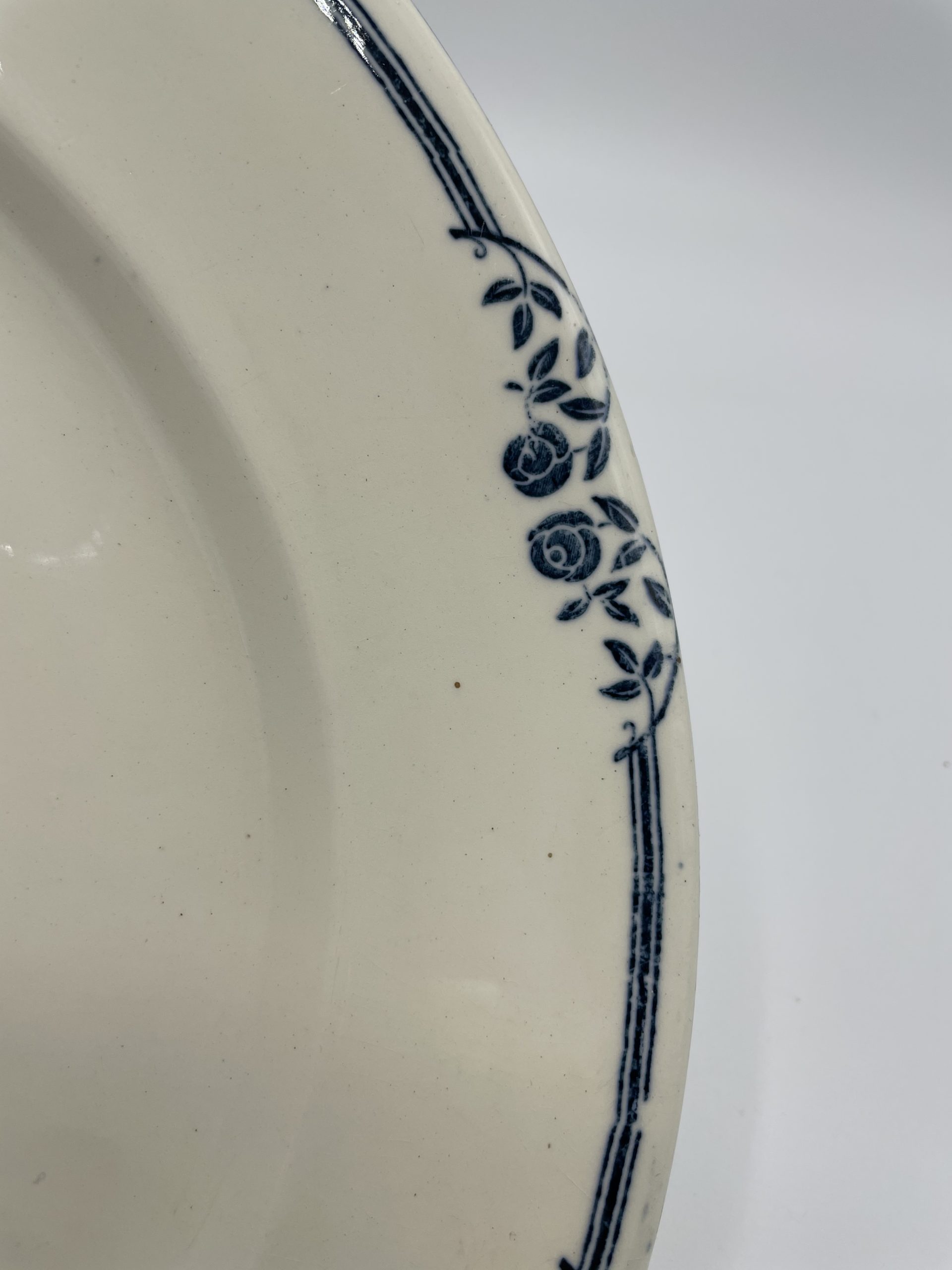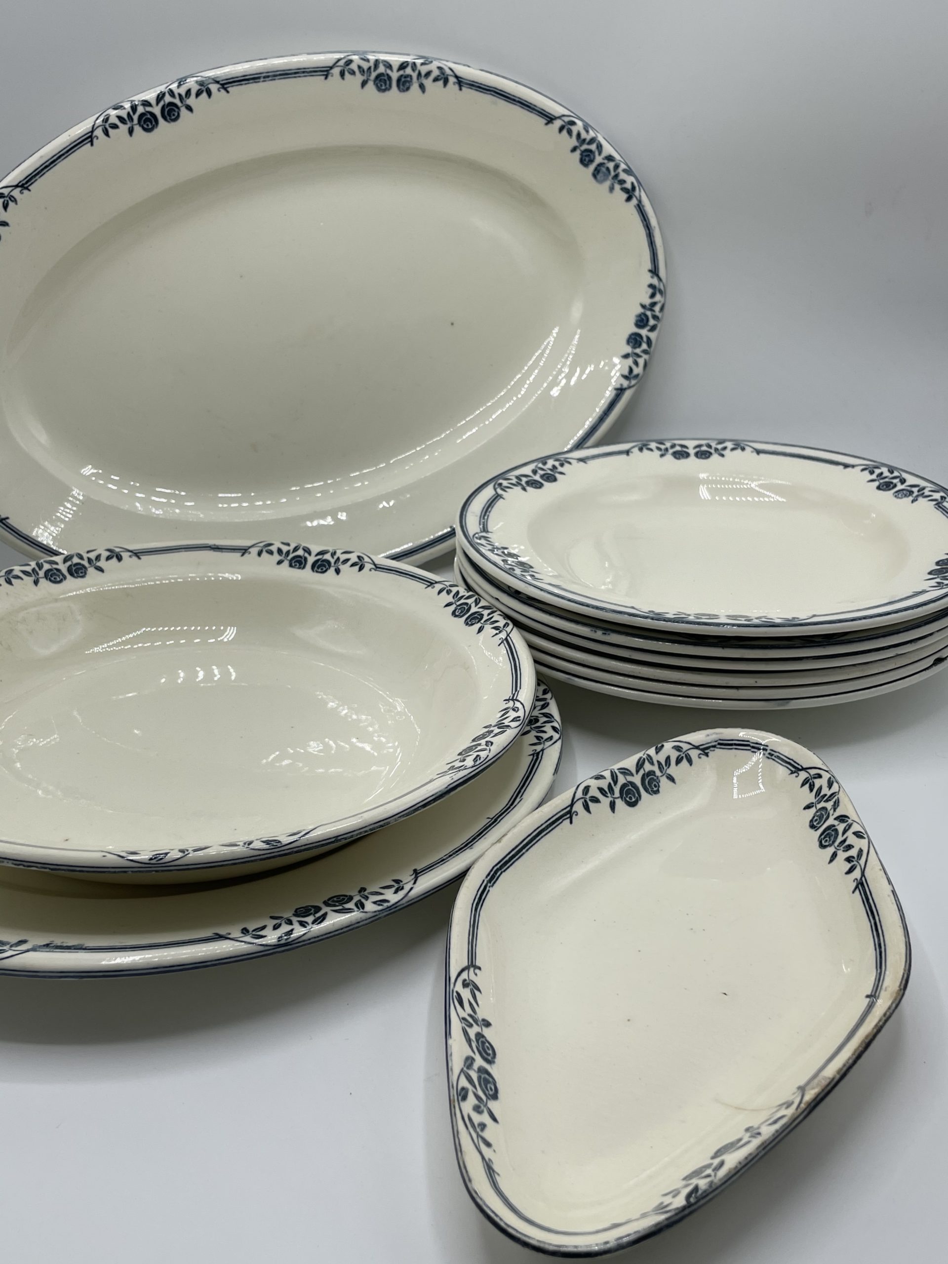 Ce joli service terre de fer estampillé « SALINS E.C. » est composé de 6 assiettes, d’1 petit plat n losange, d’1 plat à service, d’1assiette de présentation creuse et d’1 assiette de présentation plate. Le service est décoré avec une frise de roses de jardin de couleur bleue, typique des services terre de fer. Quelques traces d’usure et tâches sont à relever – tâches, petites marques – (cf photos), jolis témoins du temps passé. Avec son look intemporel et discret, ce service décorera votre table pour toutes les grandes occasions comme votre quotidien !