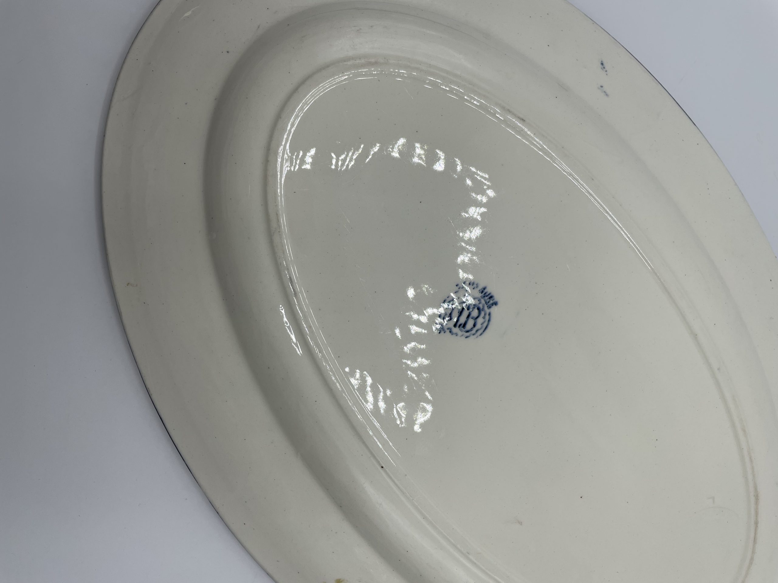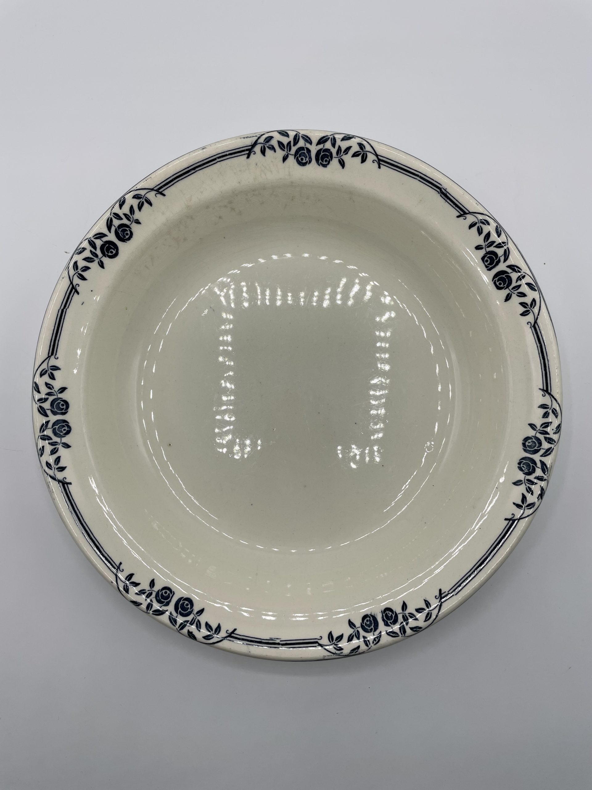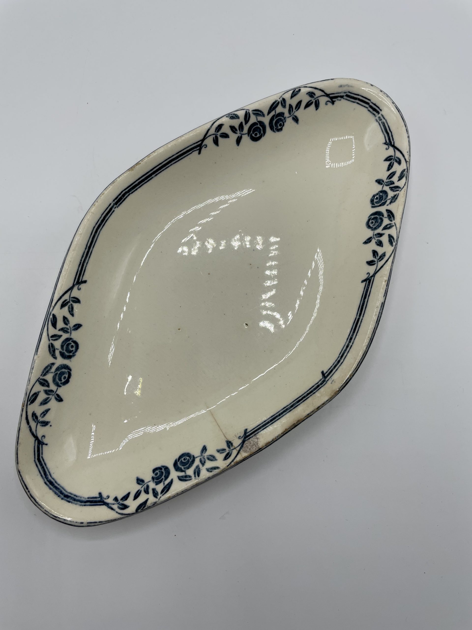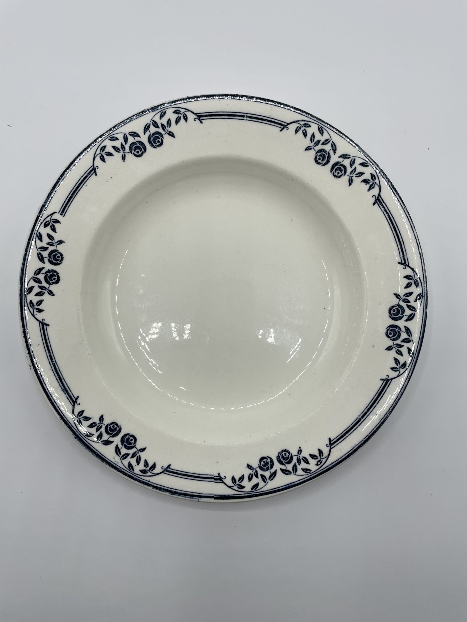 Ce joli service terre de fer estampillé « SALINS E.C. » est composé de 6 assiettes, d’1 petit plat n losange, d’1 plat à service, d’1assiette de présentation creuse et d’1 assiette de présentation plate. Le service est décoré avec une frise de roses de jardin de couleur bleue, typique des services terre de fer. Quelques traces d’usure et tâches sont à relever – tâches, petites marques – (cf photos), jolis témoins du temps passé. Avec son look intemporel et discret, ce service décorera votre table pour toutes les grandes occasions comme votre quotidien !