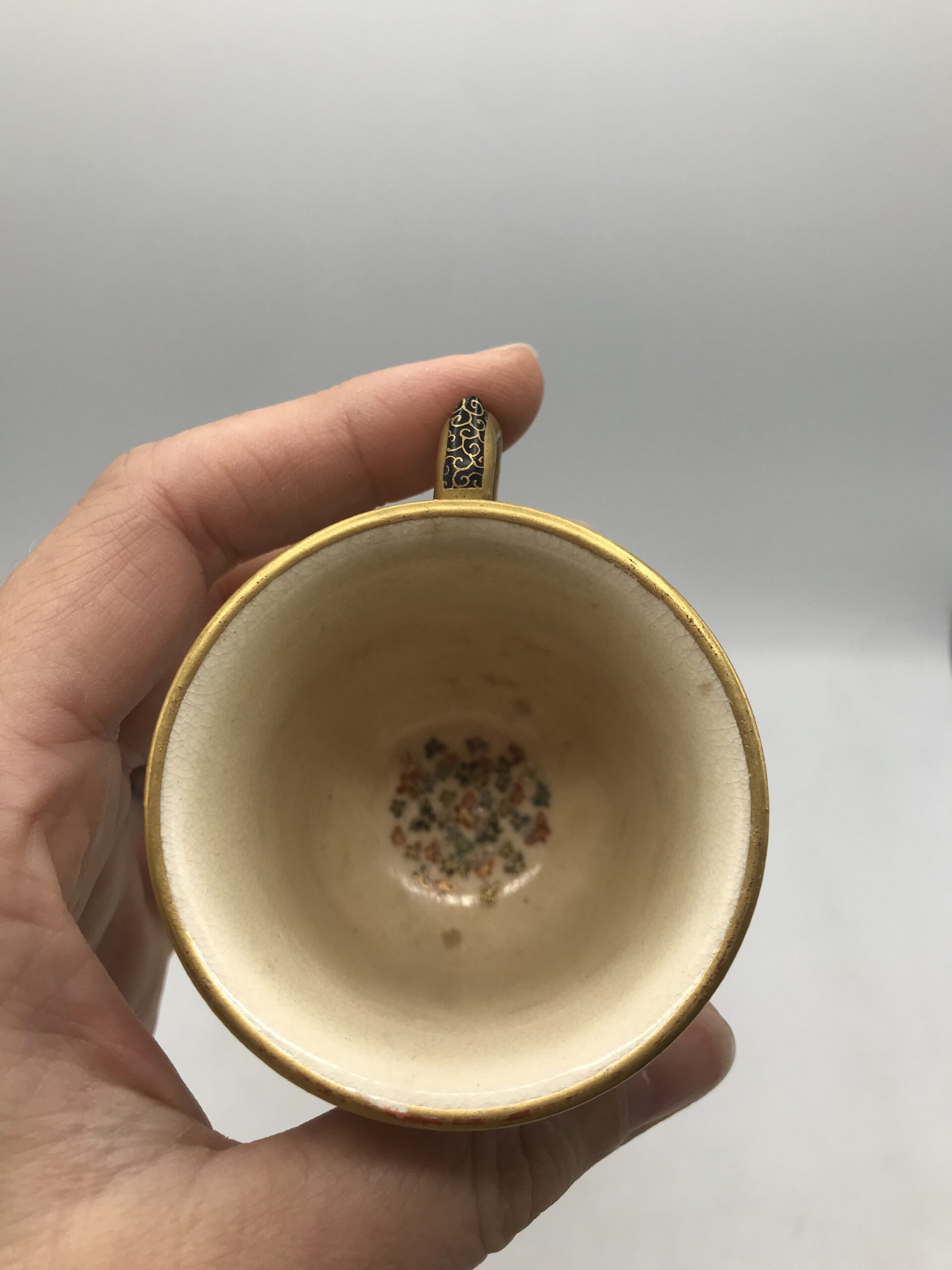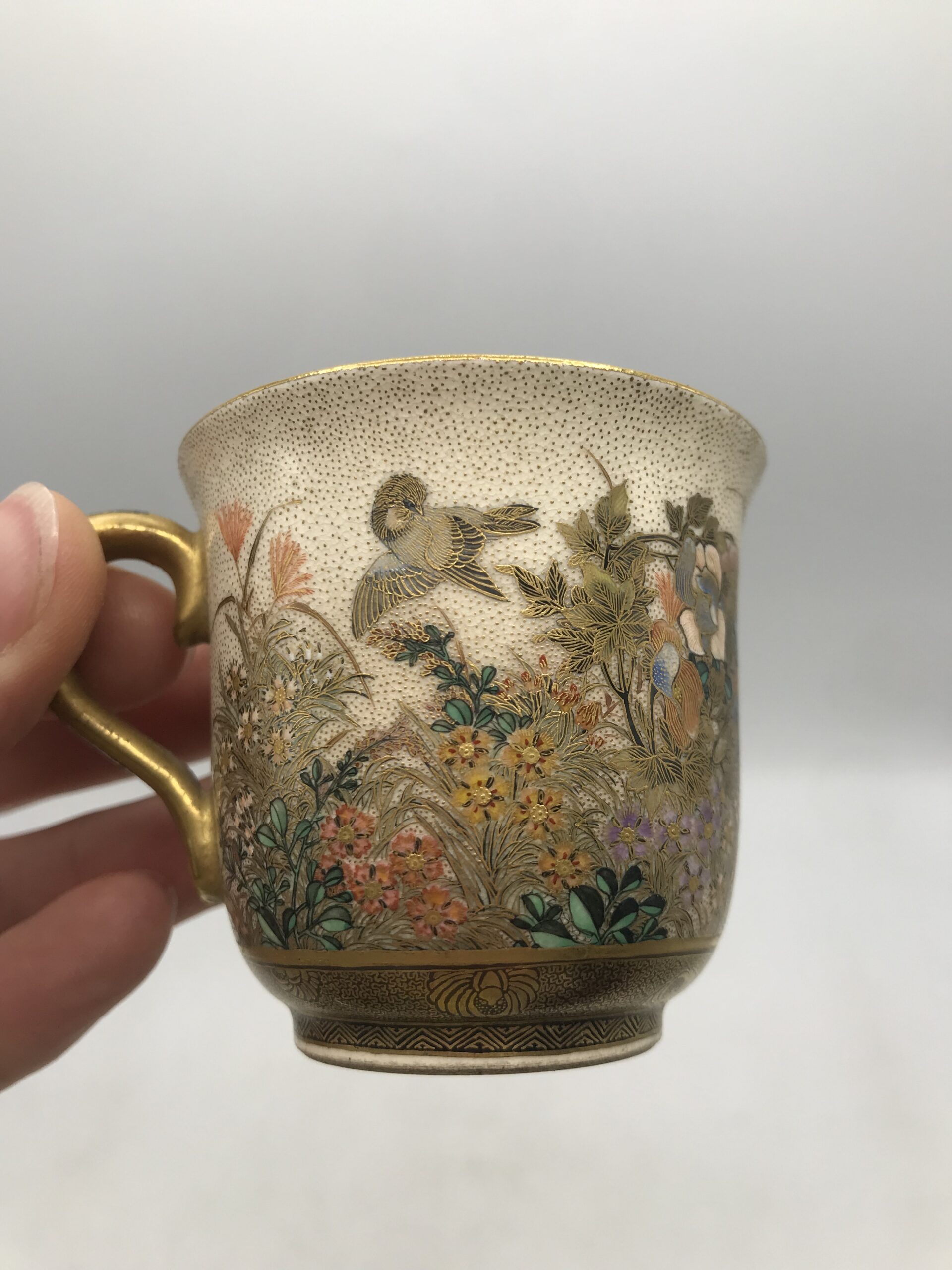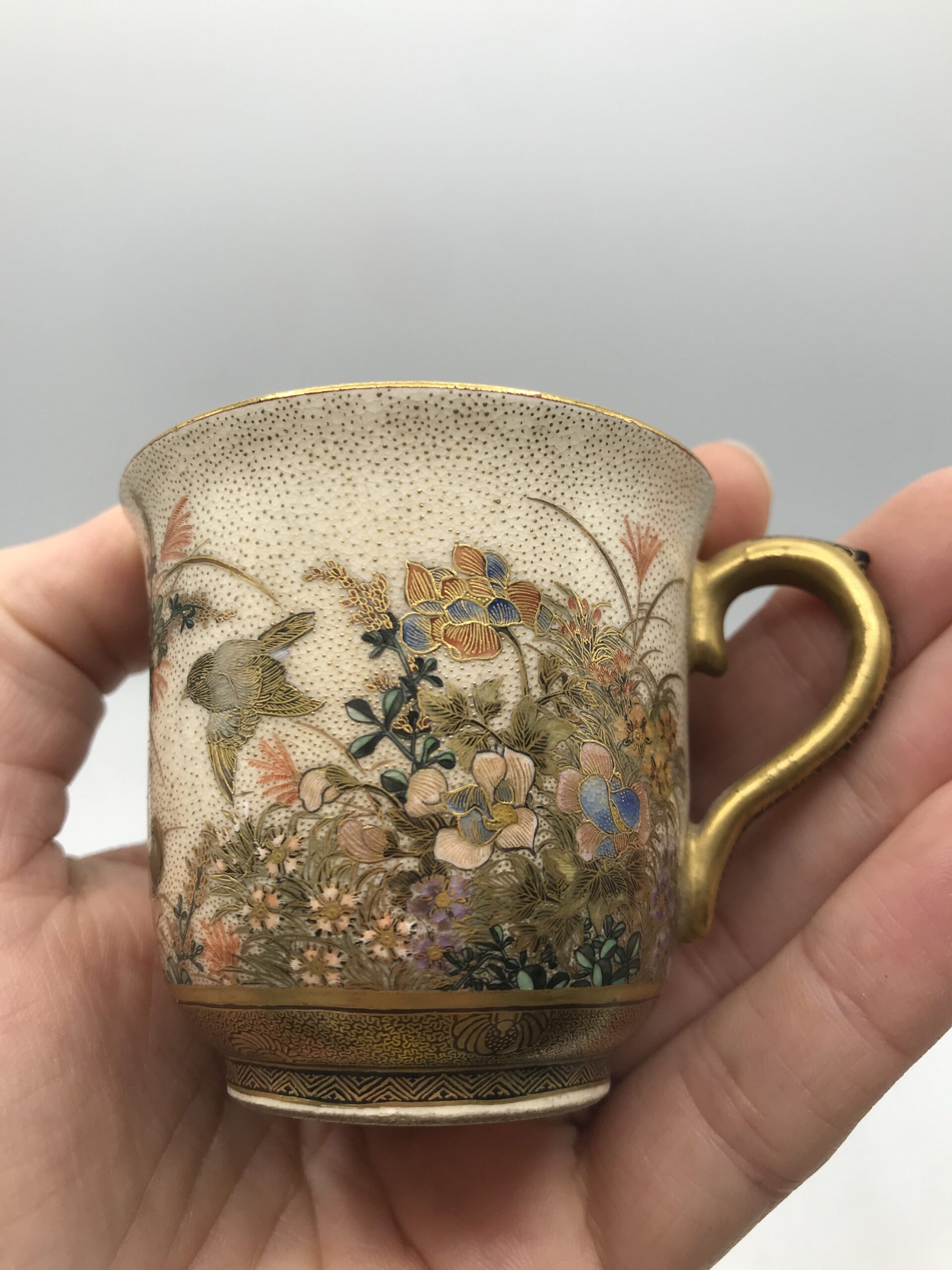 Alerte pépite !!! Tasse à café Satsuma hirondelles. Voici un ensemble tasse et sous tasse de toute beauté. Tasse à café Satsuma et sa sous tasse, la tasse a un diamètre de 6 cm pour une hauteur de 5,5 cm et la sous tasse a un diamètre de 11 cm pour une hauteur de 2 cm. Ces pièces sont de vraies beautés, la tasse est habillée et sublimée par des illustration des multiples fleurs accompagnées d’hirondelles. La sous tasse est elle aussi une petite œuvre d’art à part entière. C’est une vraie prouesse d’artiste que de faire rentrer ce paysage fourni sur des si petites surfaces. Je vous laisse admirer tous les détails et les subtilités de cette mini fresque sur vaisselle. La signature est en dessous des pièces (cf photos). Amateurs de vaisselle unique vous allez craquer. Chineurs et amateurs de café, ce duo tasse et sous tasse est pour vous. L’ensemble ne porte pas de fêlure, une légère patine s’invite du au temps, ce qui la rend encore plus jolie. Le charme de la vaisselle ancienne.