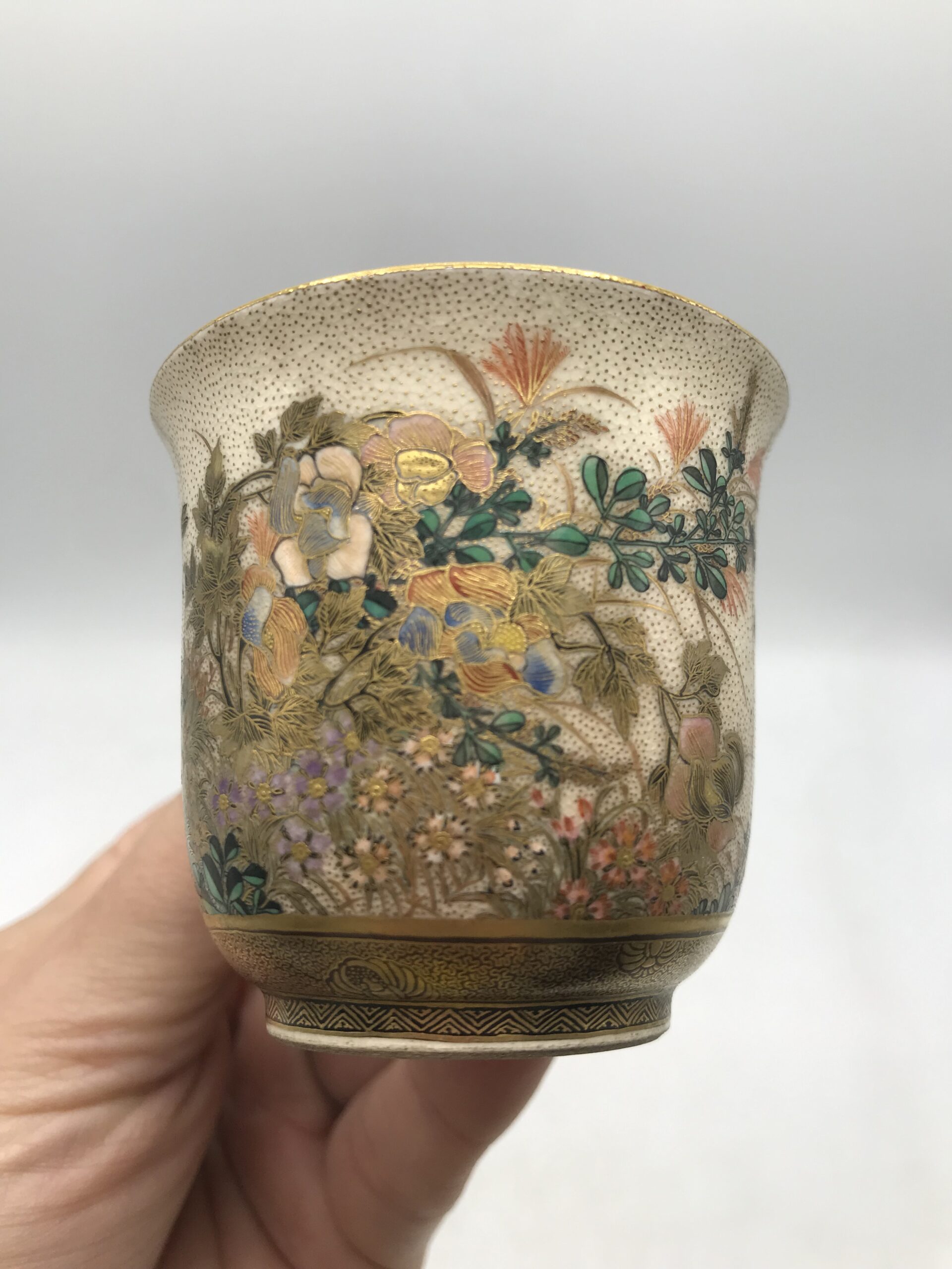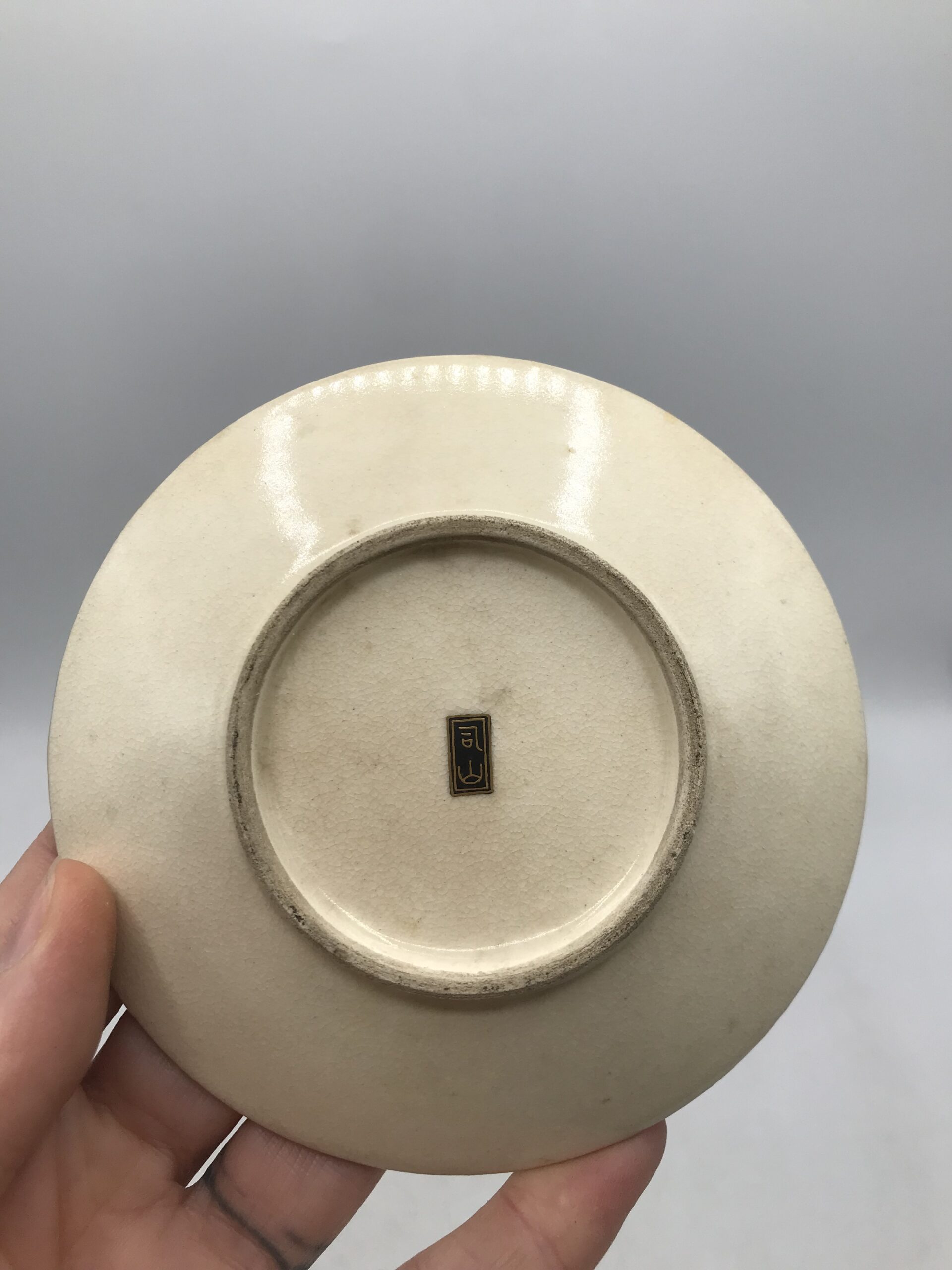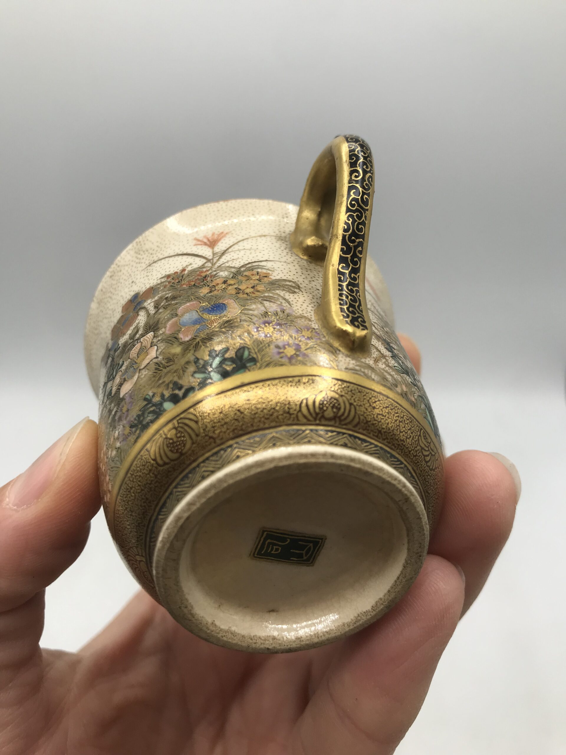 Alerte pépite !!! Tasse à café Satsuma hirondelles. Voici un ensemble tasse et sous tasse de toute beauté. Tasse à café Satsuma et sa sous tasse, la tasse a un diamètre de 6 cm pour une hauteur de 5,5 cm et la sous tasse a un diamètre de 11 cm pour une hauteur de 2 cm. Ces pièces sont de vraies beautés, la tasse est habillée et sublimée par des illustration des multiples fleurs accompagnées d’hirondelles. La sous tasse est elle aussi une petite œuvre d’art à part entière. C’est une vraie prouesse d’artiste que de faire rentrer ce paysage fourni sur des si petites surfaces. Je vous laisse admirer tous les détails et les subtilités de cette mini fresque sur vaisselle. La signature est en dessous des pièces (cf photos). Amateurs de vaisselle unique vous allez craquer. Chineurs et amateurs de café, ce duo tasse et sous tasse est pour vous. L’ensemble ne porte pas de fêlure, une légère patine s’invite du au temps, ce qui la rend encore plus jolie. Le charme de la vaisselle ancienne.