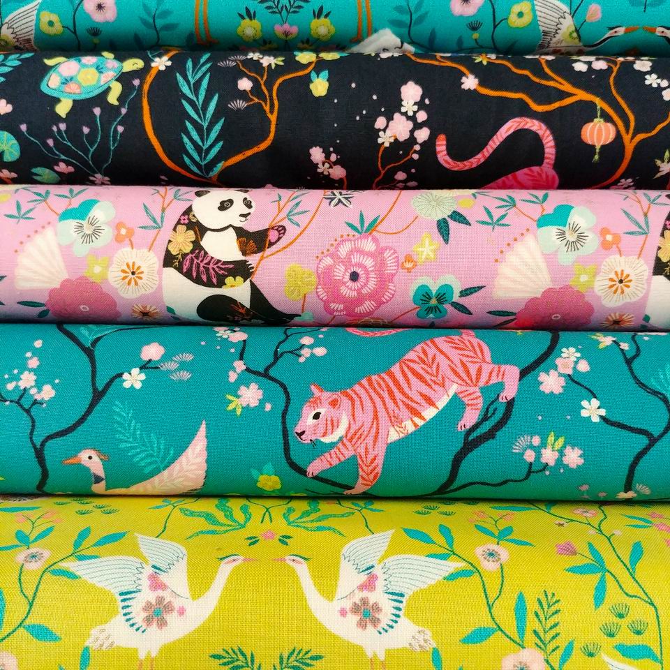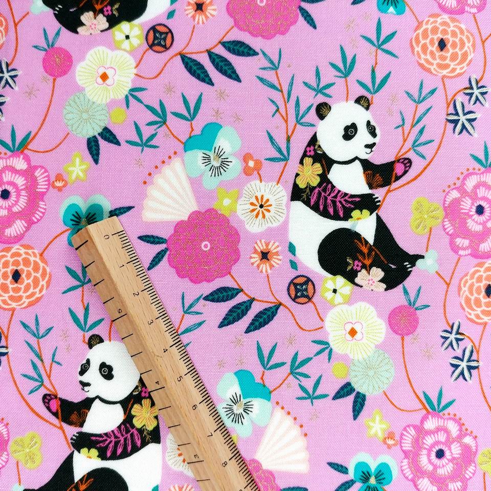 Avec cette touche exotique d’Orient ces imprimés nous font voyager. En effet, les motifs, les couleurs éclatantes et les petites notes de doré métalliques composent un paysage plein de charme. On reconnaît bien l’univers poétique et délicat de Bethan Janine. En effet, tout est travaillé dans le détail et la finesse. On retrouve donc des pandas magiques et féériques, noirs et blancs, au milieu de bambous dans cette opulence de fleurs délicates sur fond pastel lilas.