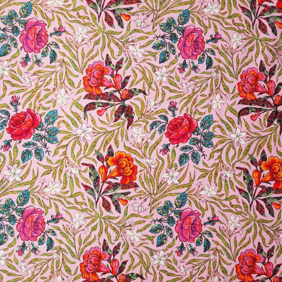 Le tissu intitulé Victorian Rose fait donc partie de la collection d’imprimés Le Langage des Fleurs. Ce motif évoque un univers poétique, délicat avec ce je ne sais quoi, ce petit twist sur le plan des colorations. En effet, sur ce fond rose nude des roses aux couleurs vives éclatent dans ce feuillage vert anis.